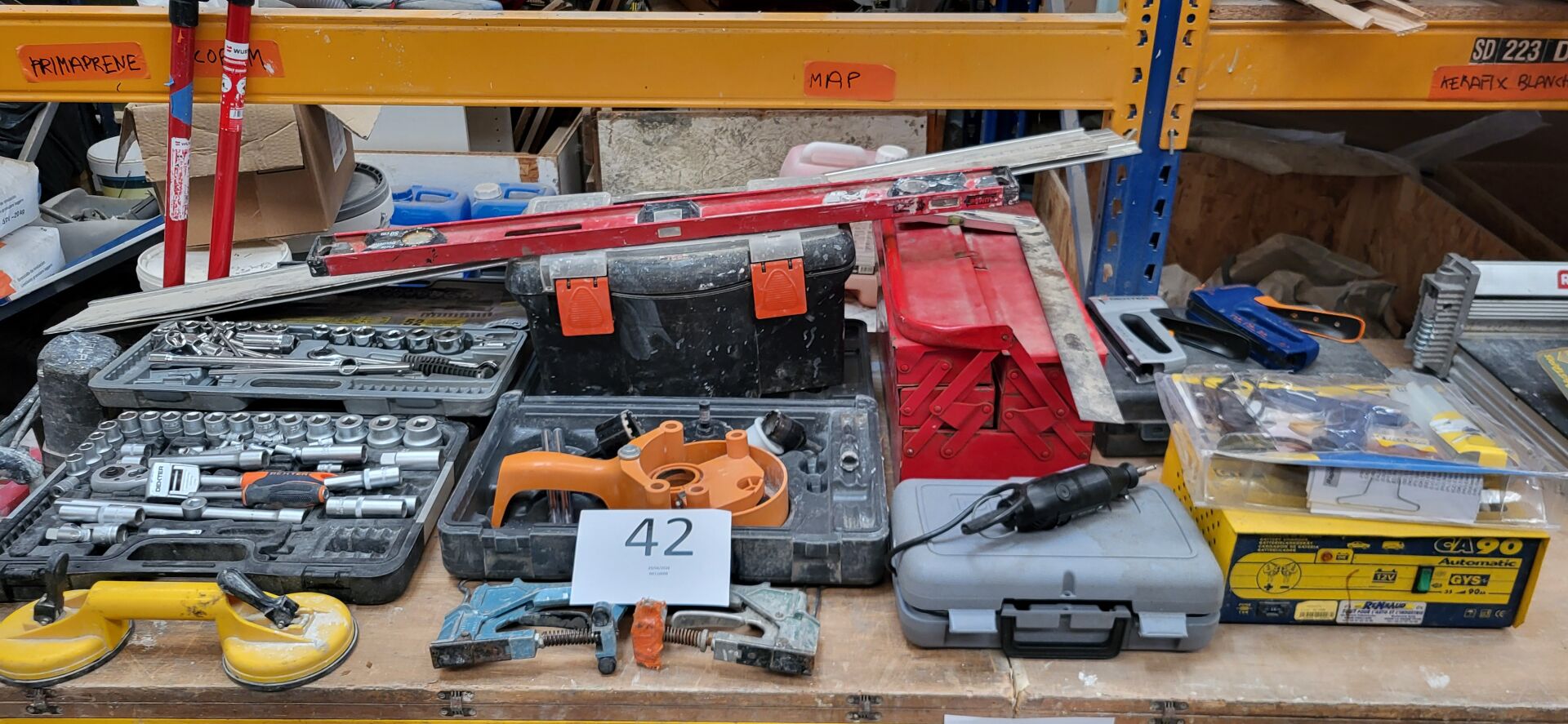 1 lot d’outillages manuels dont scies, pinces coupantes, spatules, 1 poulie 180 kg, boites...