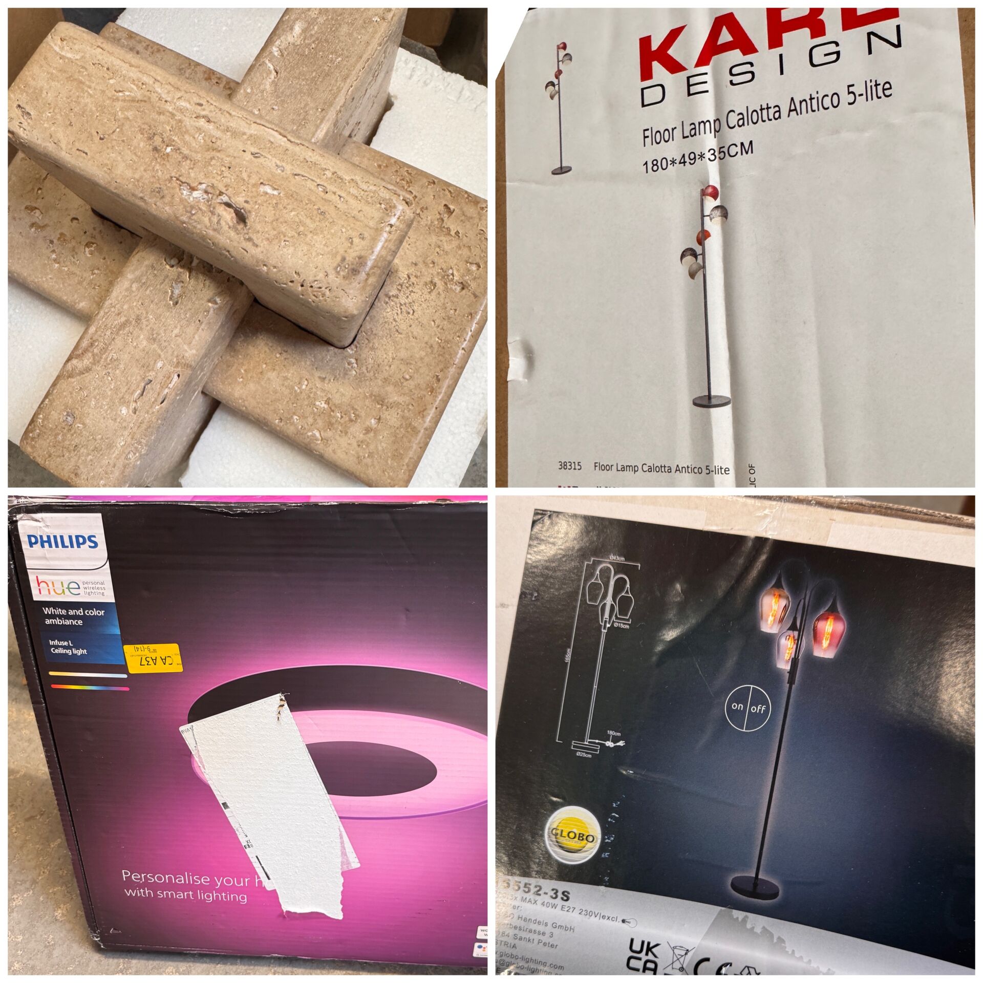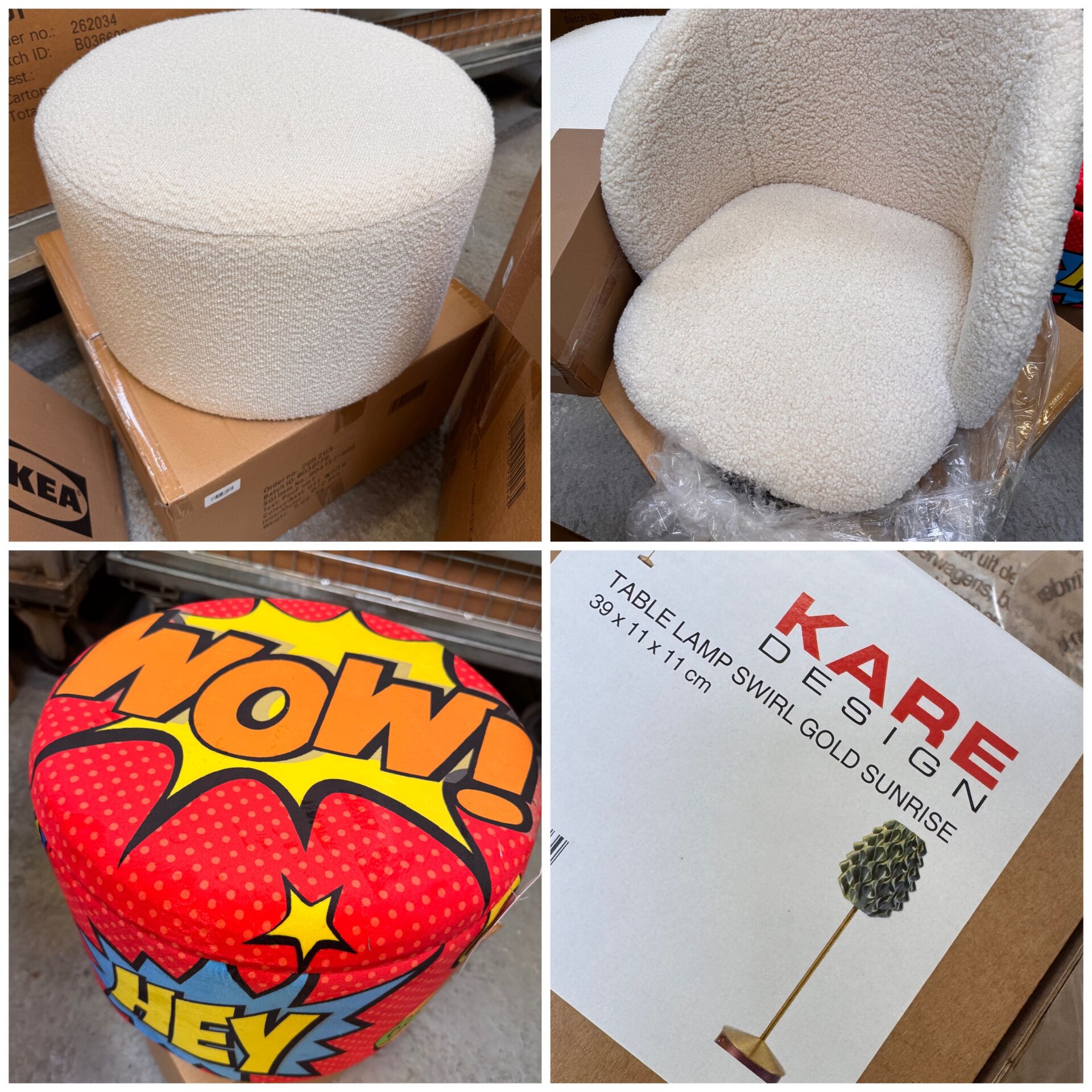 FORT ENSEMBLE DE PETITS MOBILIERS ET DECORATIONS (environ 1m3) DONT LUMINAIRES, POUF, FAUTEUIL...