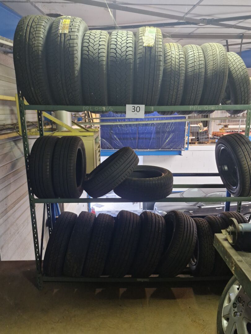 1 lot de pneus (certains neufs) dans râtelier métal (environ 28 unités)