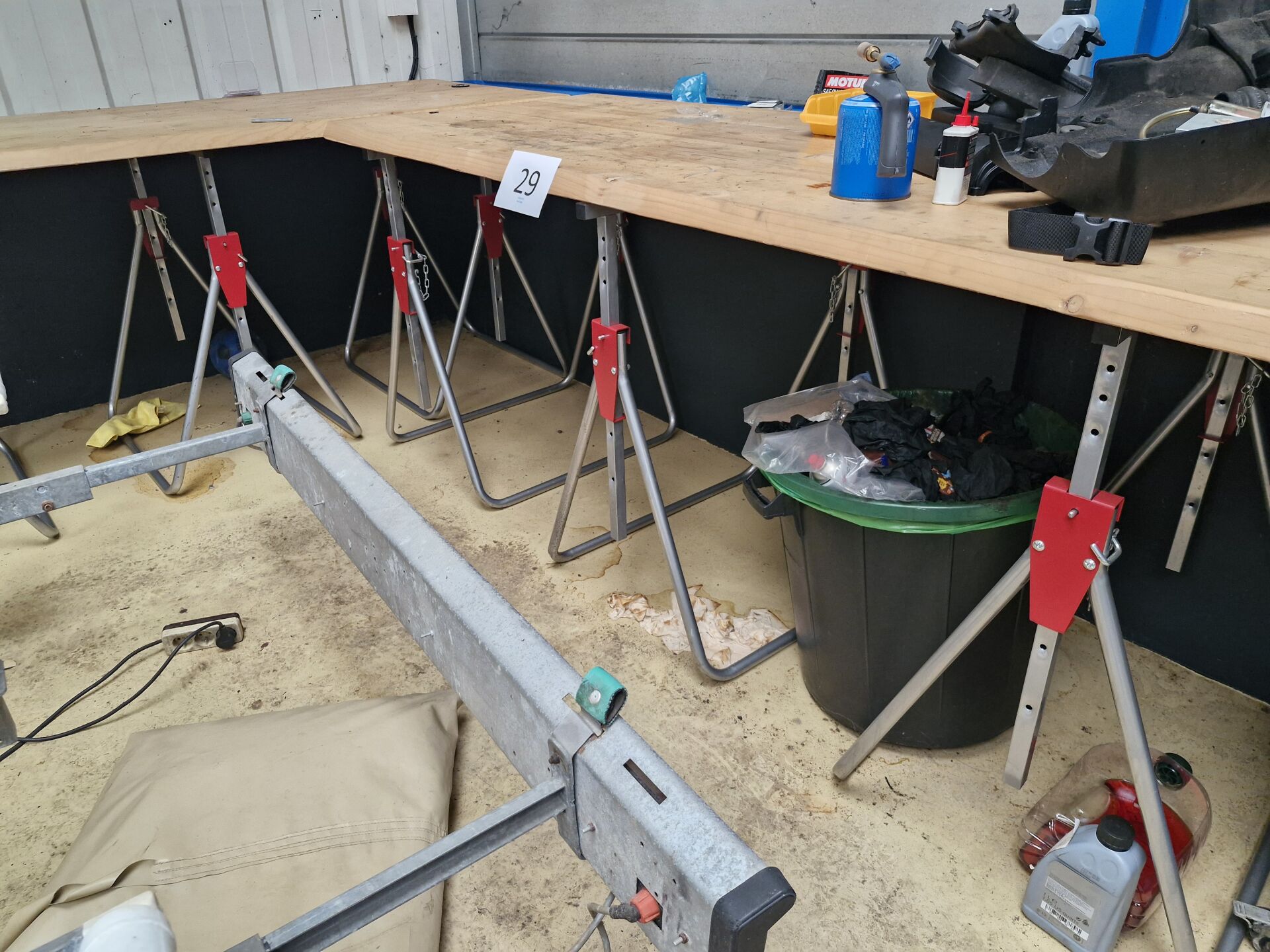 4 plateaux bois dont 3 de 220 x 85 cm posés sur 10 tréteaux métal, réglables en hauteur