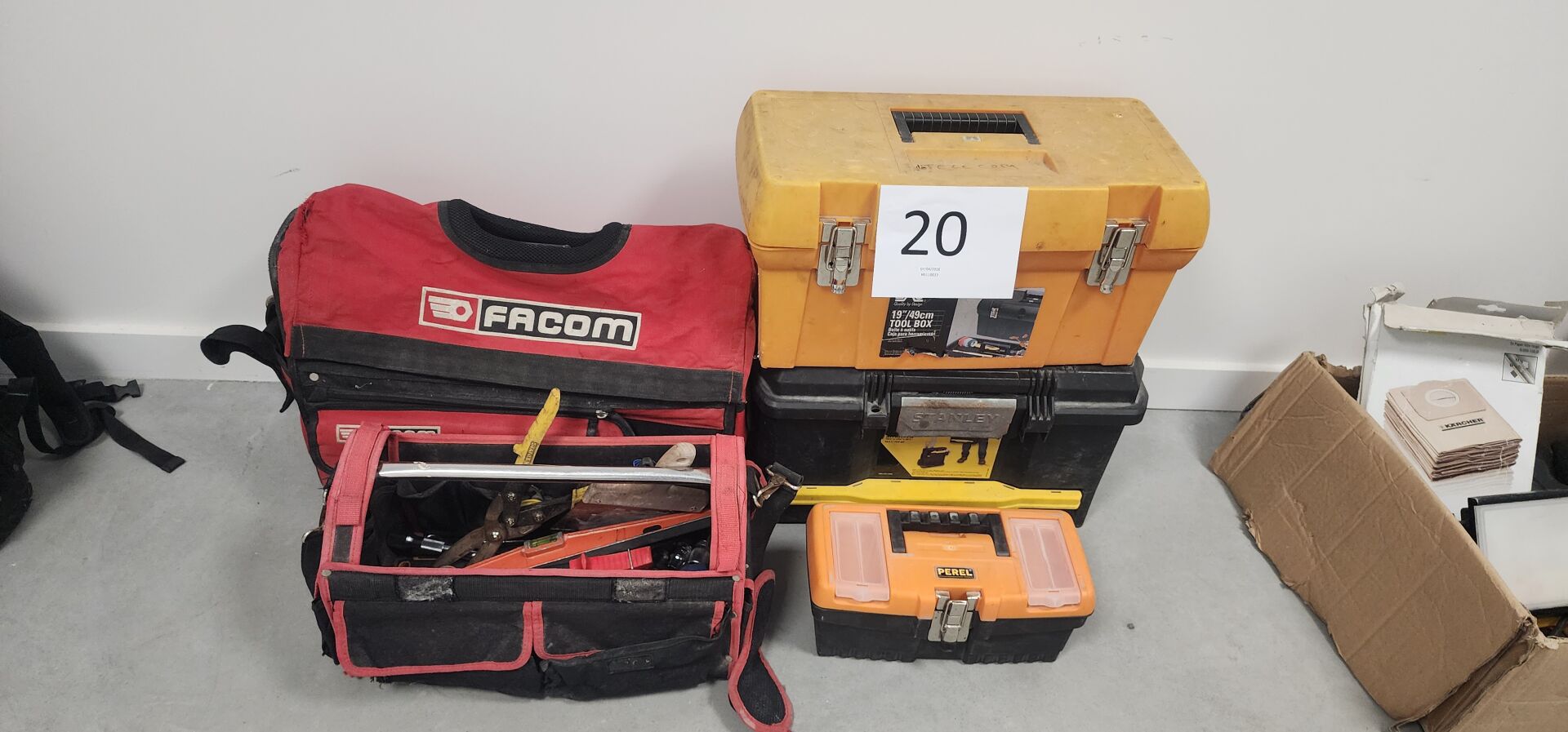 1 sacoche avec outils dont clés, pinces…, 1 petite caisse à outils PEREL