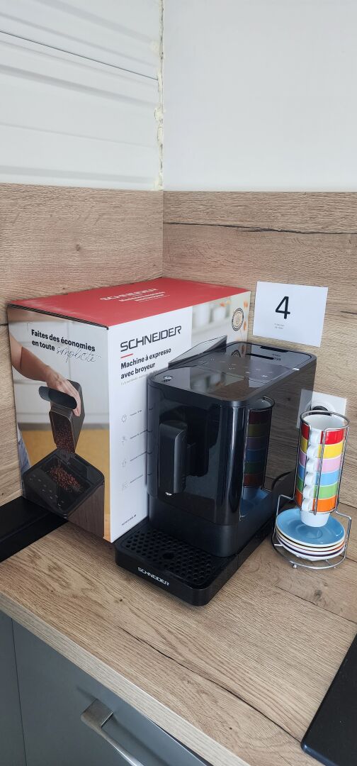 1 machine à café avec broyeur SCHNEIDER avec son carton, 6 tasses, 4 soucoupes