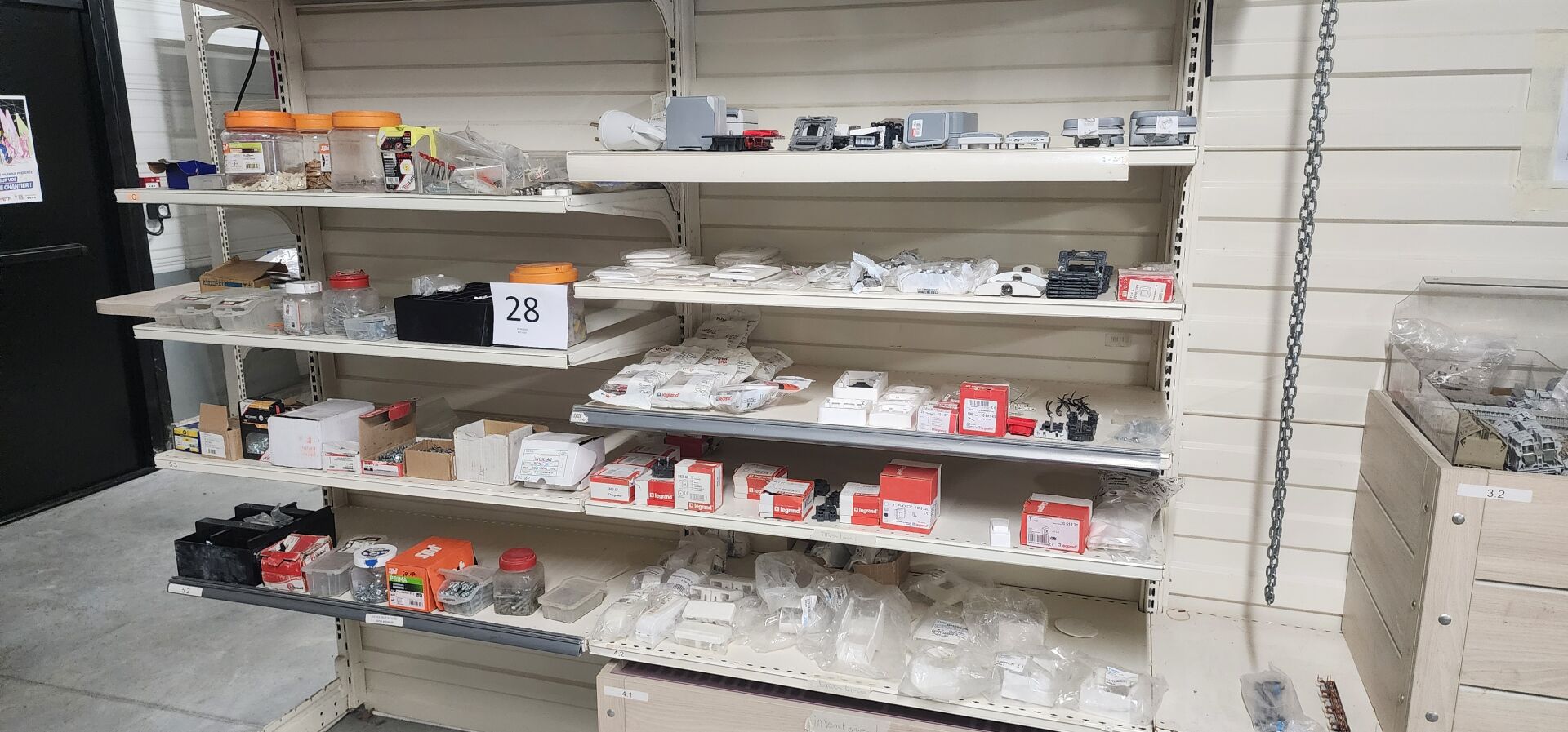 Stocks, en partie en désordre (étagères au sol) de fournitures et matériels électriques dont...