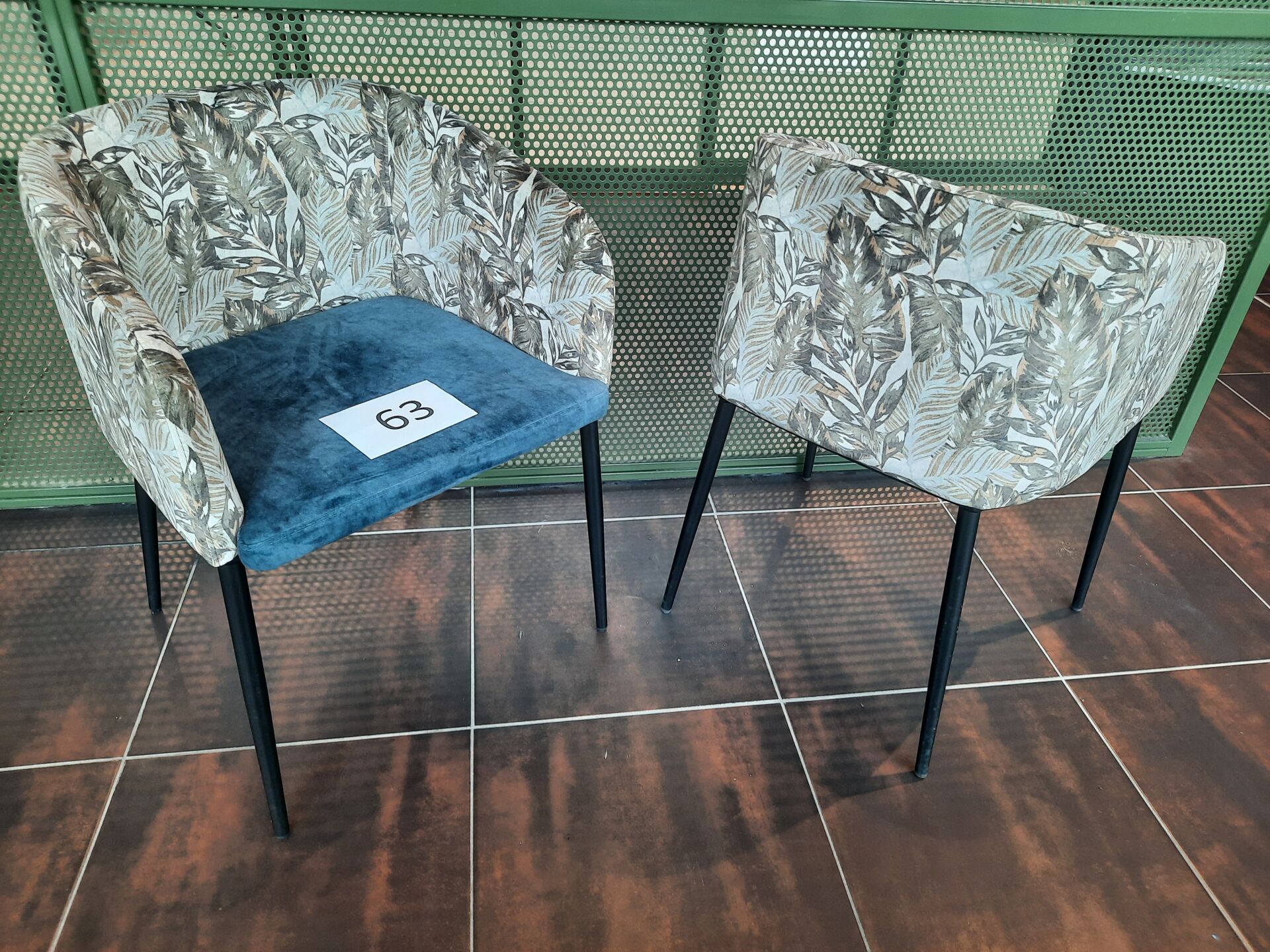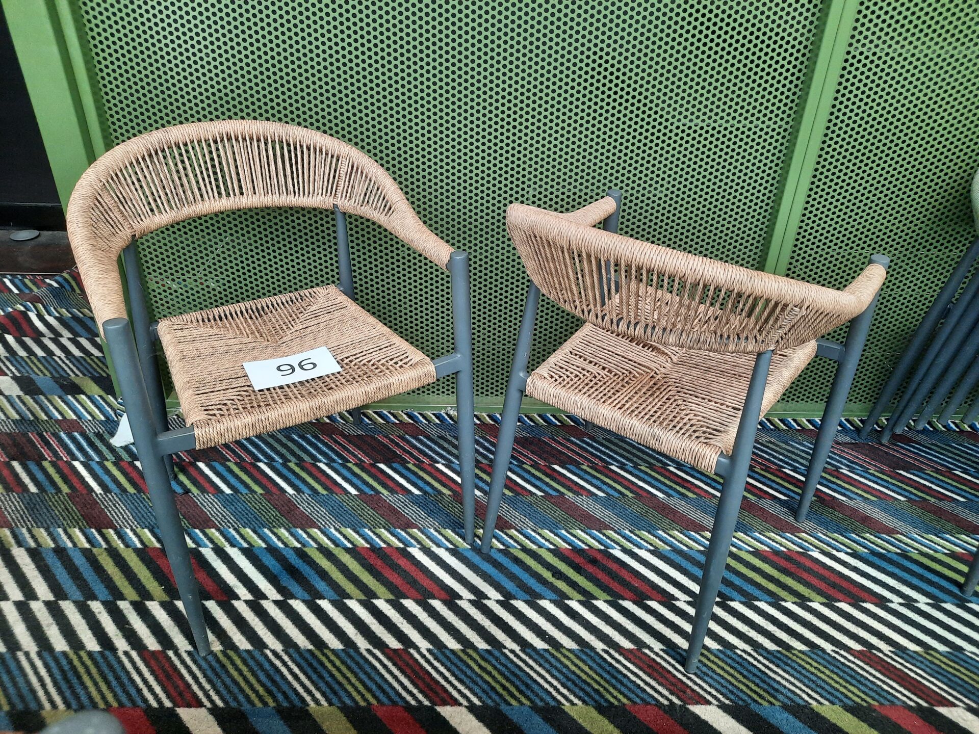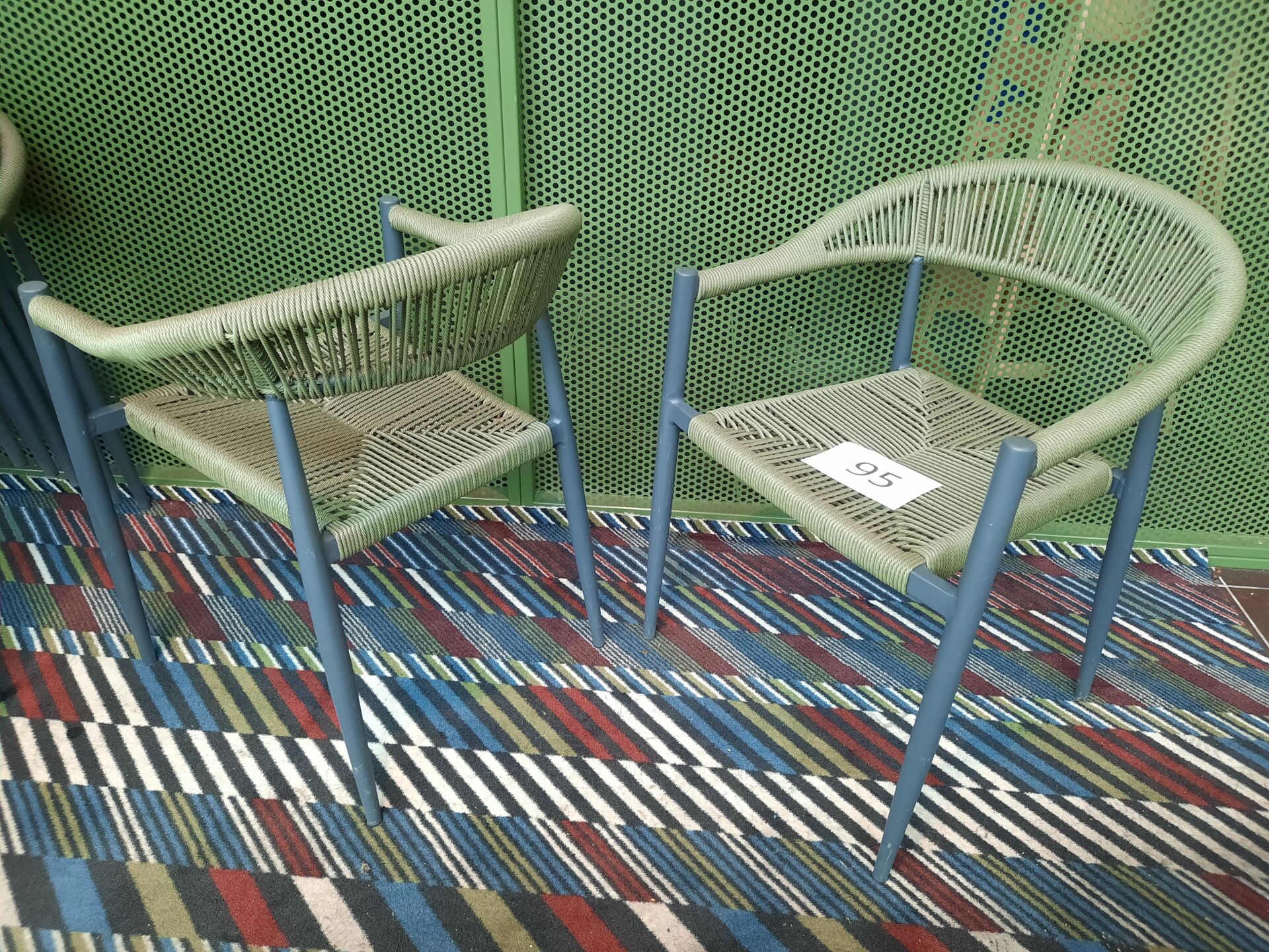 11 fauteuils de terrasse en PVC imitation tressé vert et piètement métal laqué gris