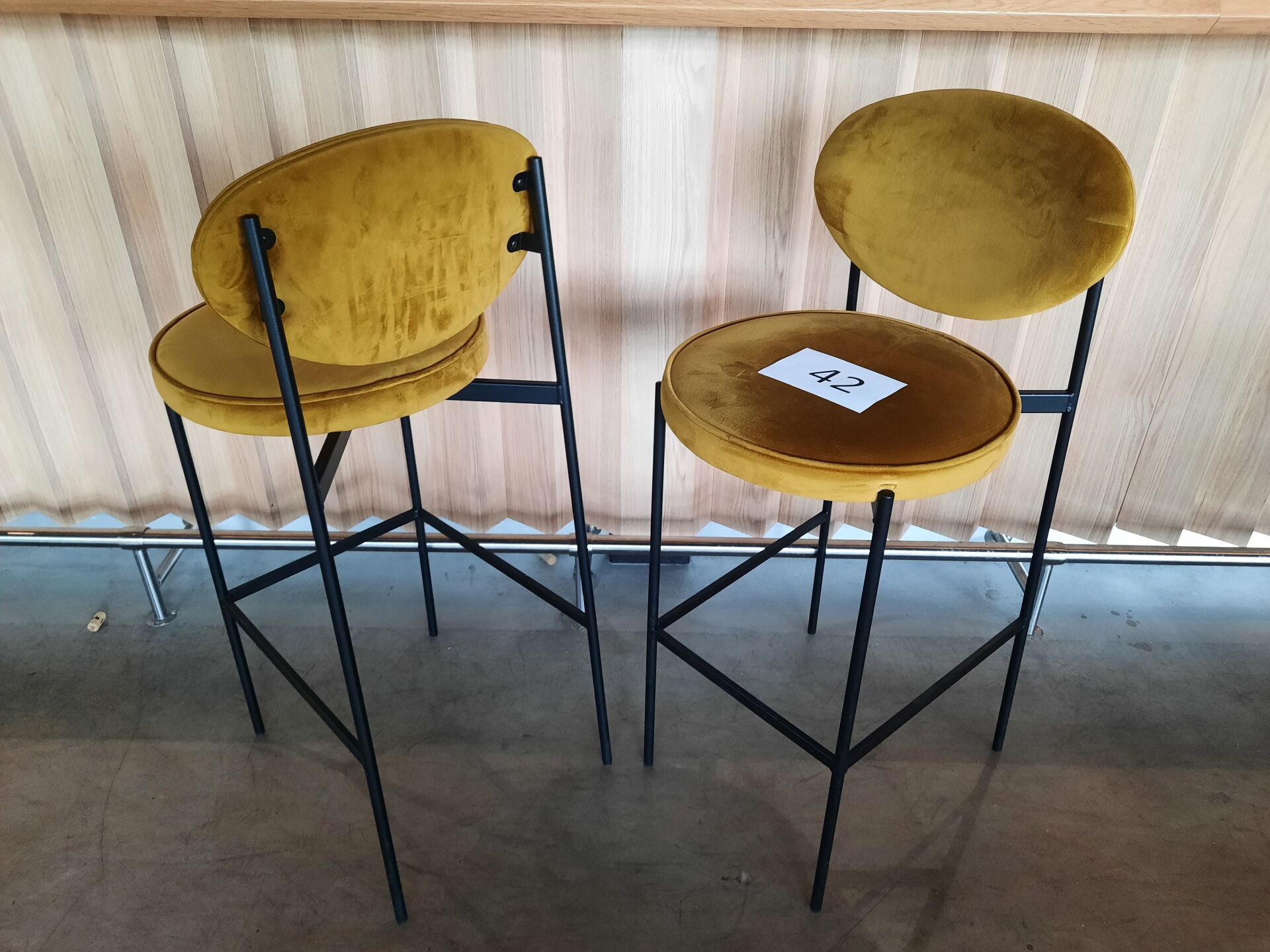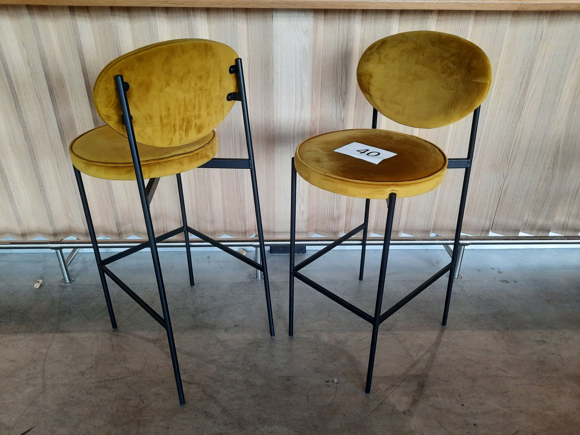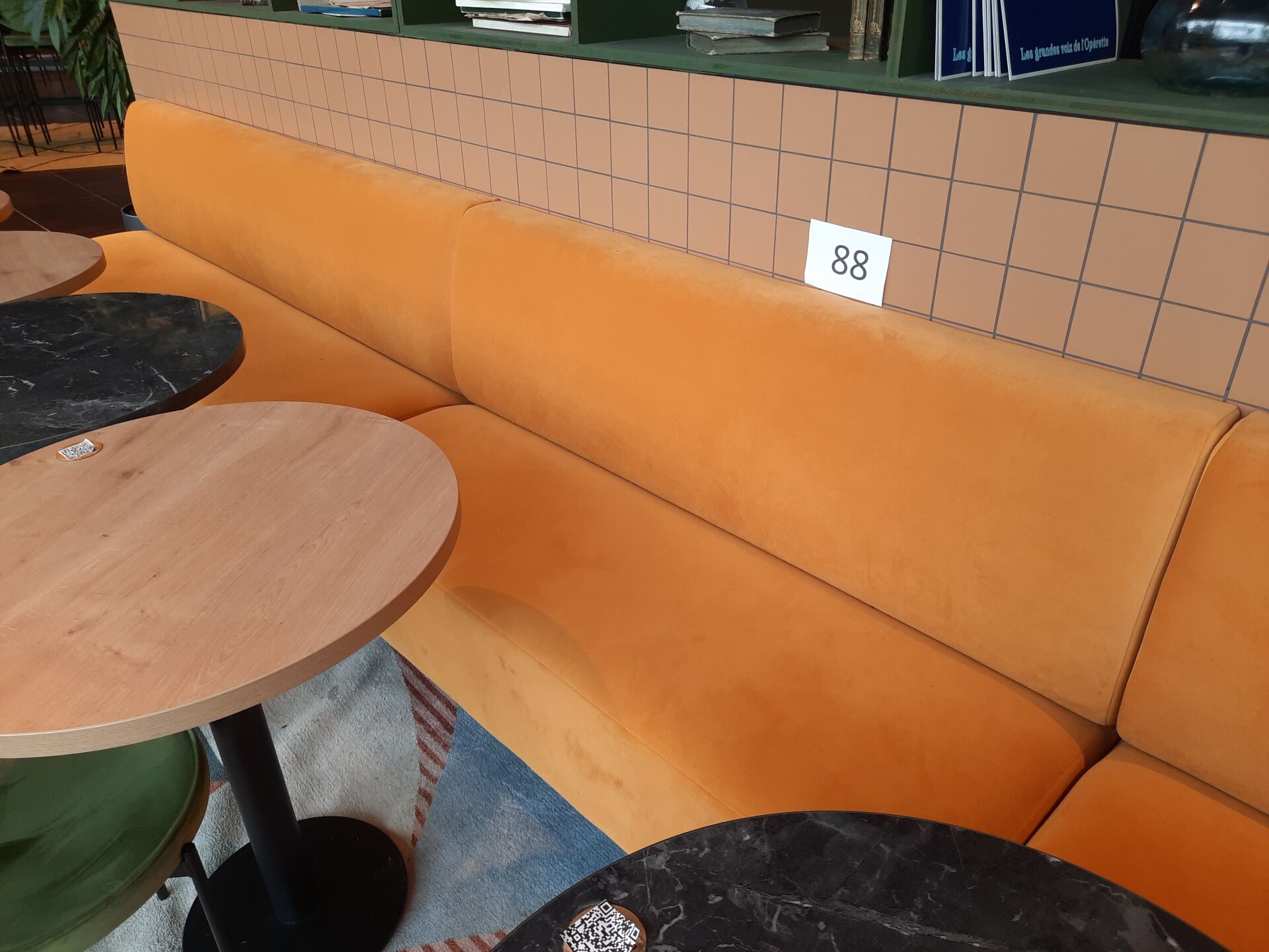 3 banquettes assise tissu moutarde (dont 2 de 200×60 cm et 1 de 148×60 cm)