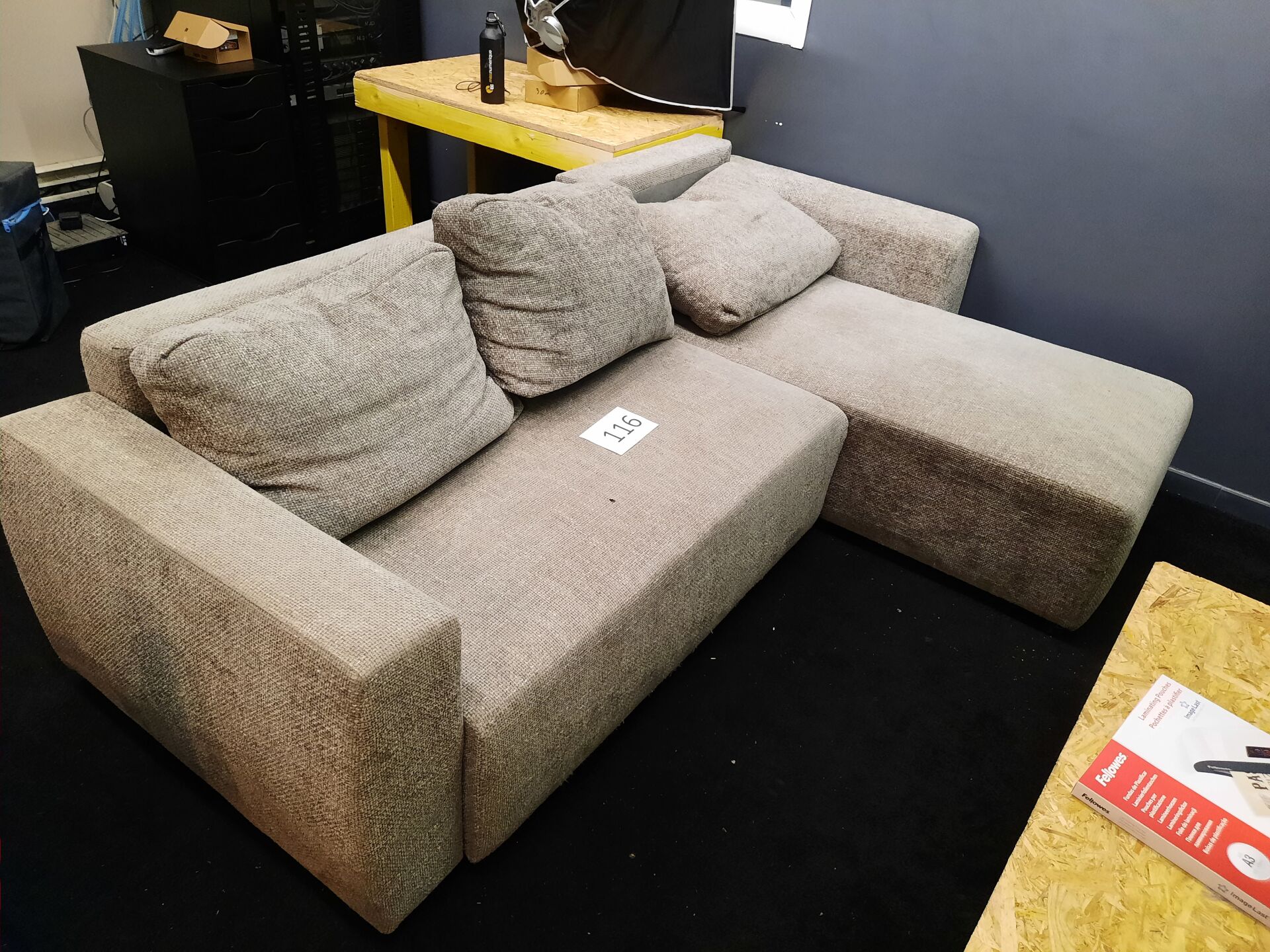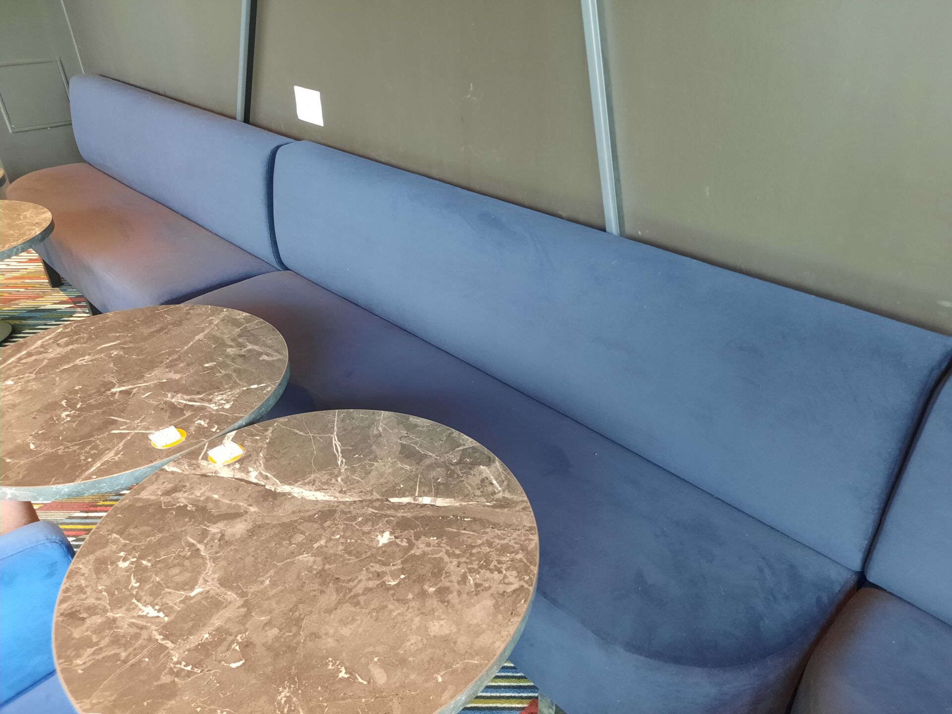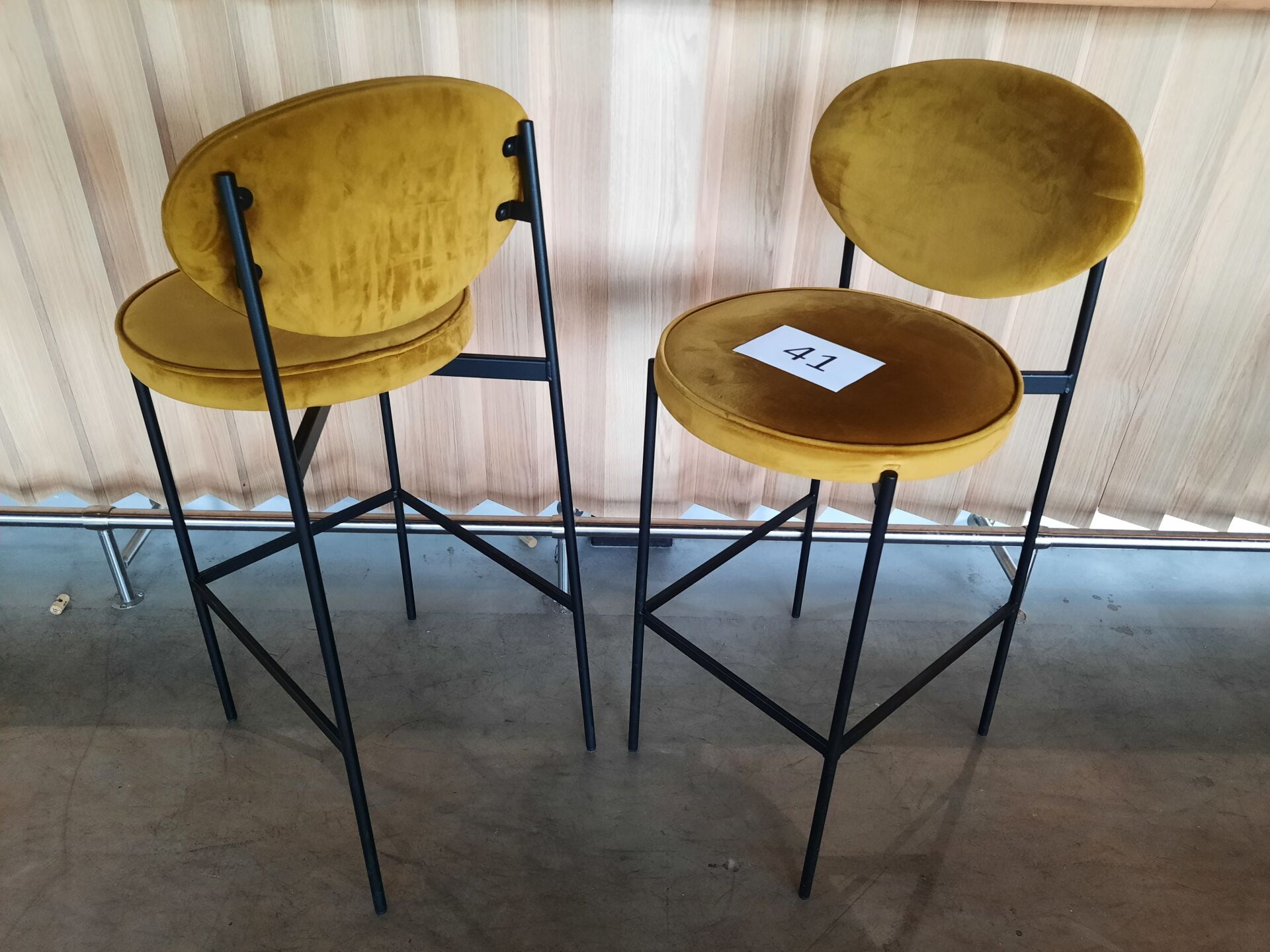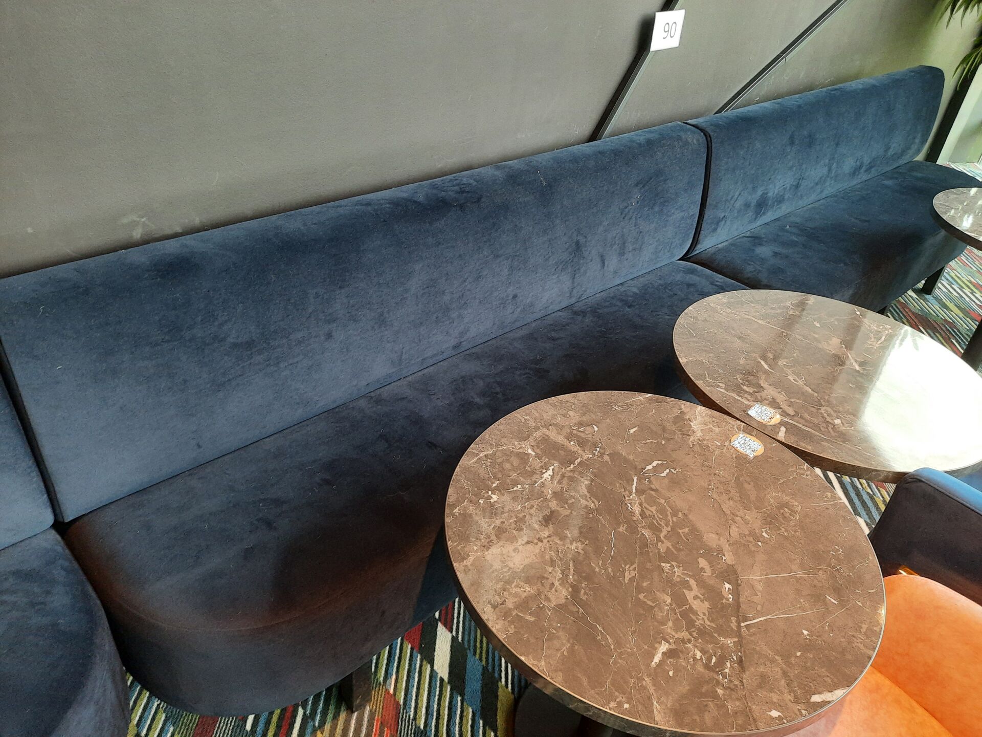 3 banquettes assise tissu moutarde (dont 2 de 200×60 cm et 1 de 148×60 cm)
