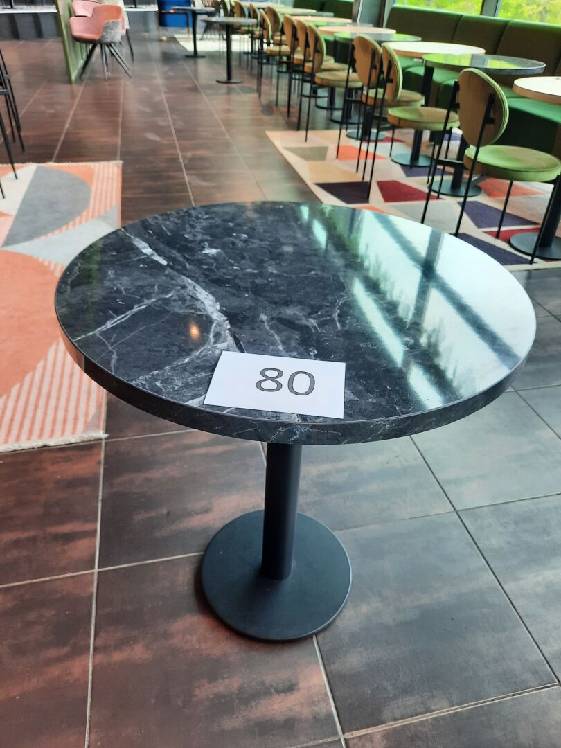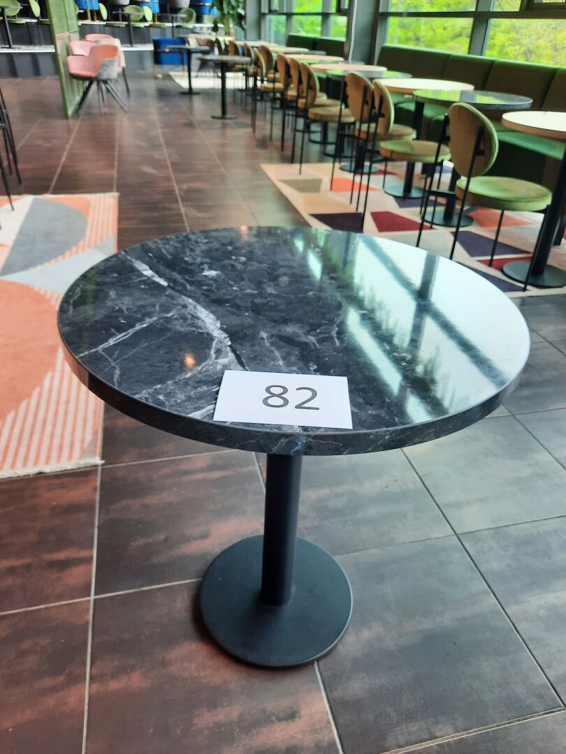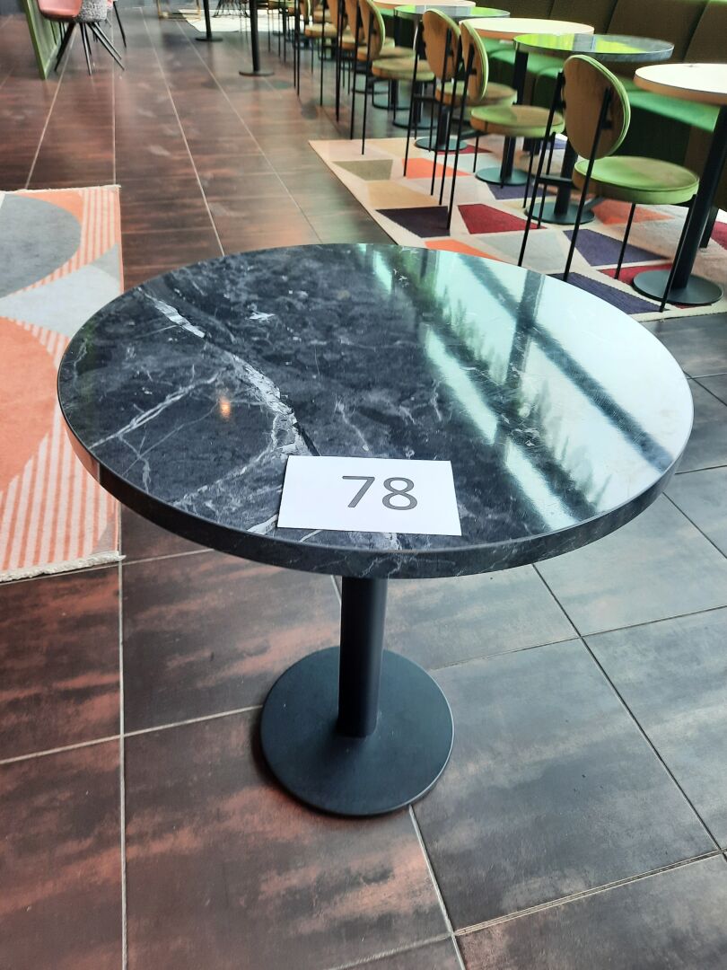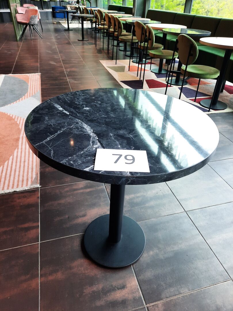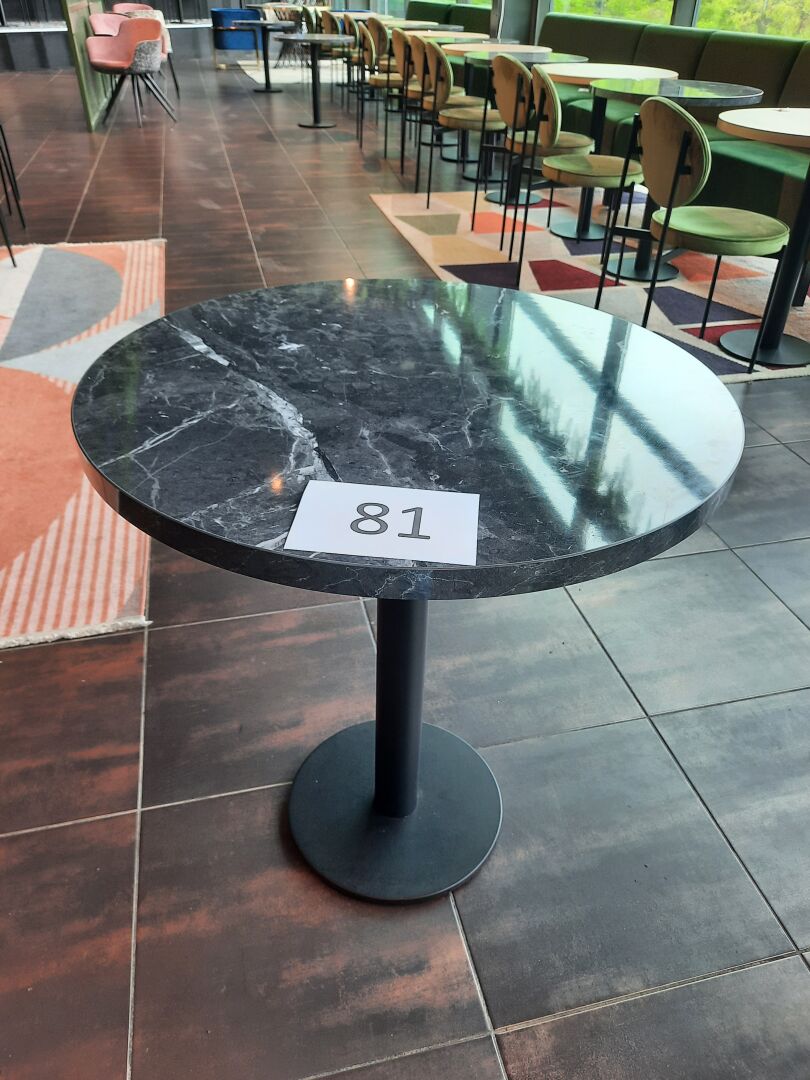 6 tables rondes (70 cm), piètement en métal laqué noir, plateau mélaminé façon marbre, gris...