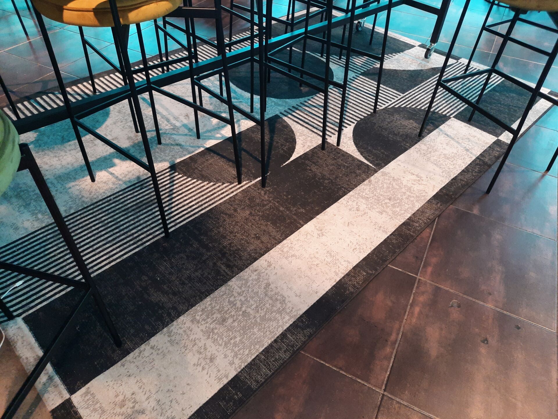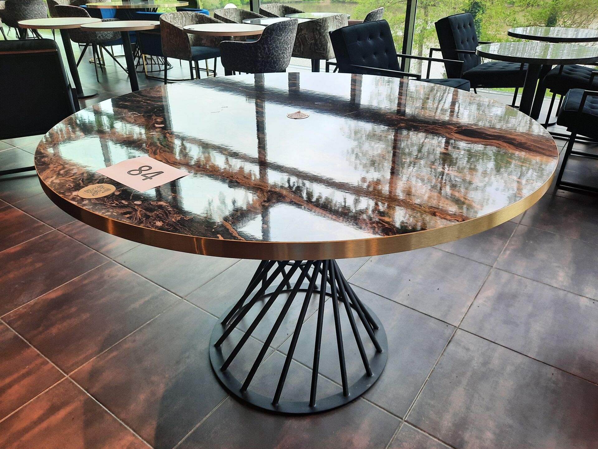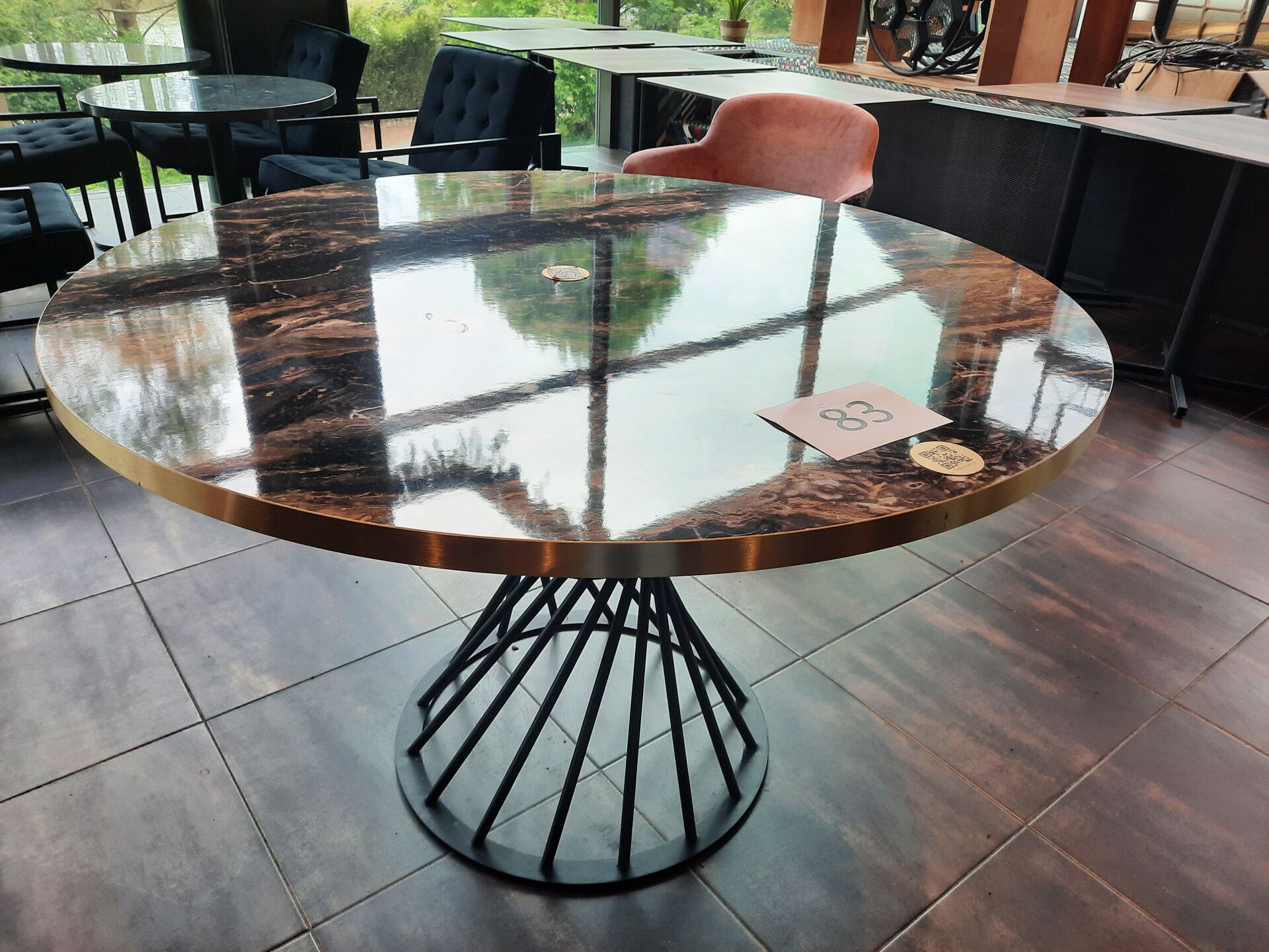6 tables rondes (70 cm), piètement en métal laqué noir, plateau mélaminé façon marbre, gris...