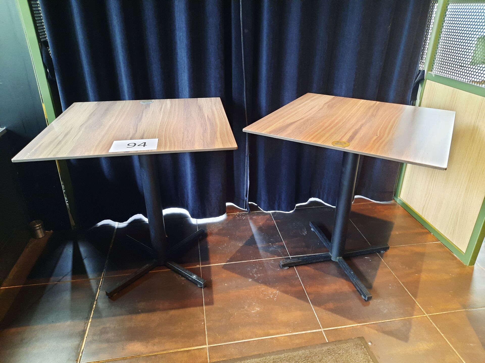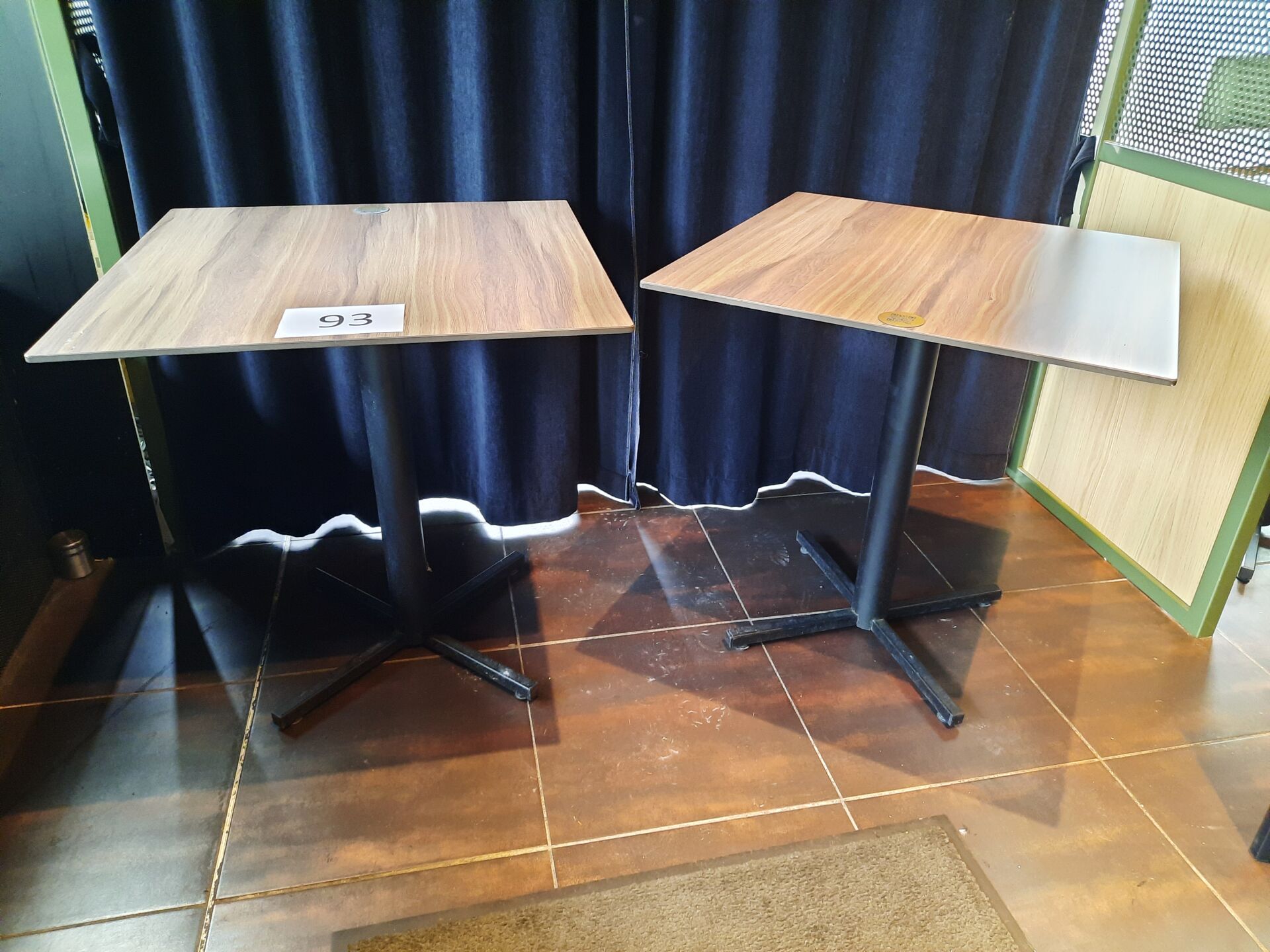 8 tables carrées en métal laqué noir et mélaminé façon bois (70 x 70 cm)