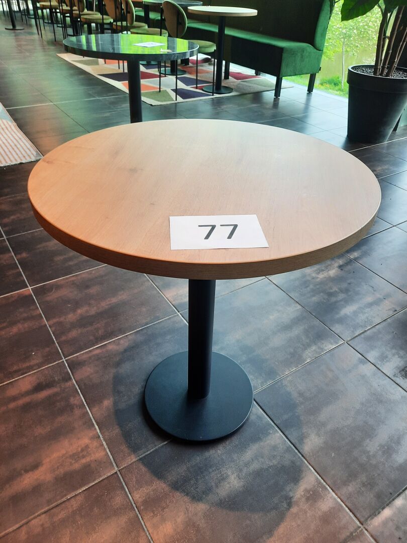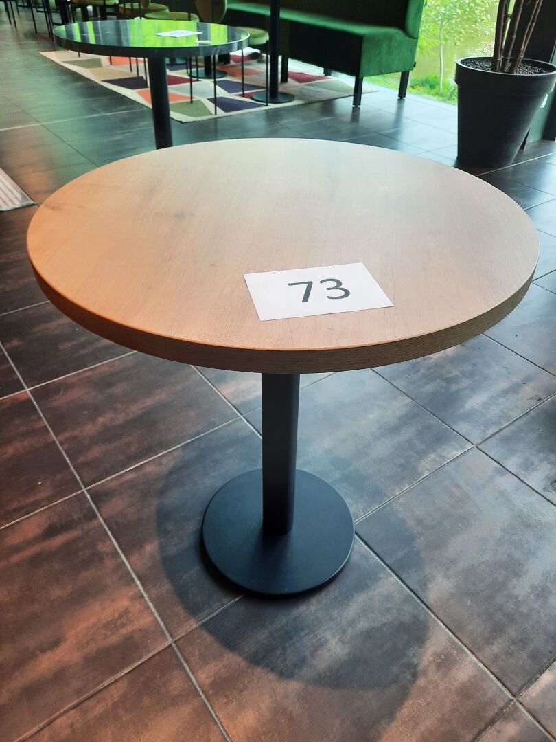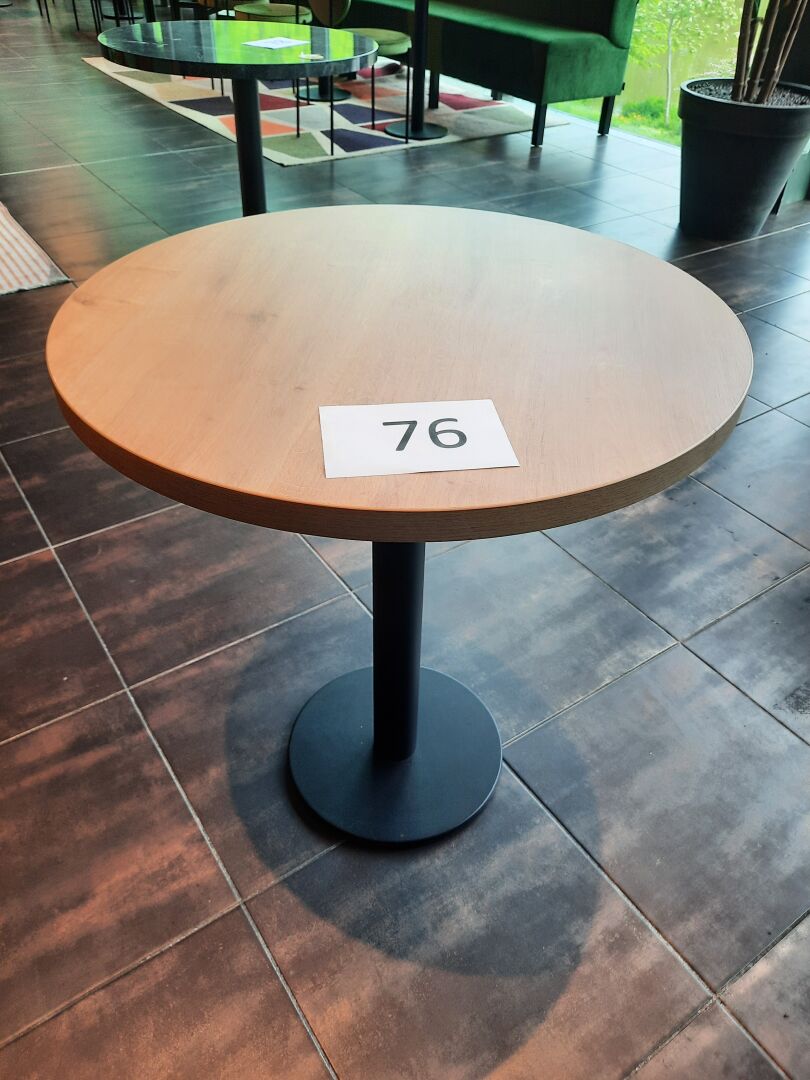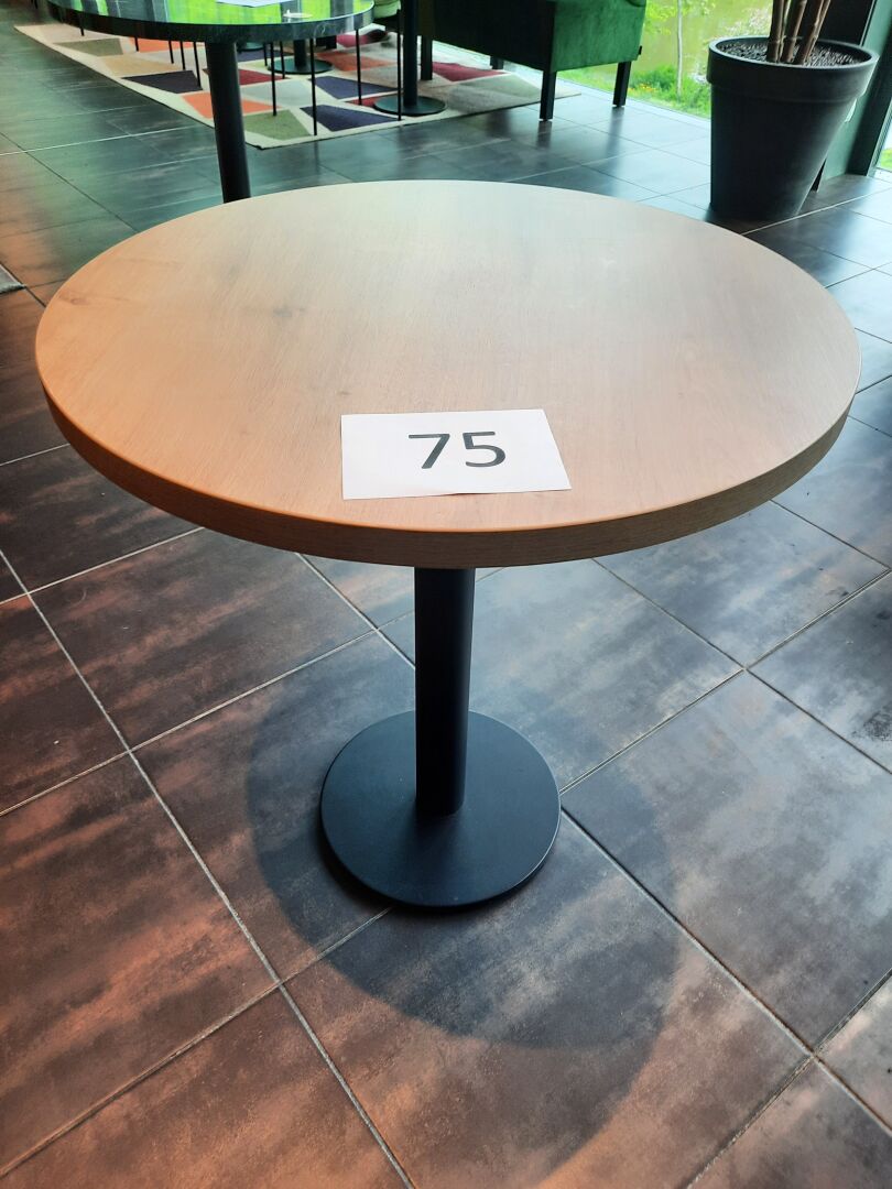 6 tables rondes (70 cm), piètement en métal laqué noir, plateau mélaminé façon bois