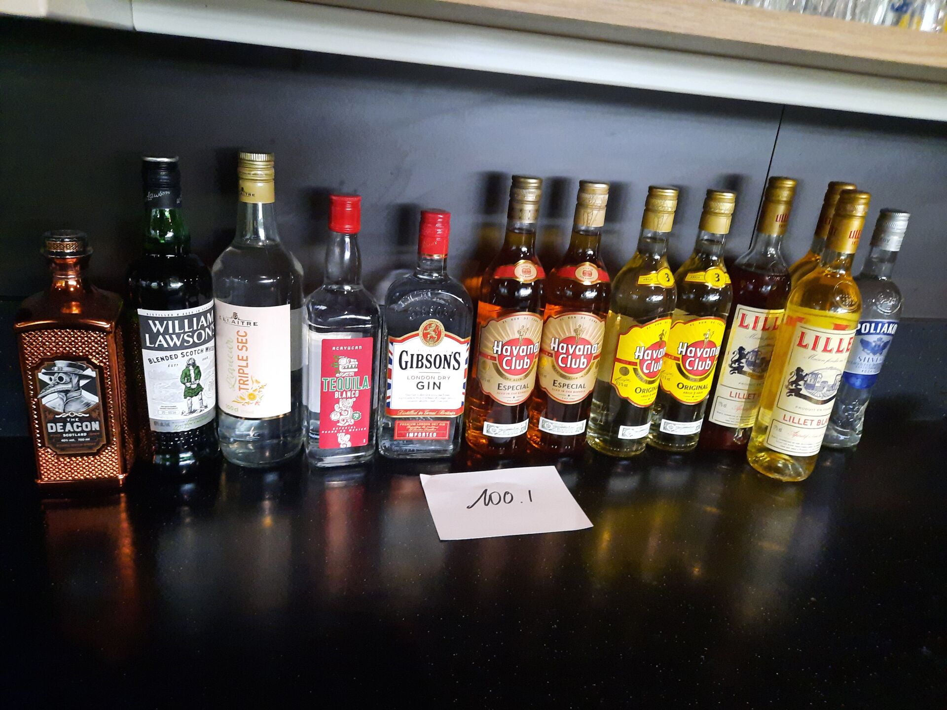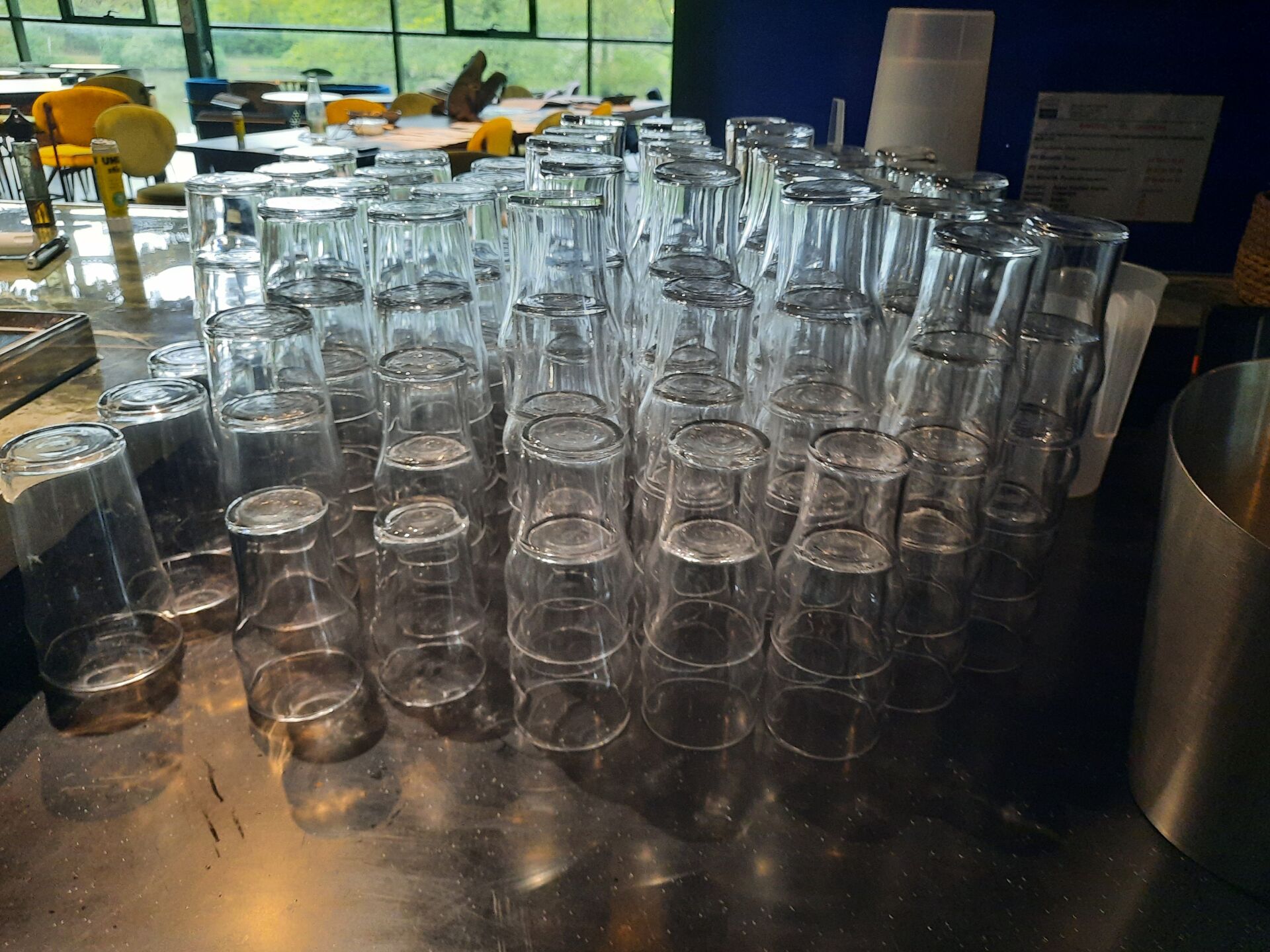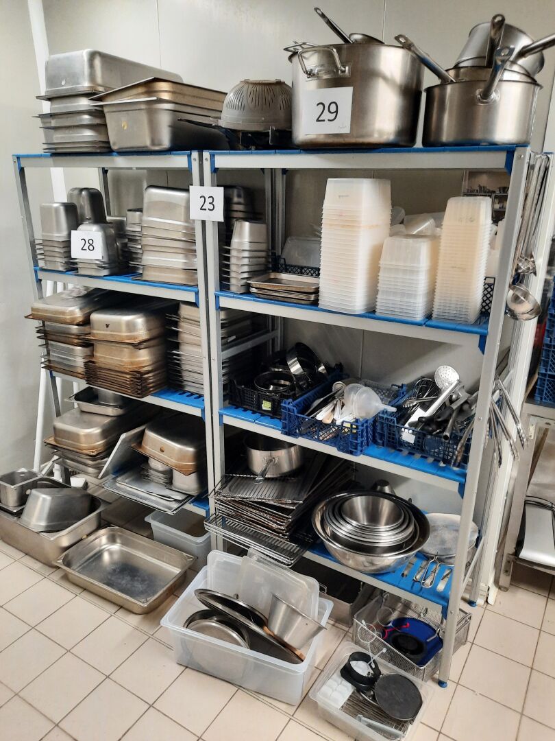 Ensemble de verrerie et couverts répartis dans la salle et la cuisine composé de :
