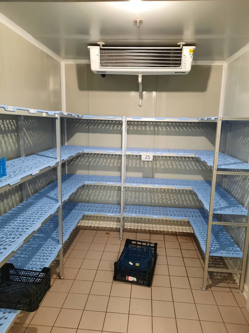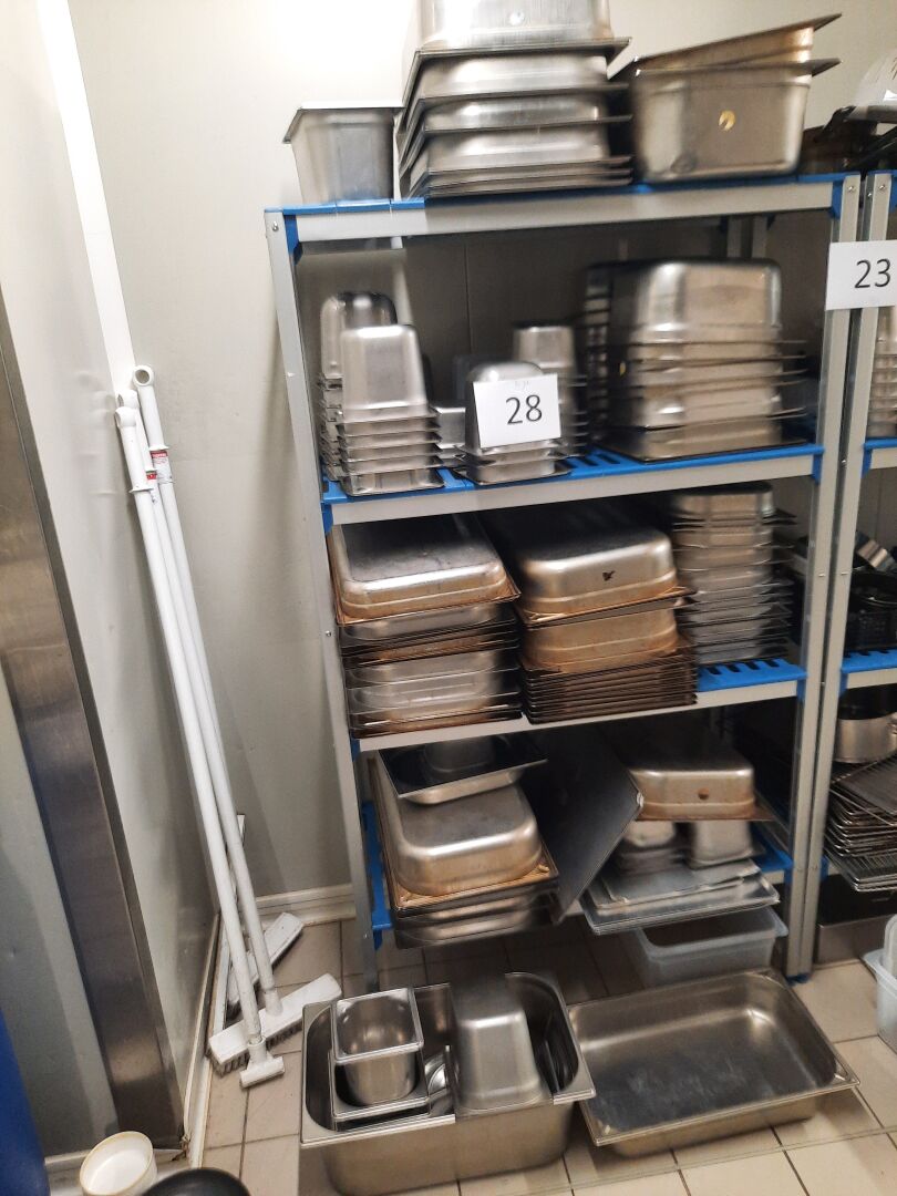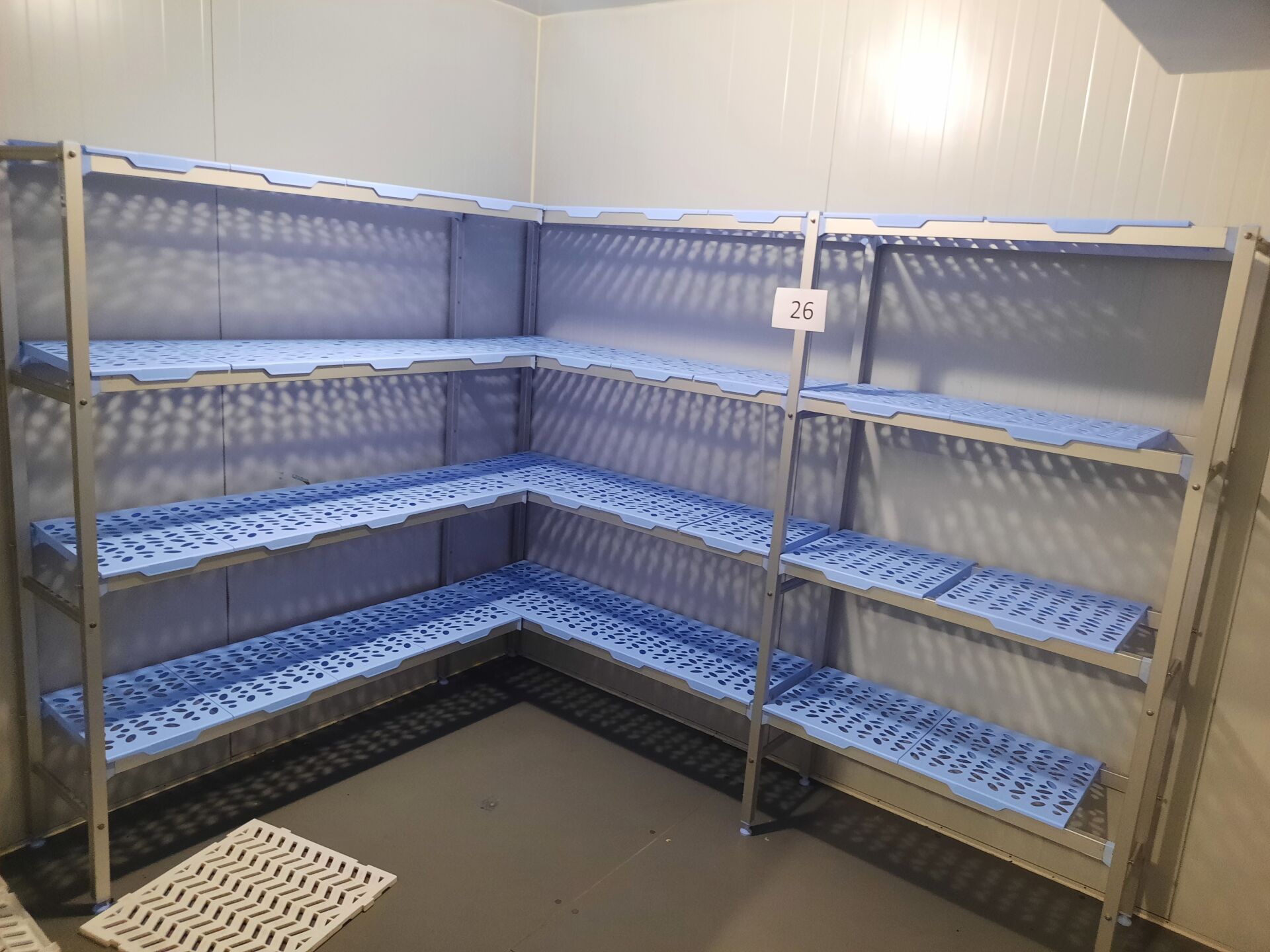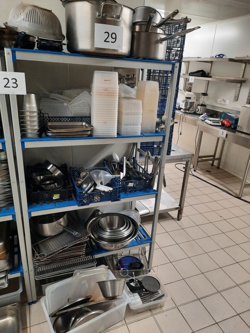Rayonnage alimentaire formant L en aluminium à clayettes en pvc bleu sans marque ni modèle...