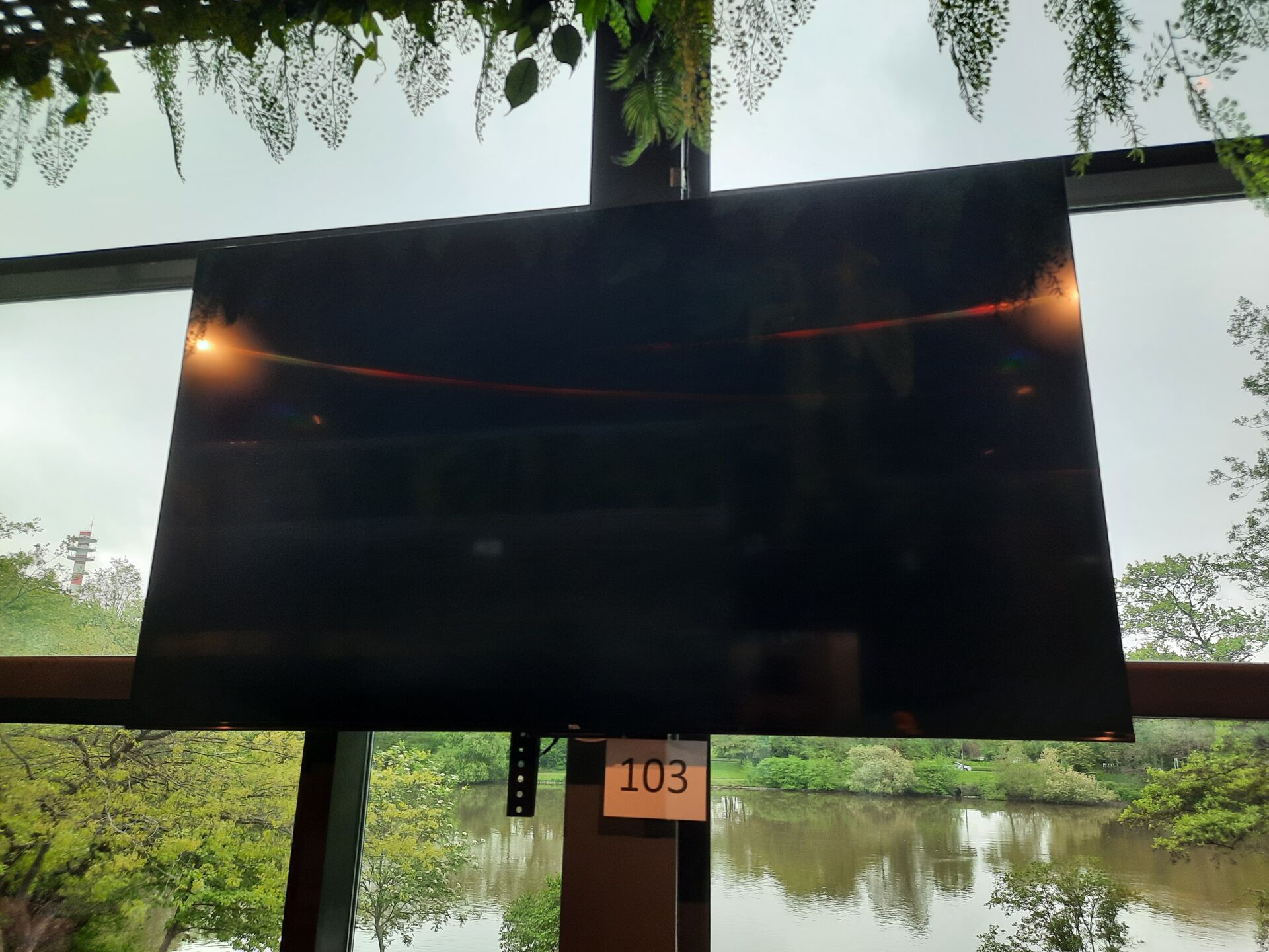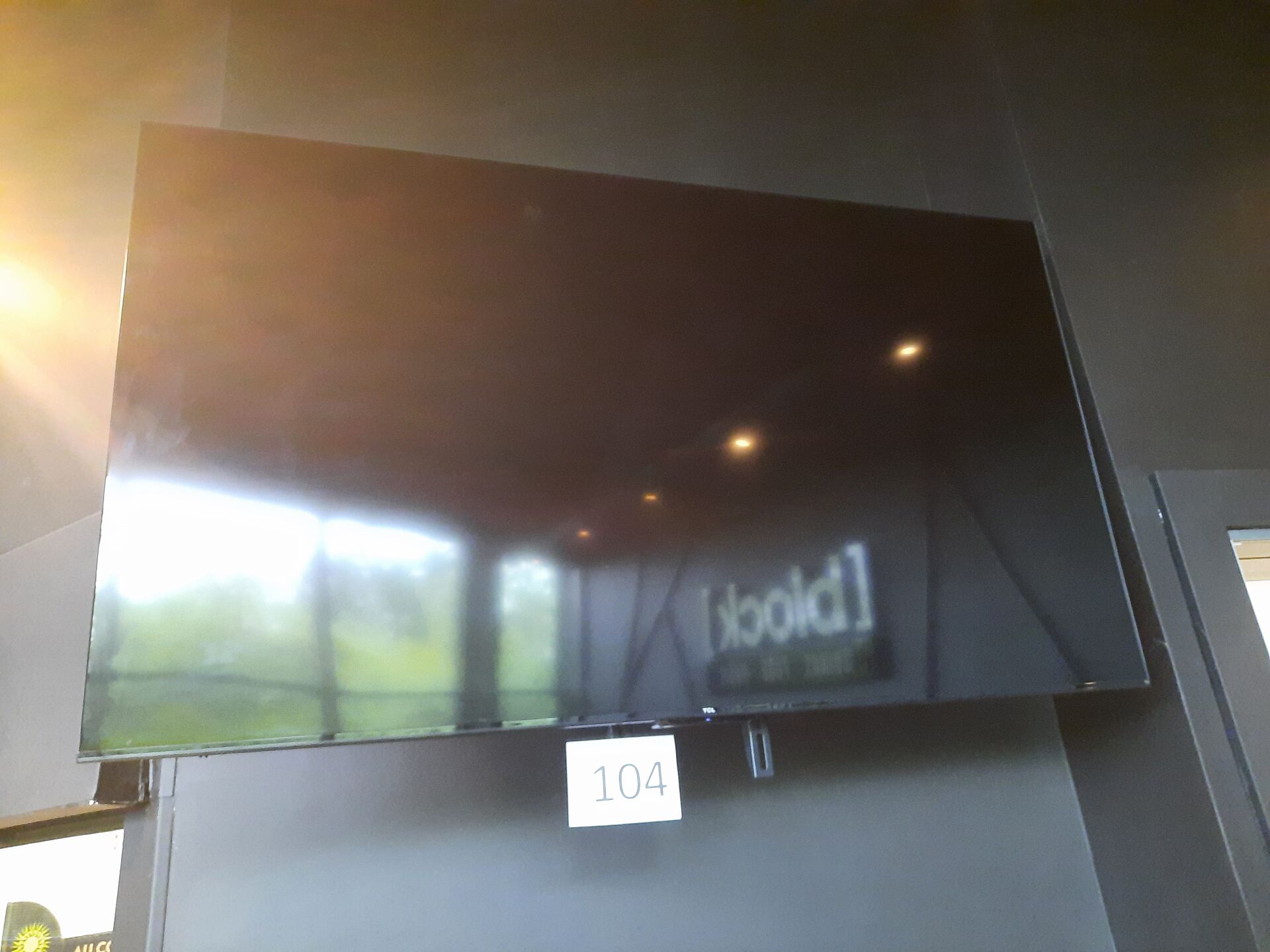 Téléviseur TCL sans modèle apparent en applique (environ 166 cm), télécommande