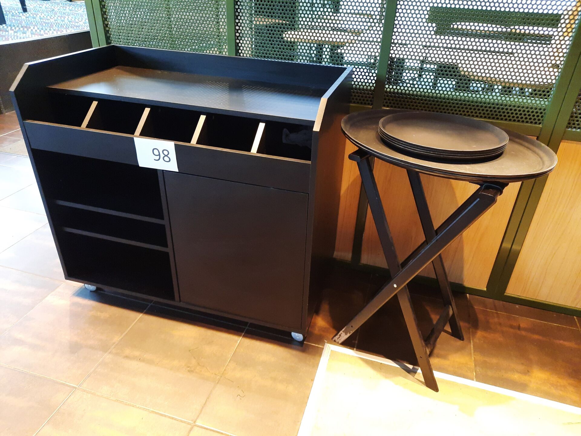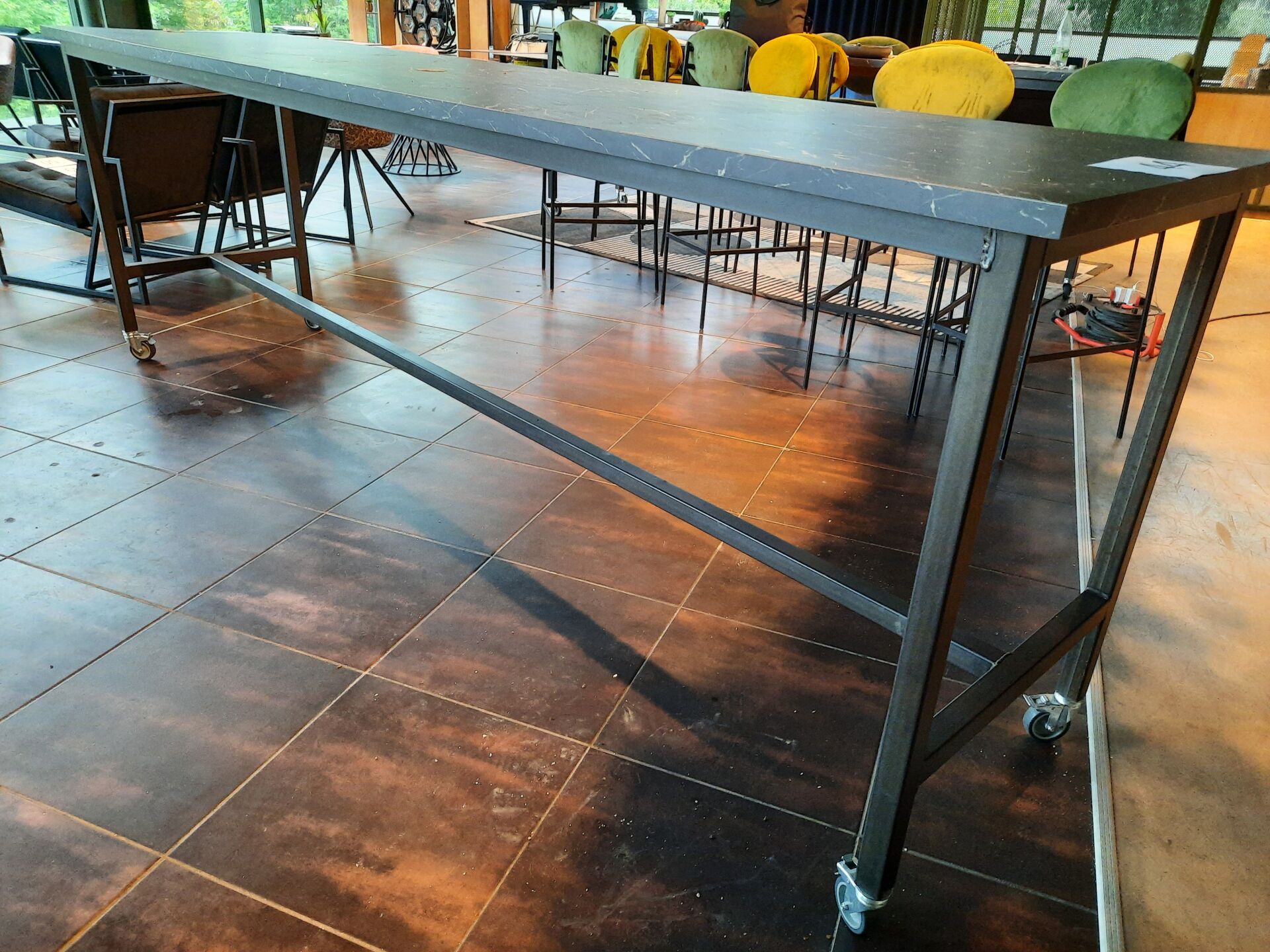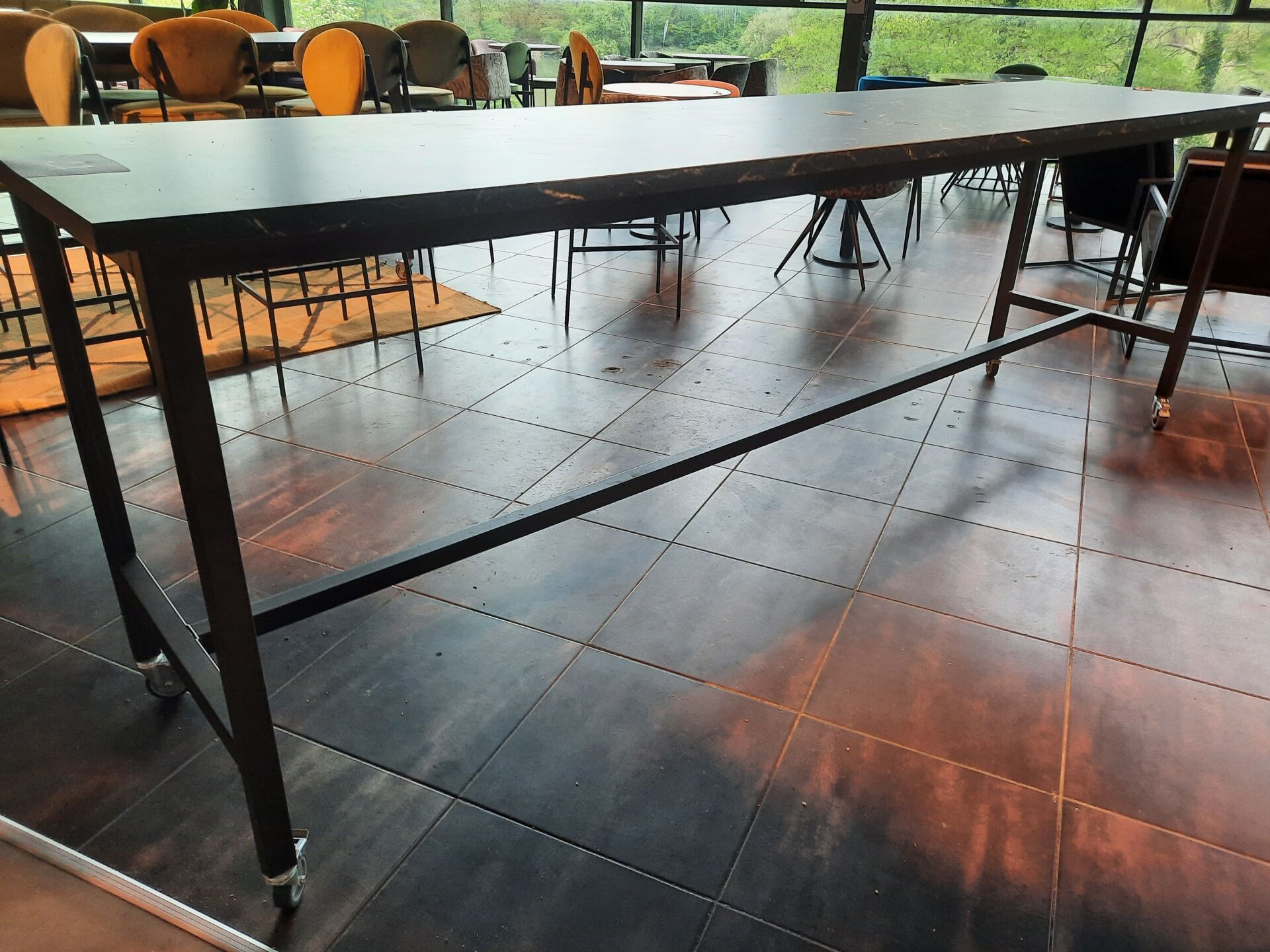 Table haute rectangulaire roulante, plateau façon marbre, 12 couverts piètement métal laqué...