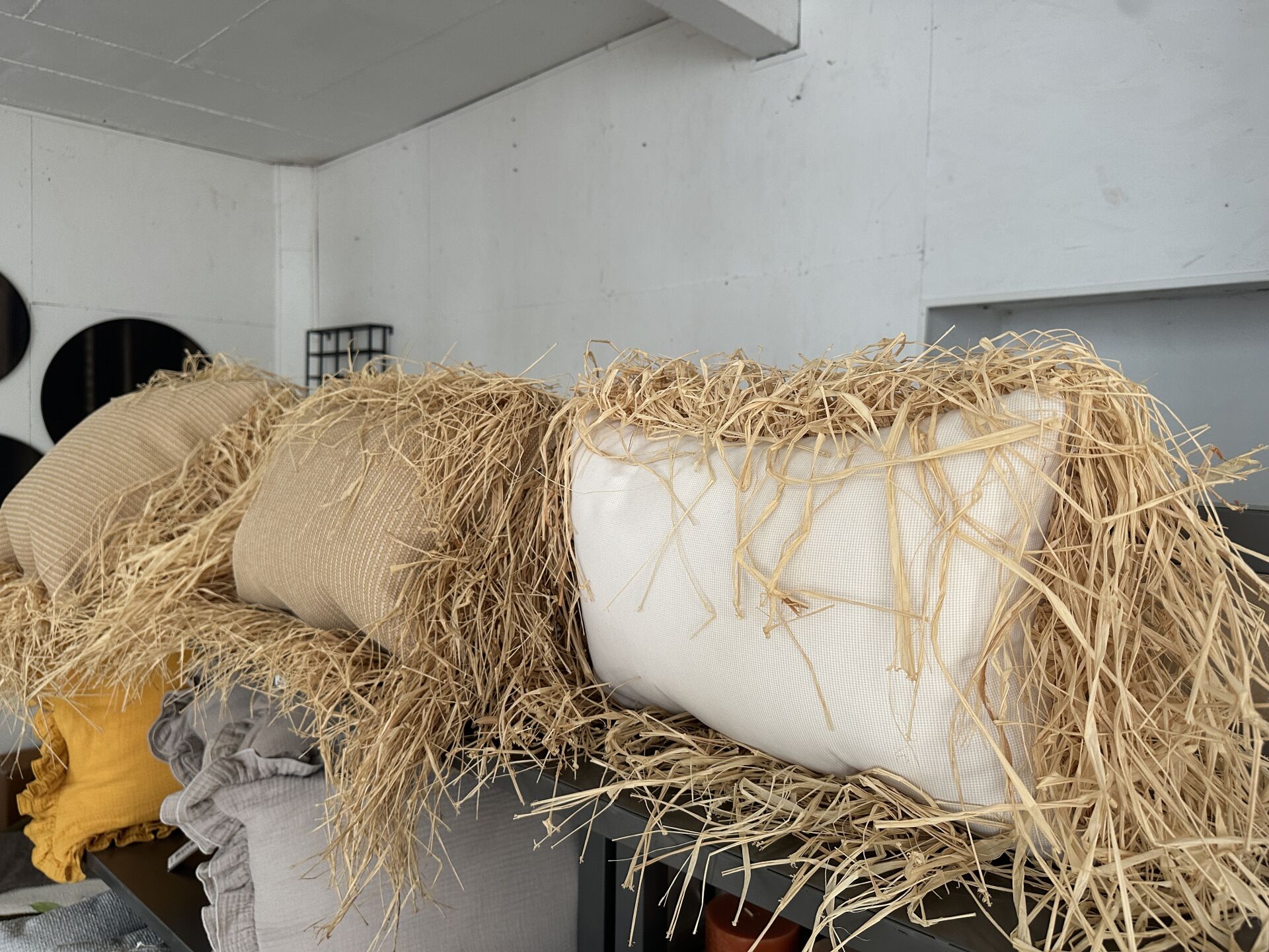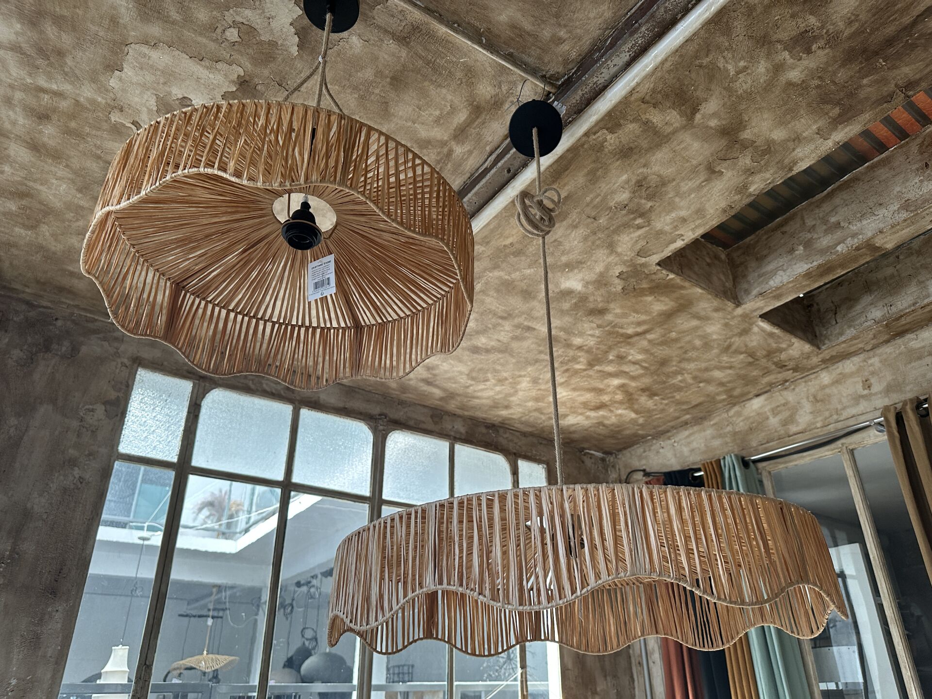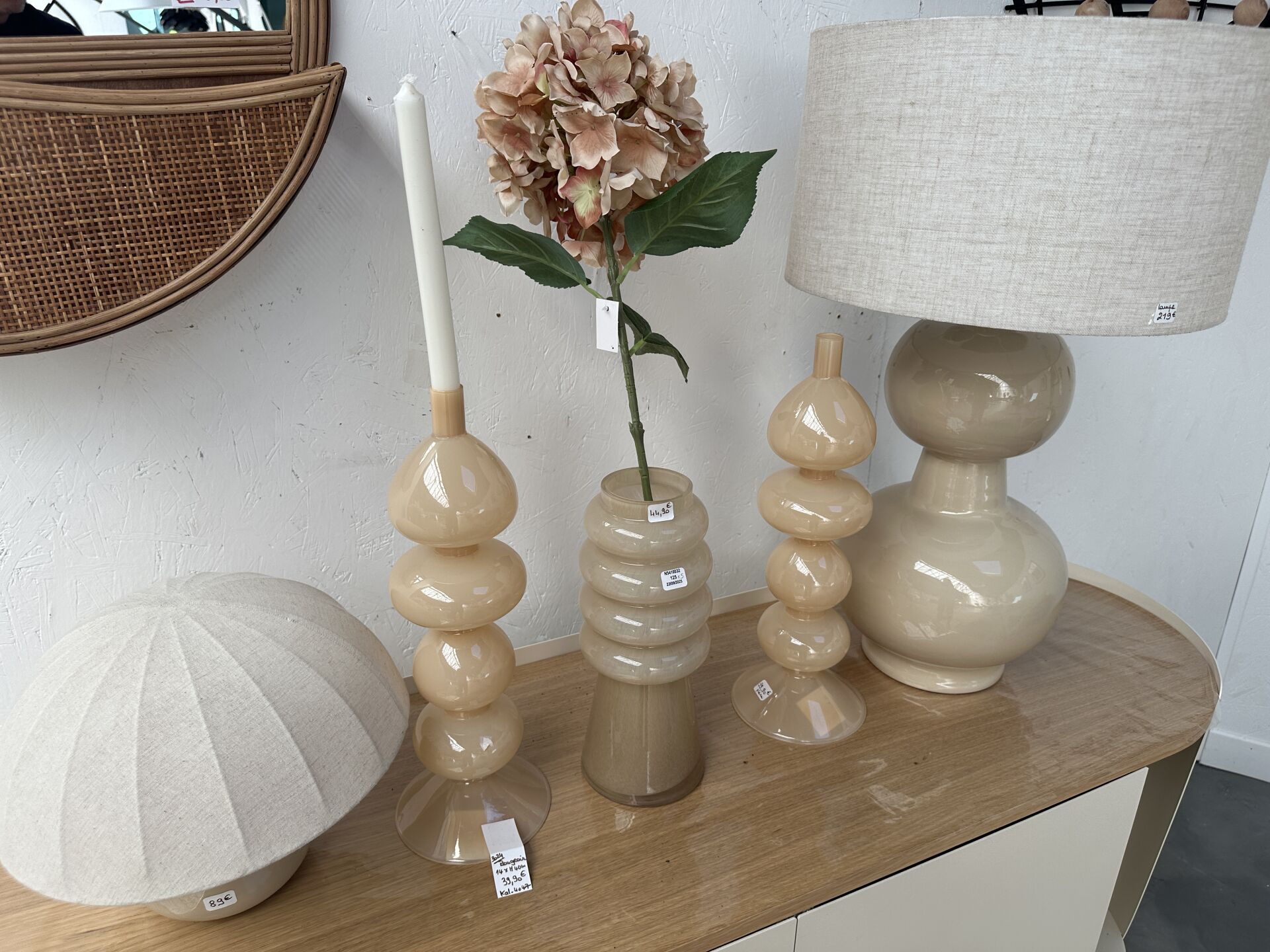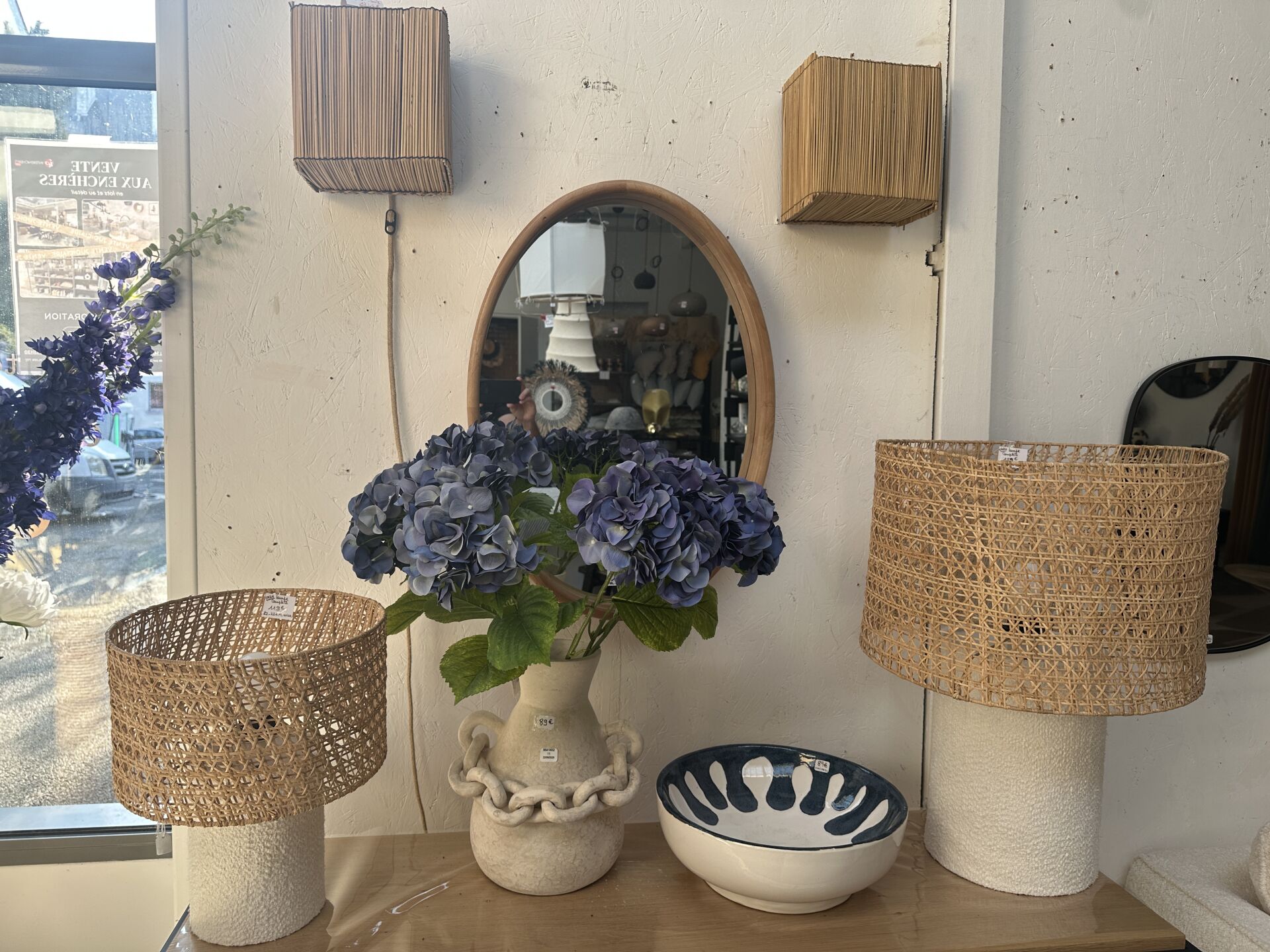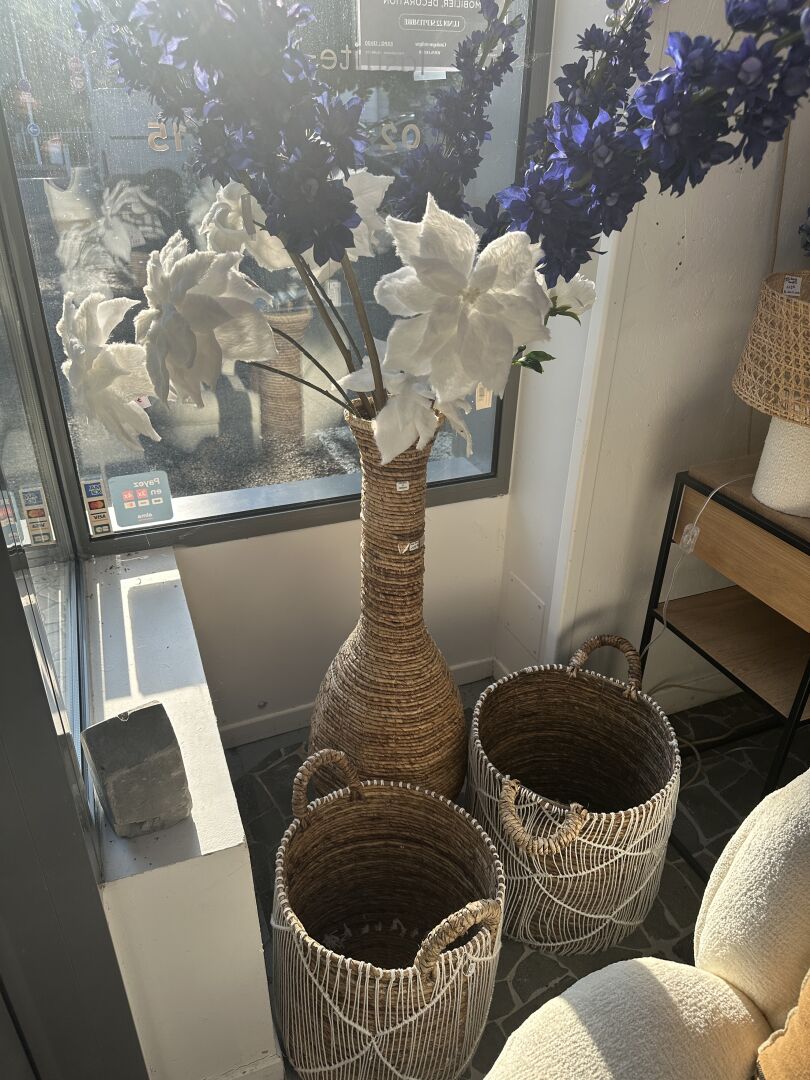 1 vase jonc hauteur 100cm avec fleurs artificielles, 1 suspension jonc de mer diamètre 60cm, 2...