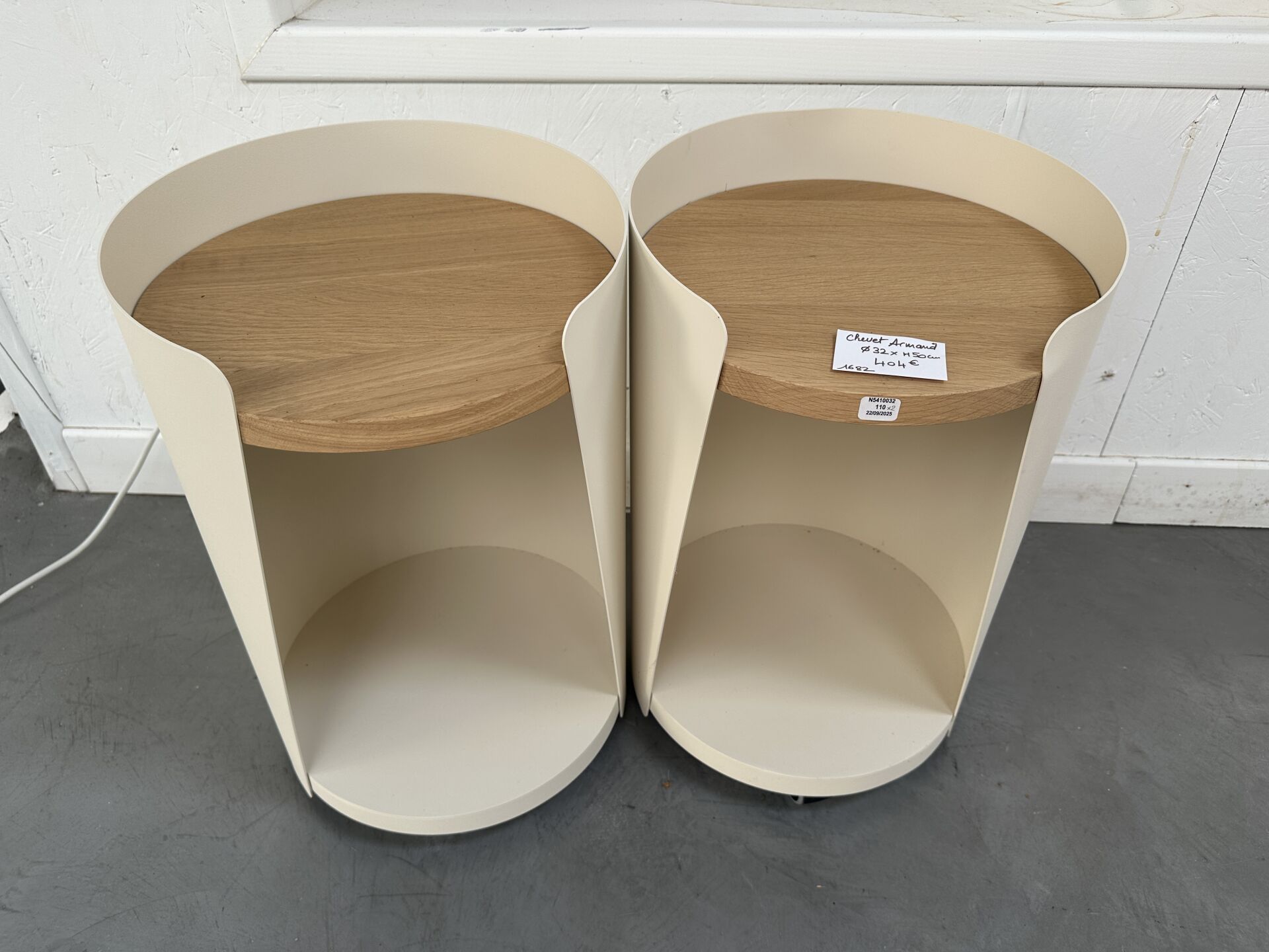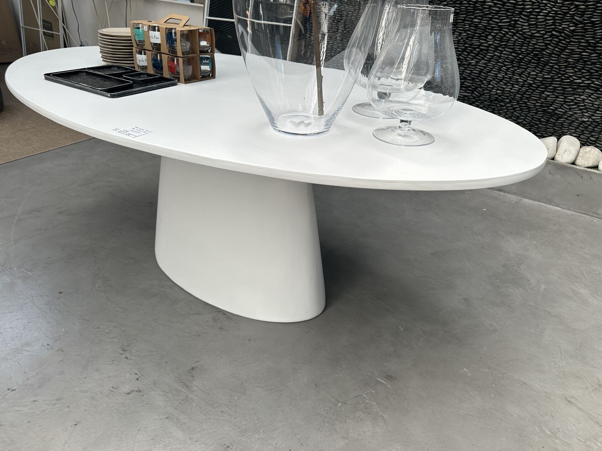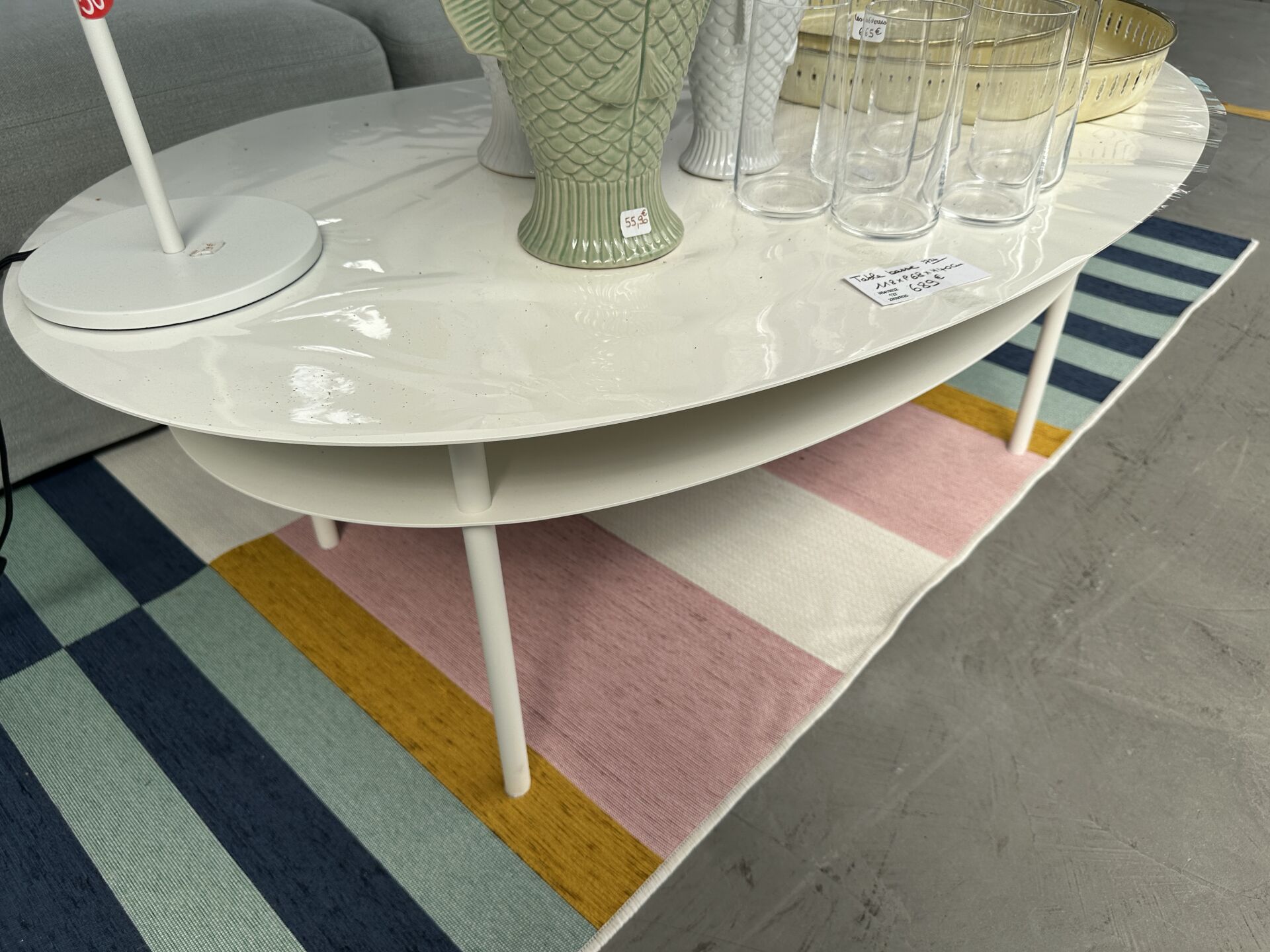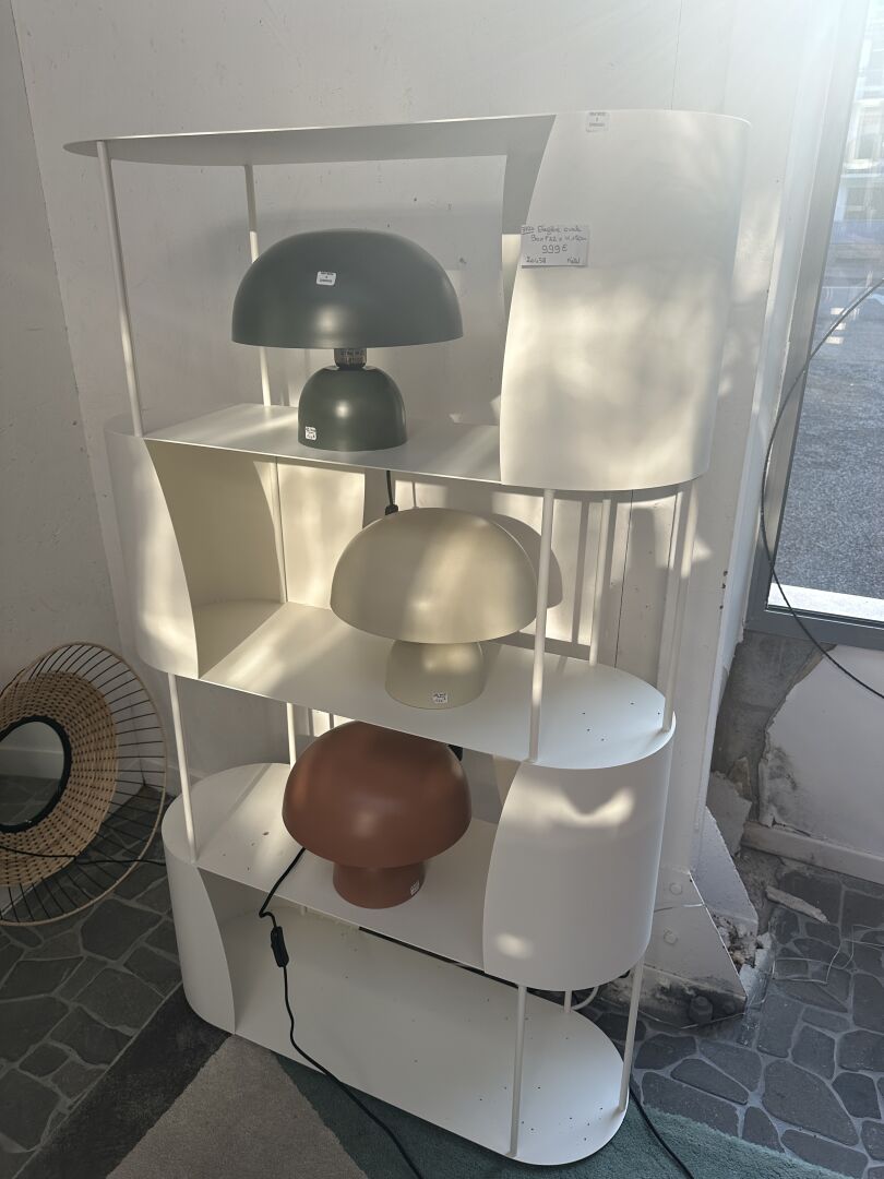 1 étagère ovale métal blanc 90X32X150cm, 4 niveaux ; Prix de vente magasin : 1 000 €