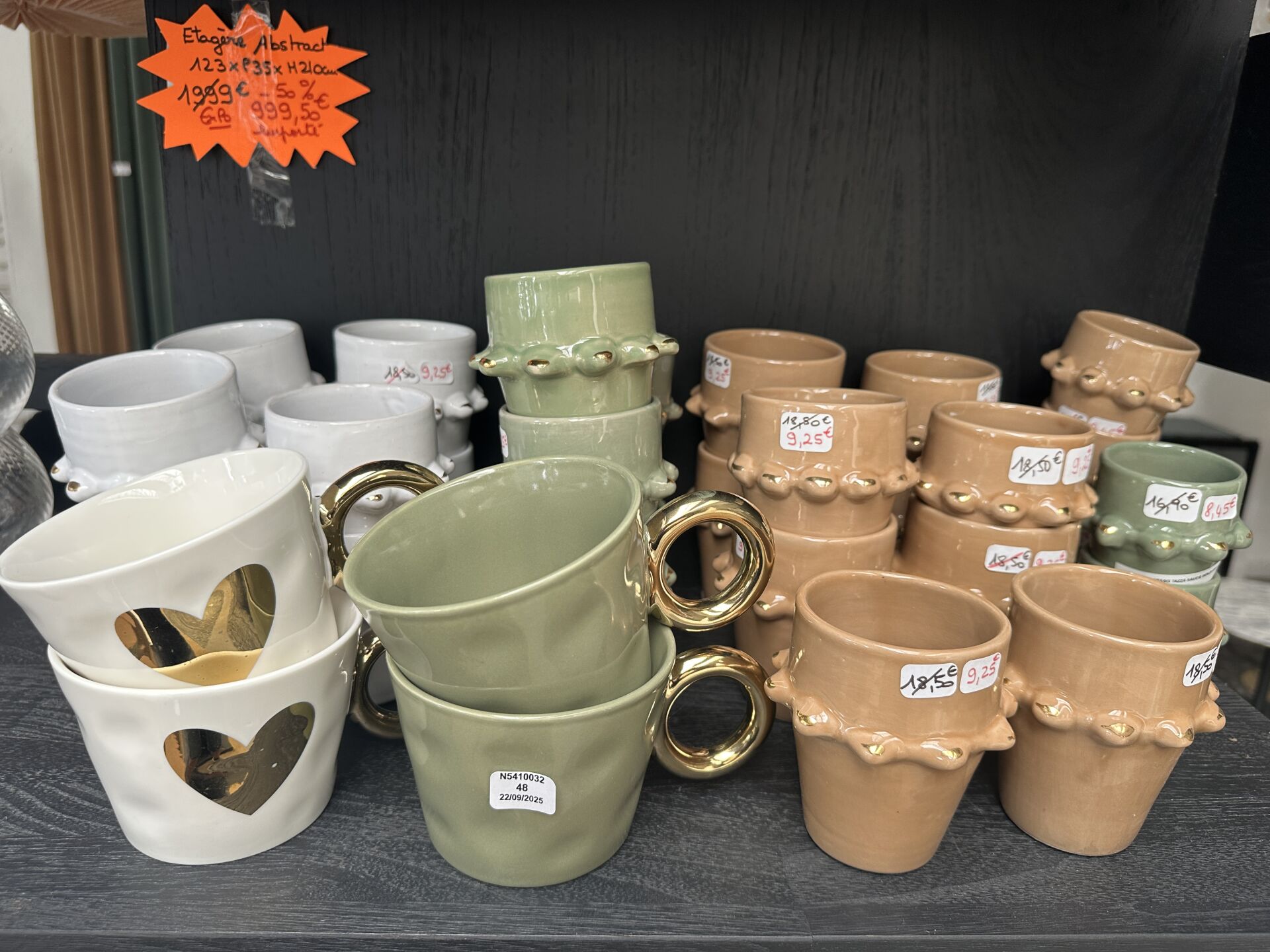 Assortiment de tasses dont OP JET et BELDI coloris sable, vert grenouille et blanc avec cœur...