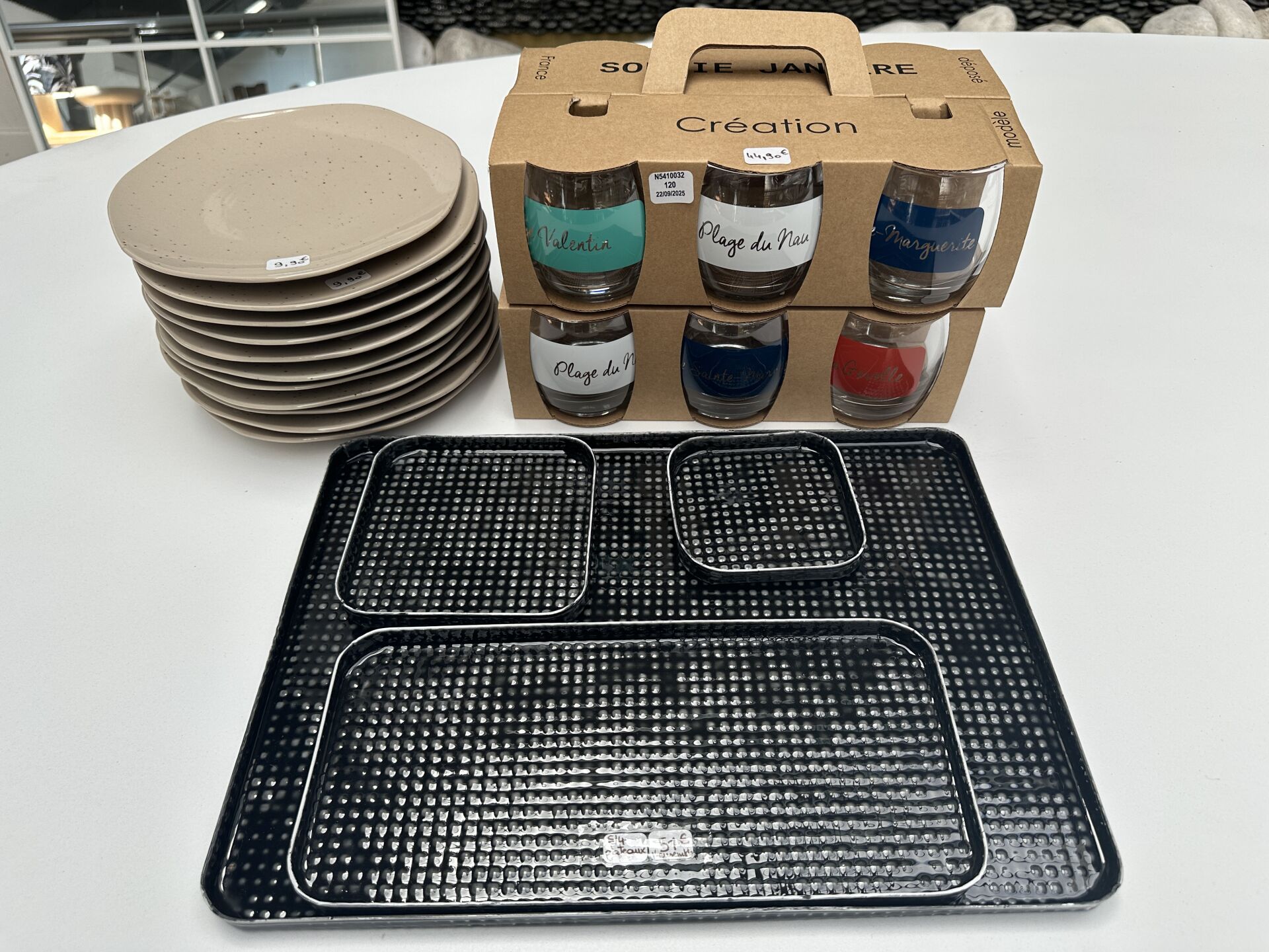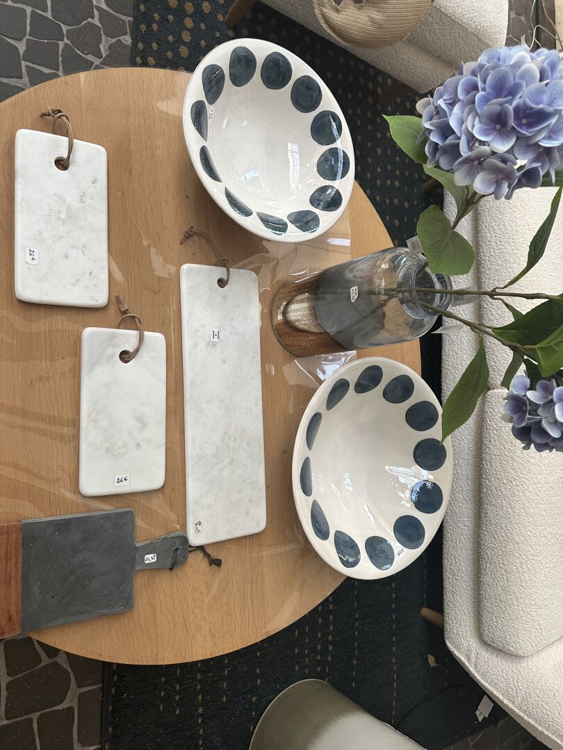 2 plats céramique COSMOS, ATHEZZA, bleu et blanc diam.33 et 38cm, 4 planche à découper marbre...