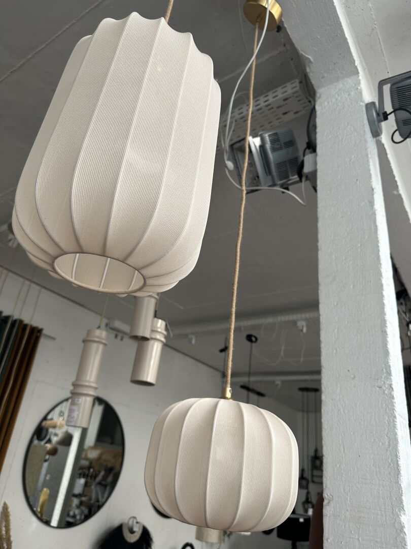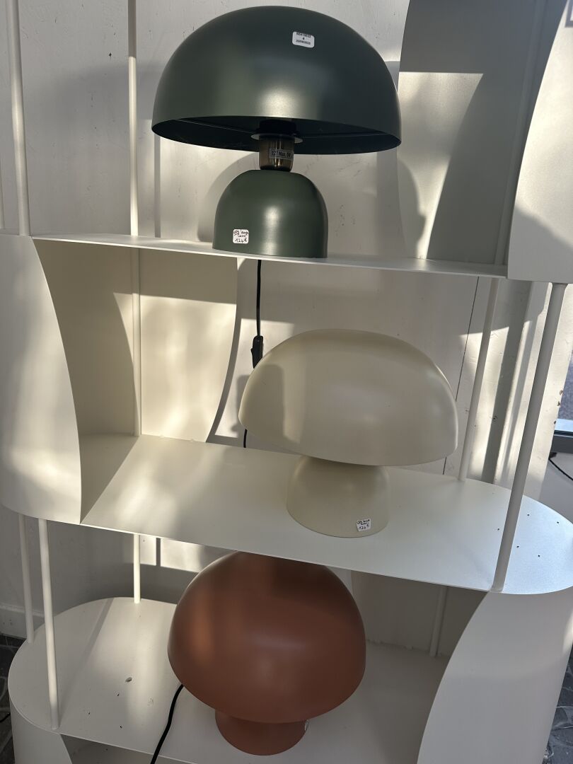 3 lampes champignon NOMADE Caour vertpetit pois, terra cotta et blanc écru ; Prix de vente...