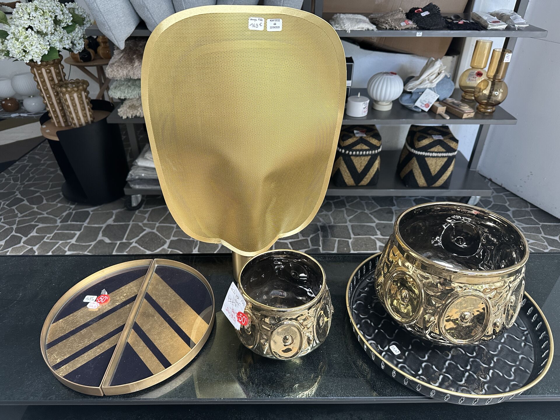 décoration comprenant 2 caches pot doré effet mercurisé, 1 plateau métal émaillé BAZAR...