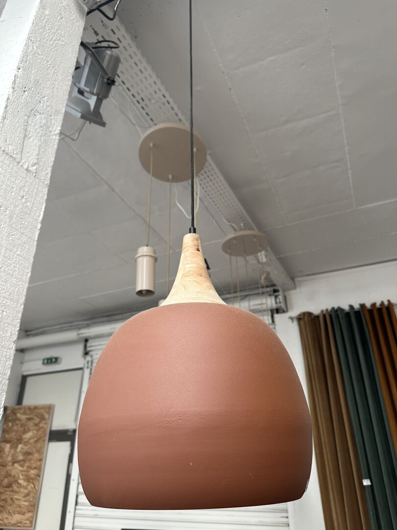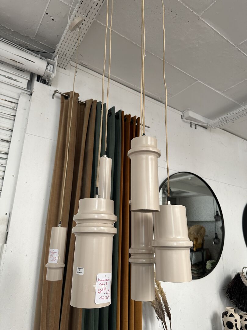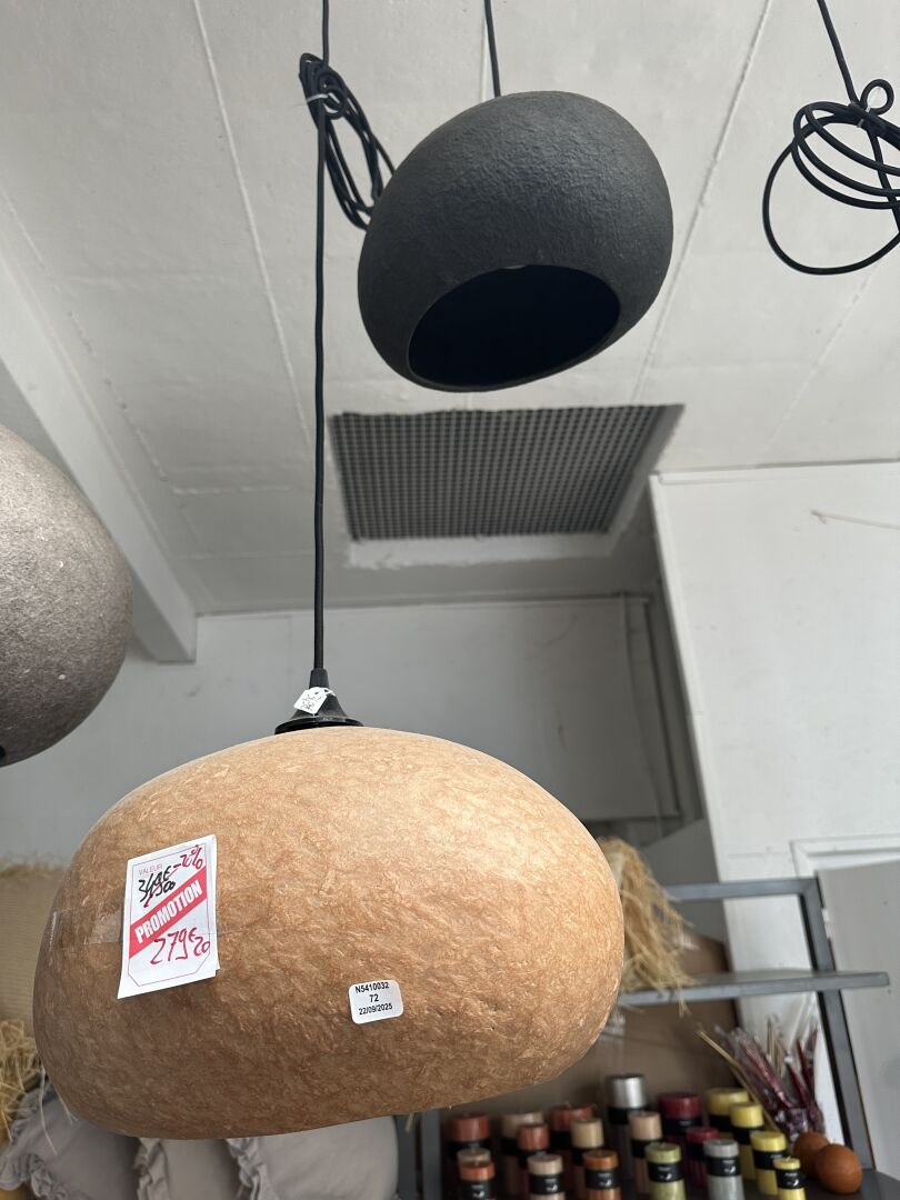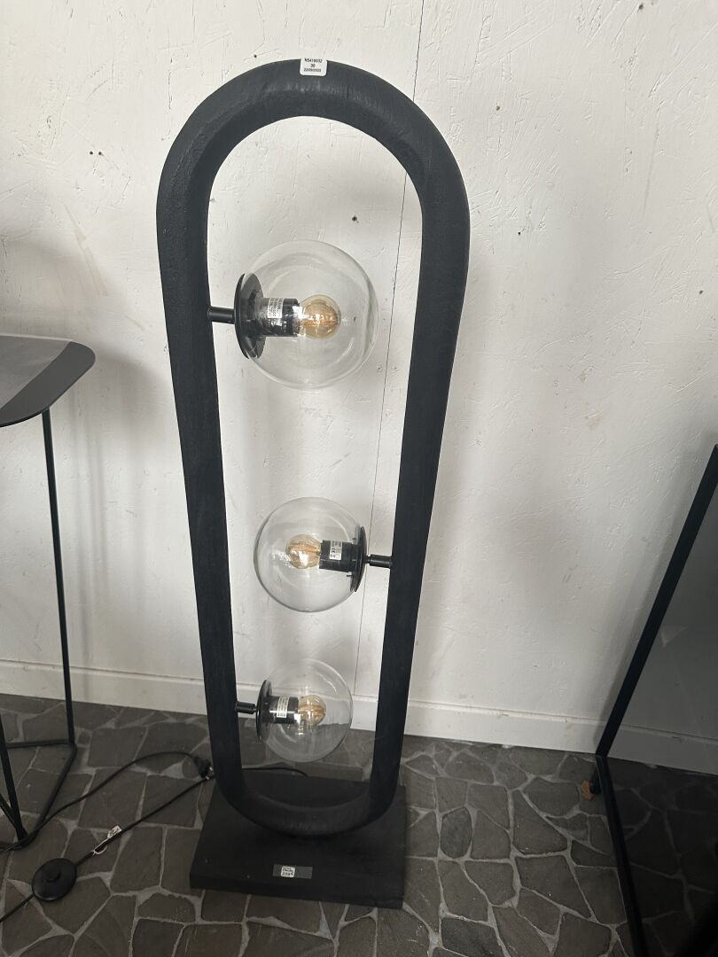 1 lampadaire 3 ampoules PVC imitation bois hauteur 120cm et 1 suspension 2 ampoules assortie;...