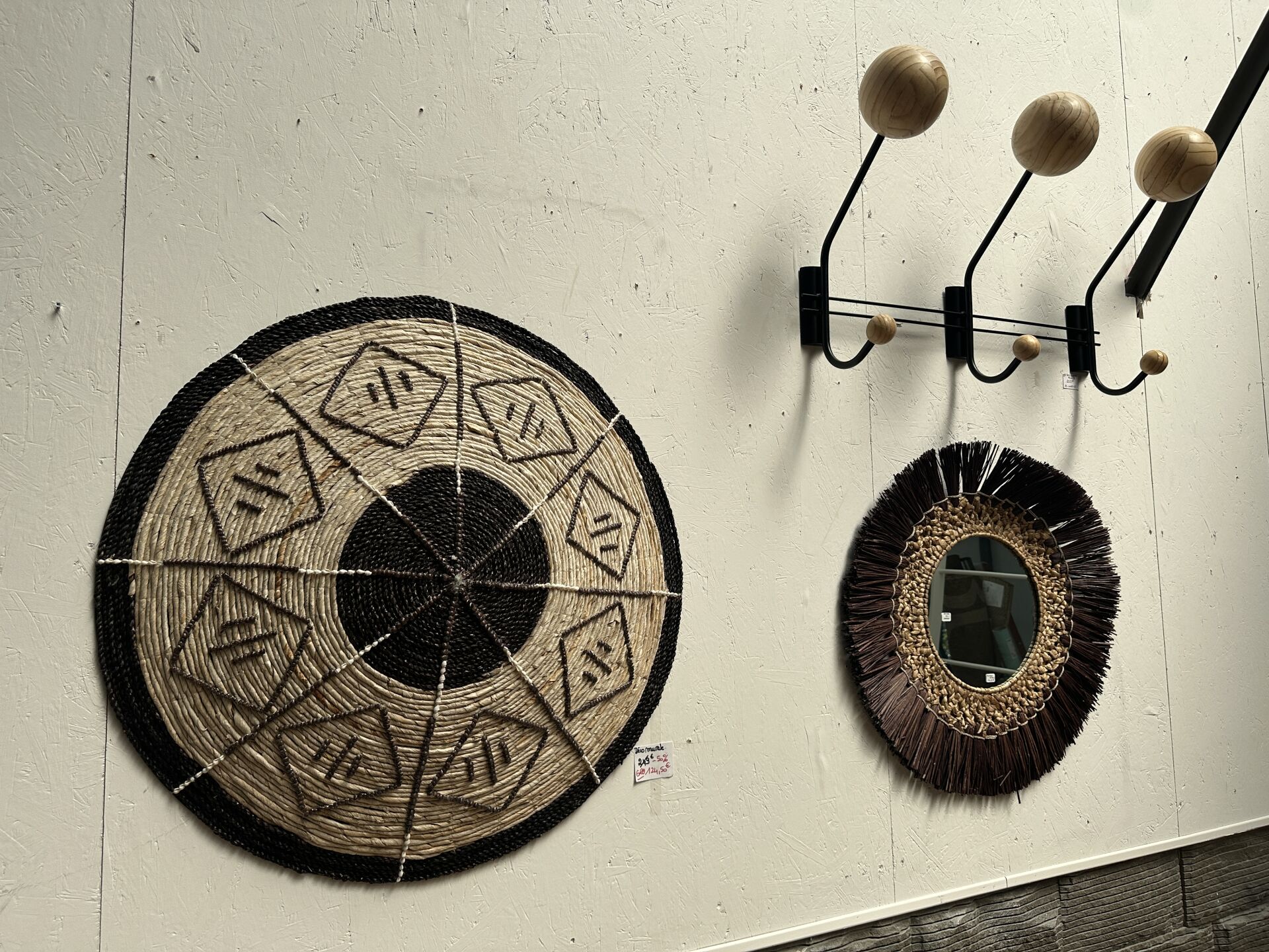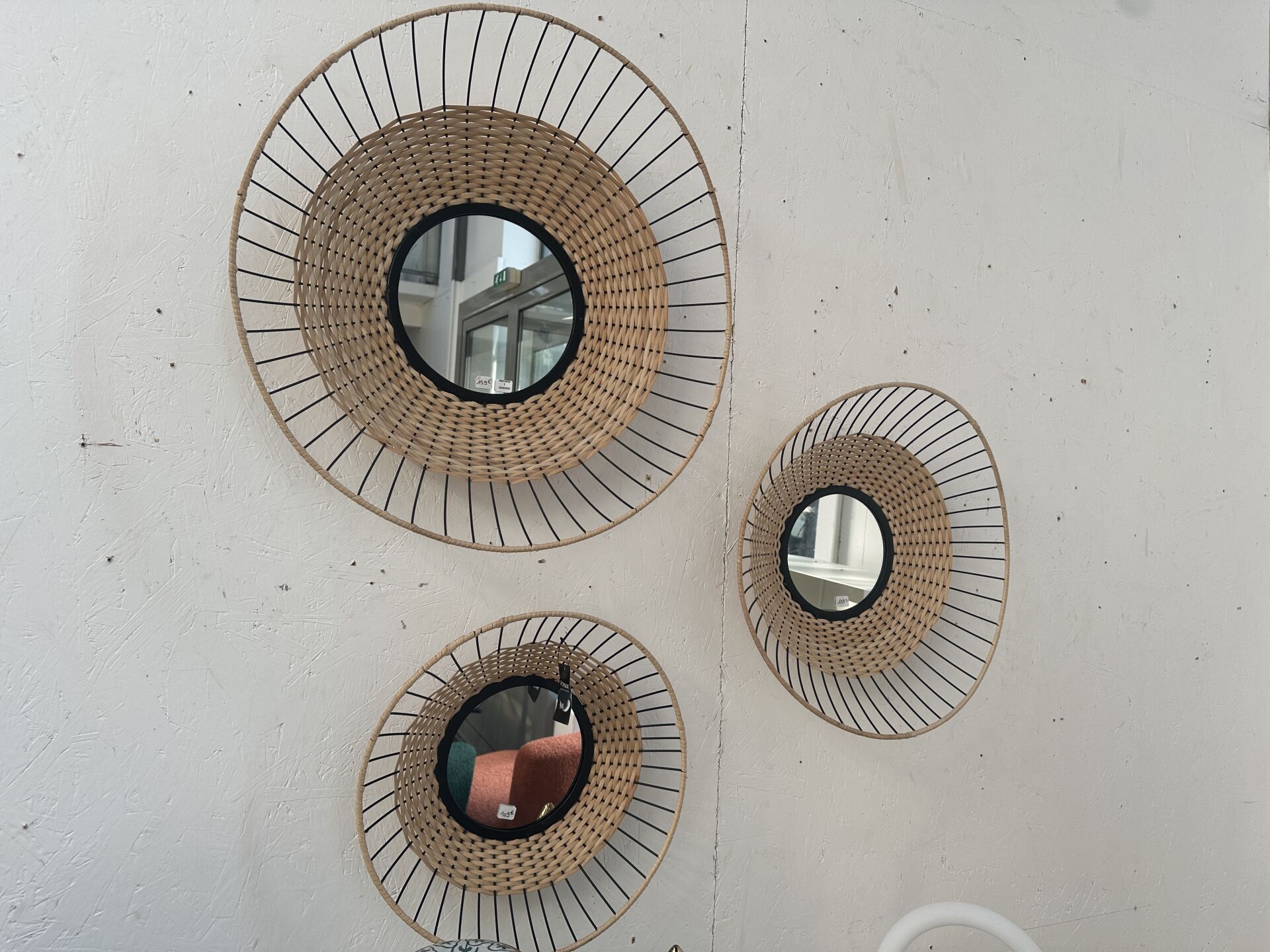 4 miroirs ronds fil métal noir et rotin POMAX, diam 40, 48 et 60 cm; Prix de vente magasin : 410...