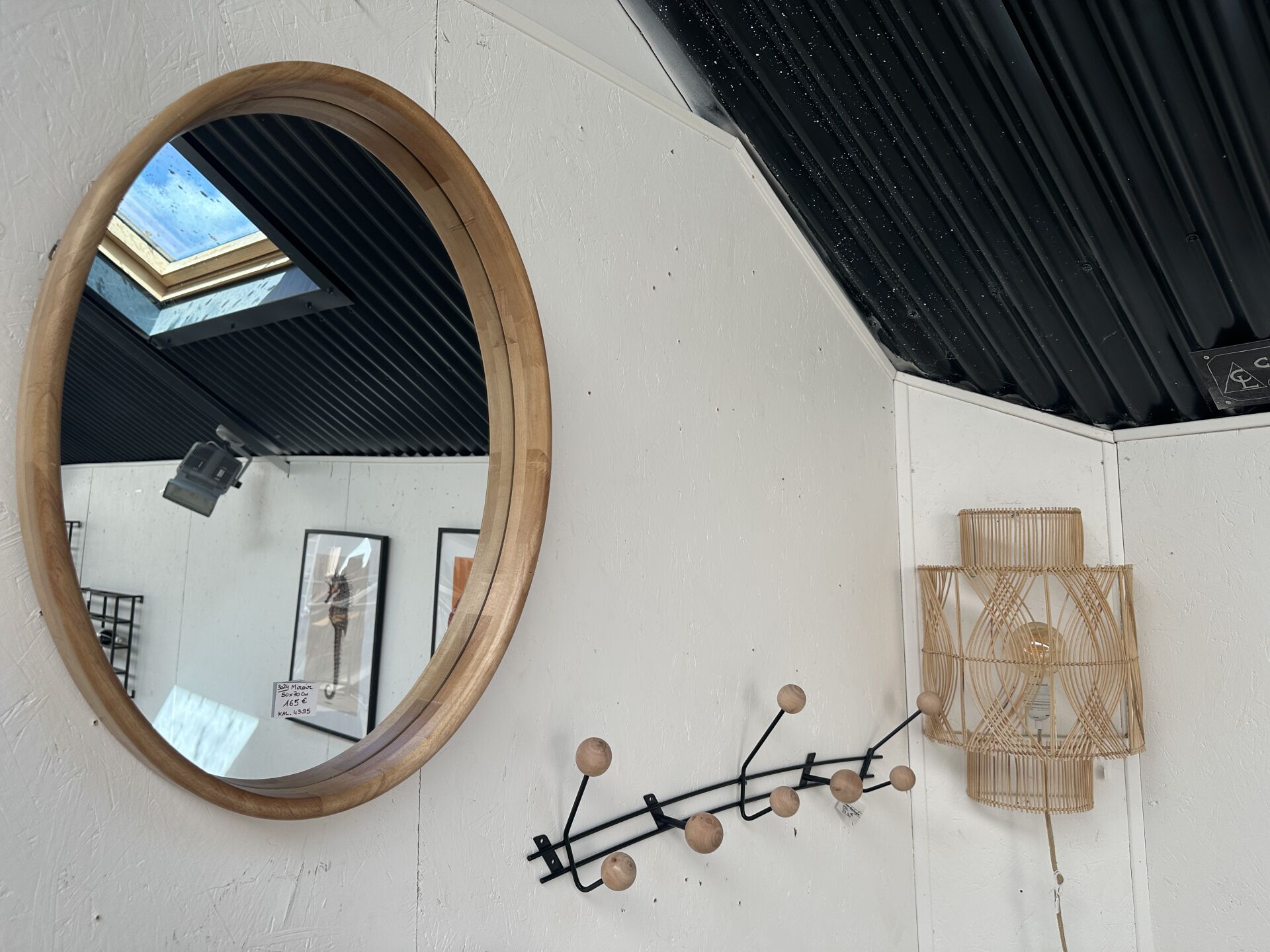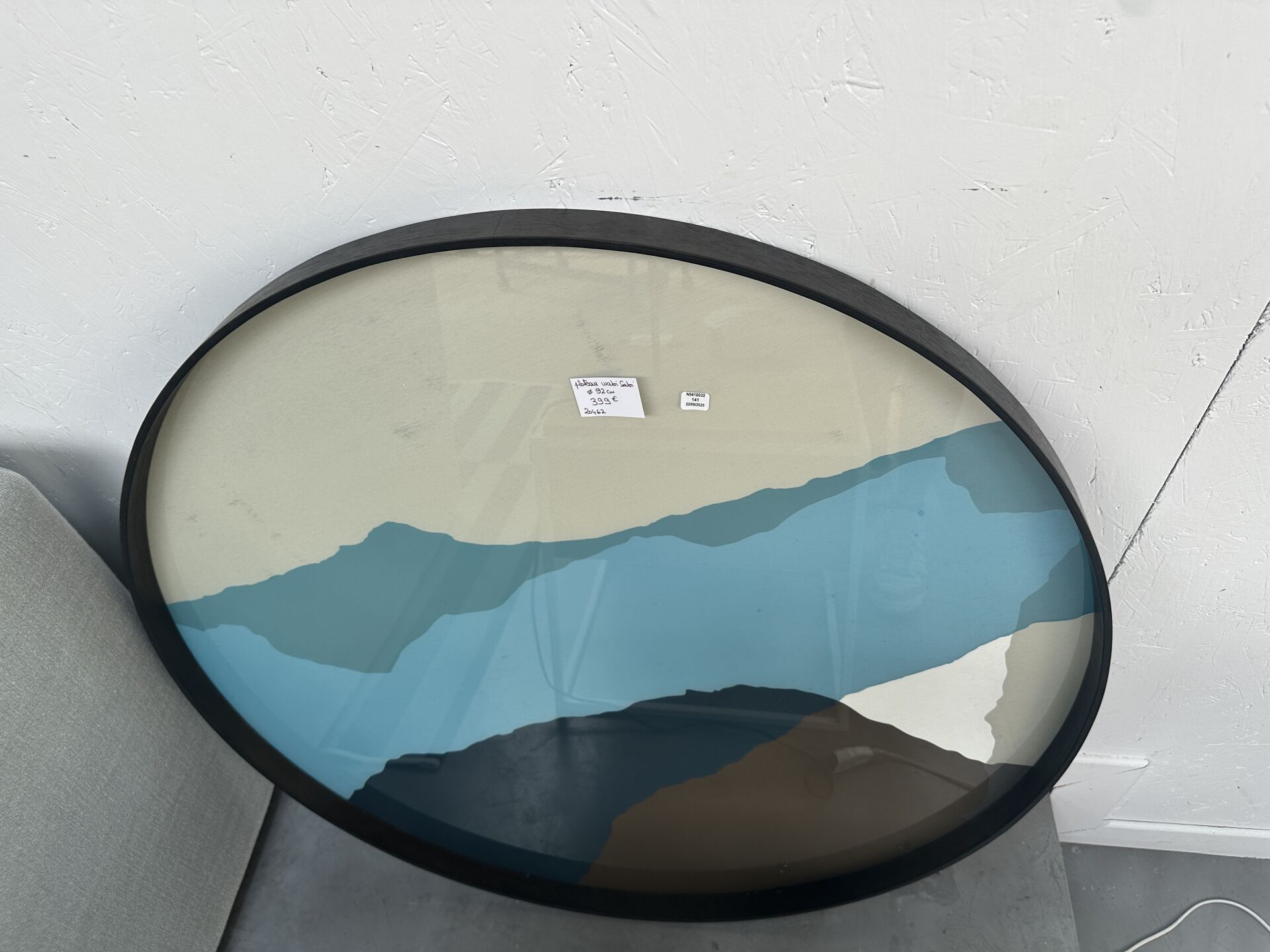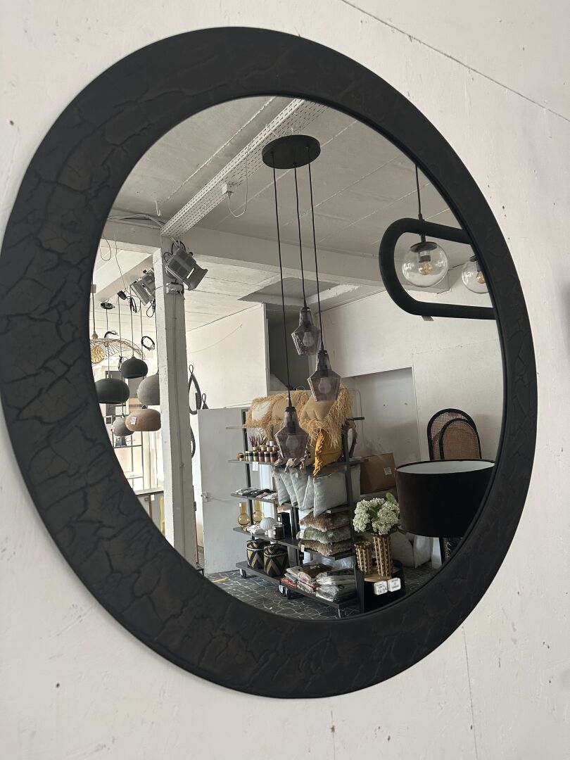 1 grand miroir rond SPHERE cadre bois effet brûlé diam. 99cm; Prix de vente magasin : 570...
