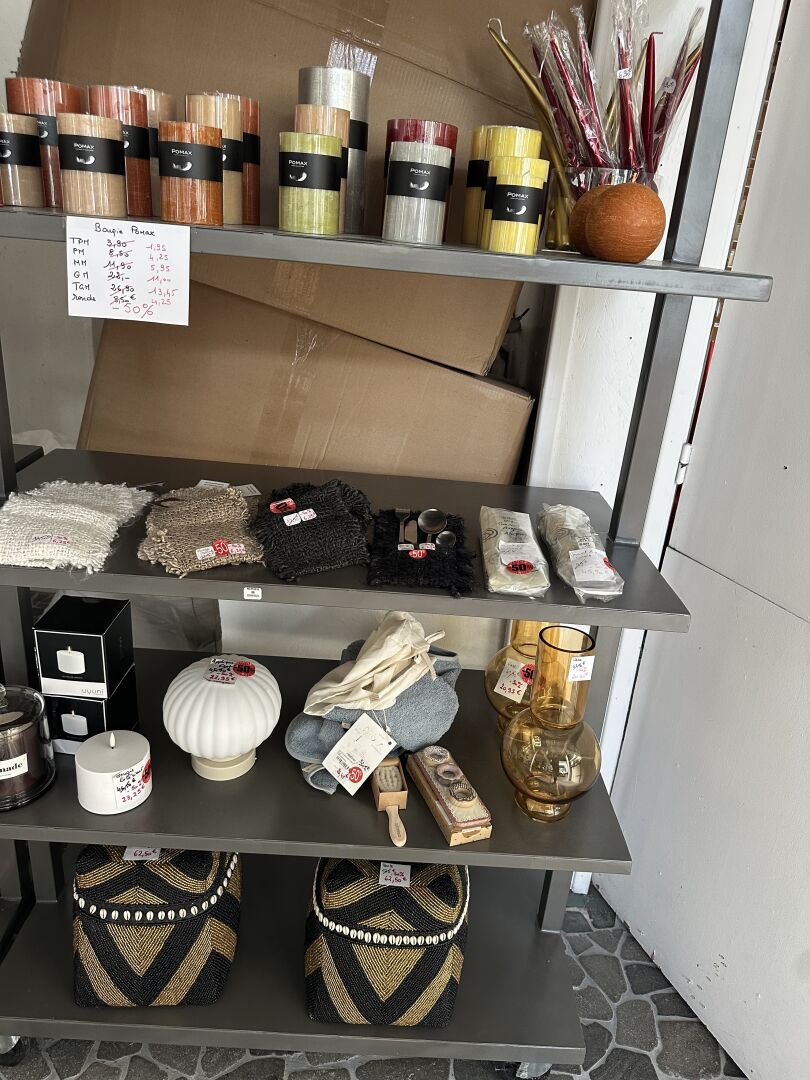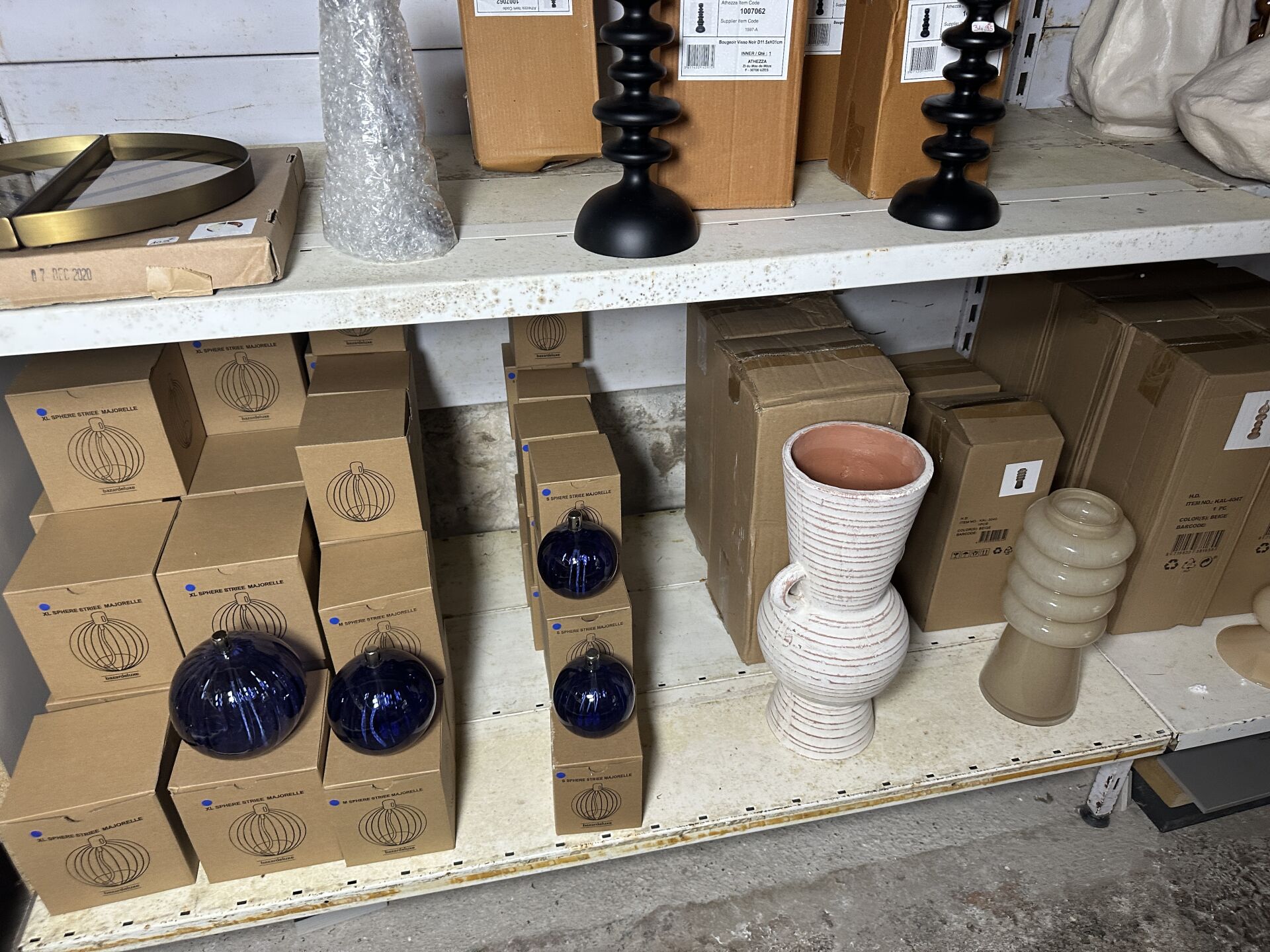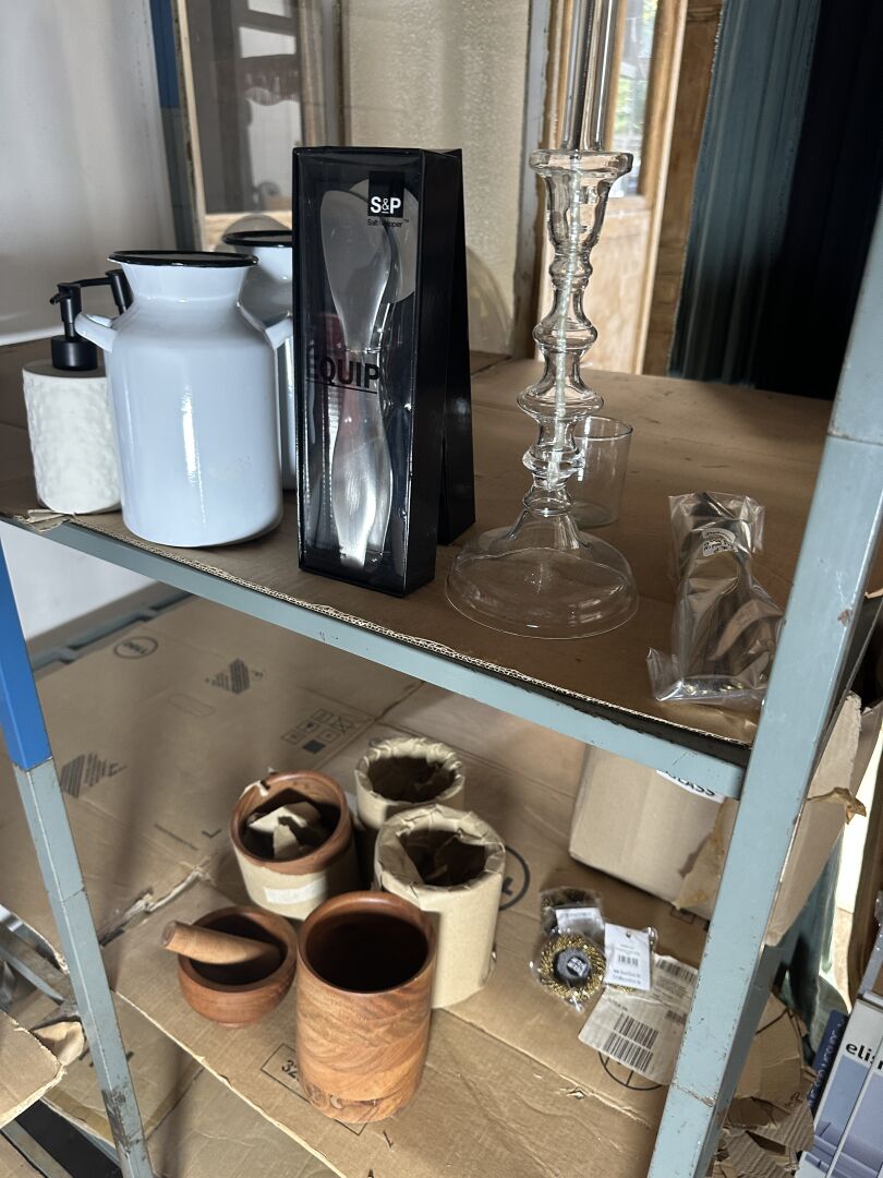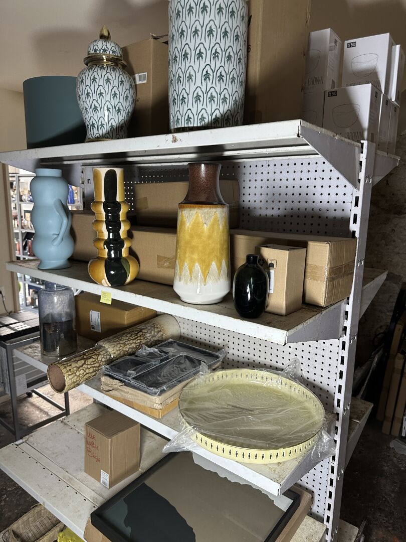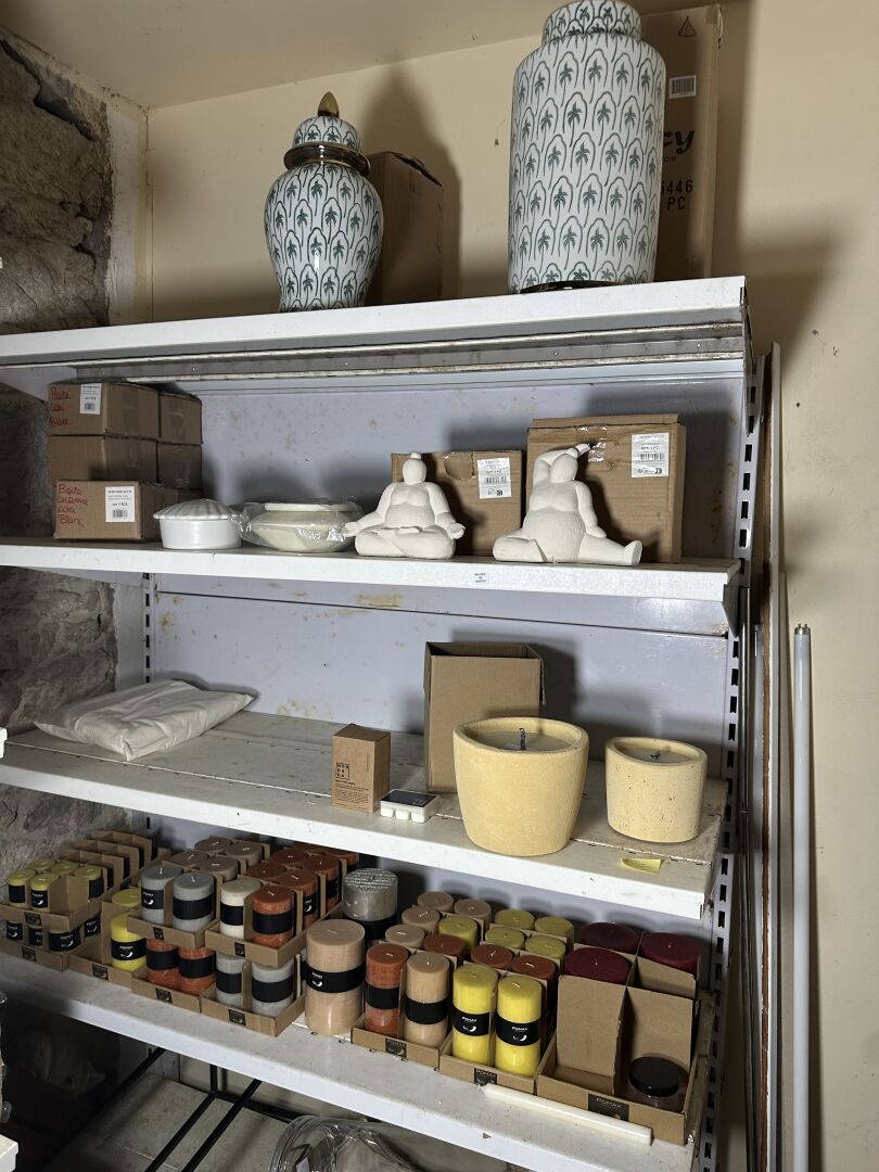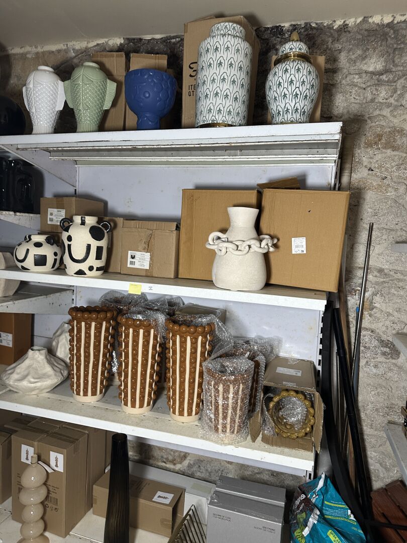 Contenu d’une petite réserve comprenant un stock d’objets de décoration dont...