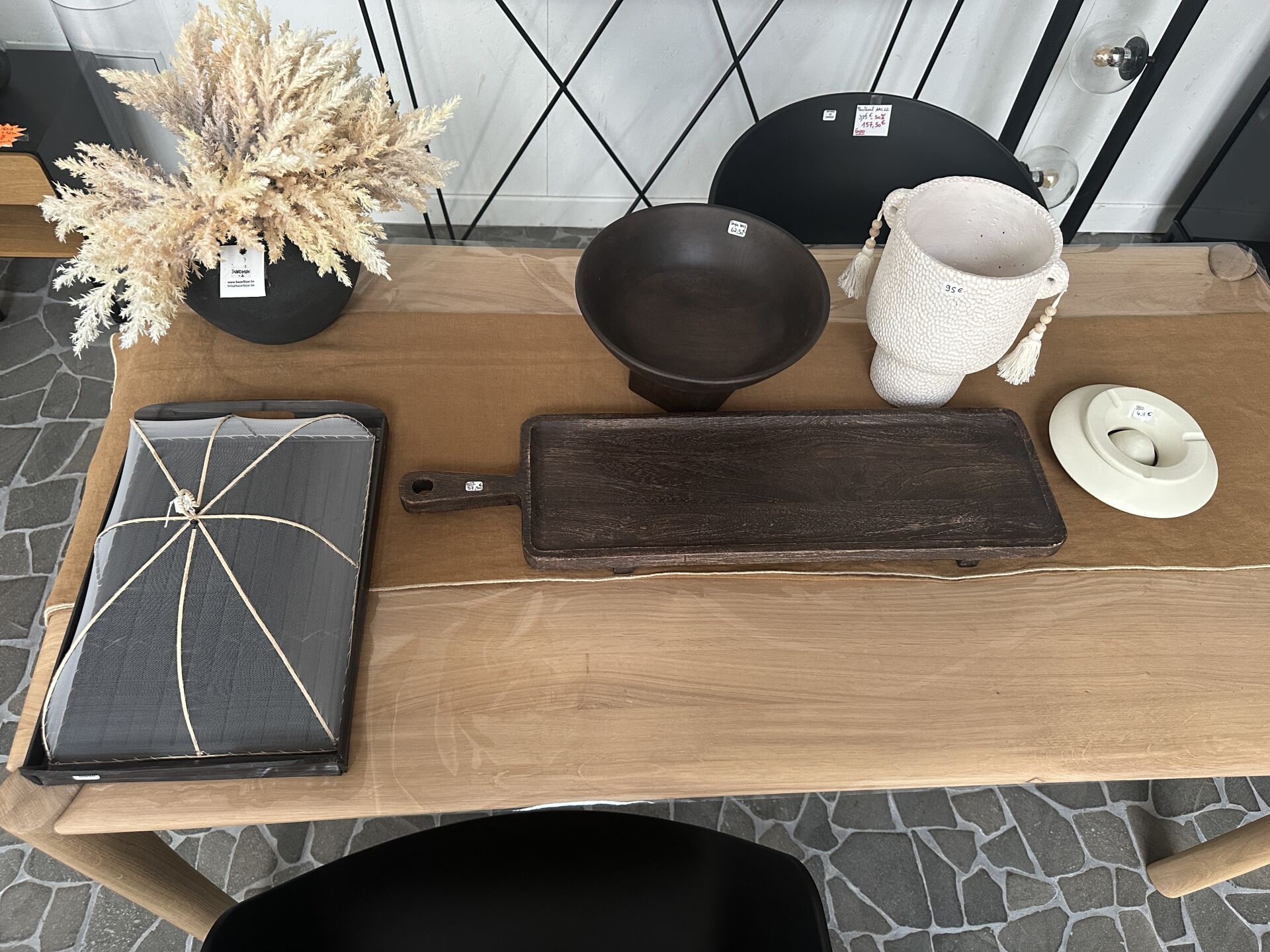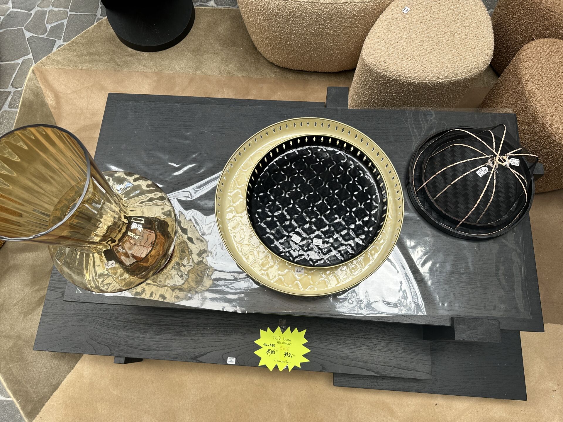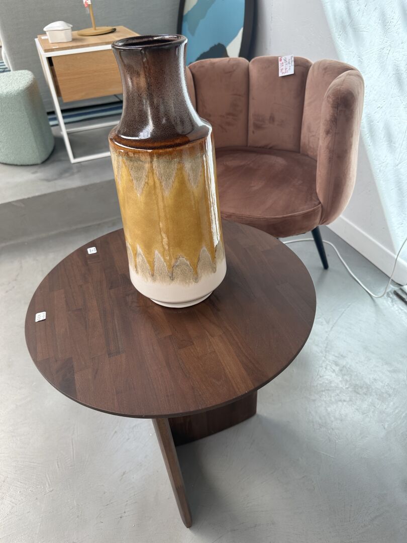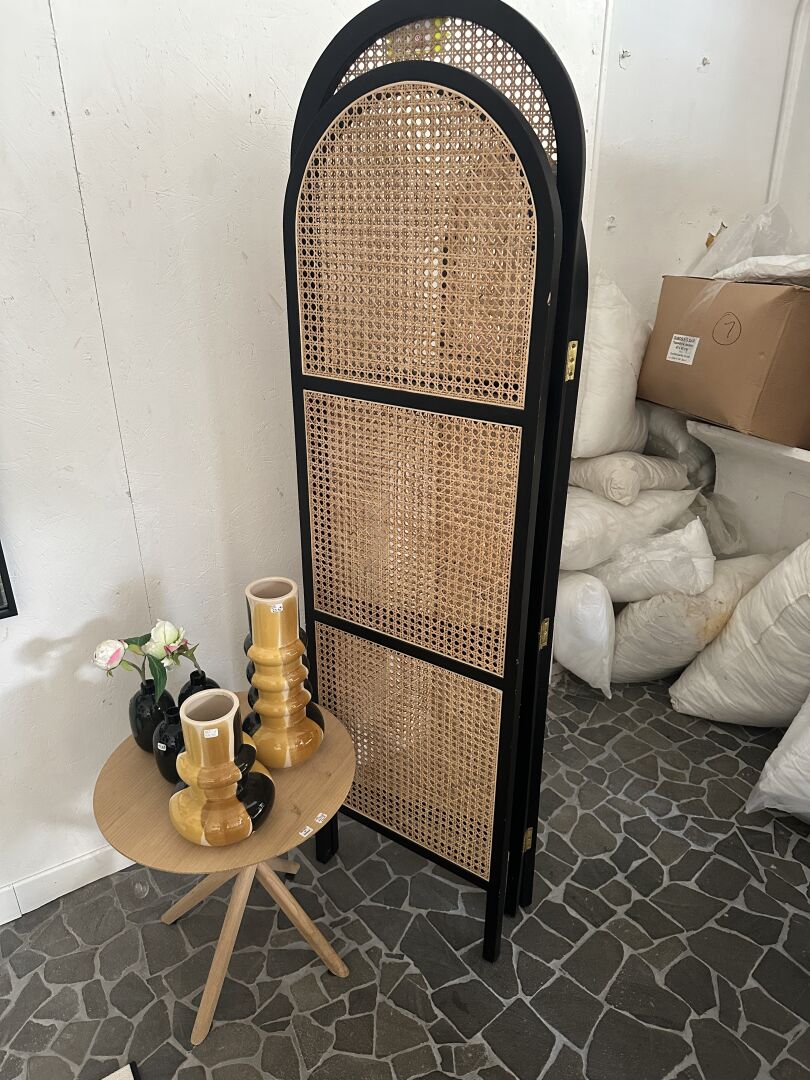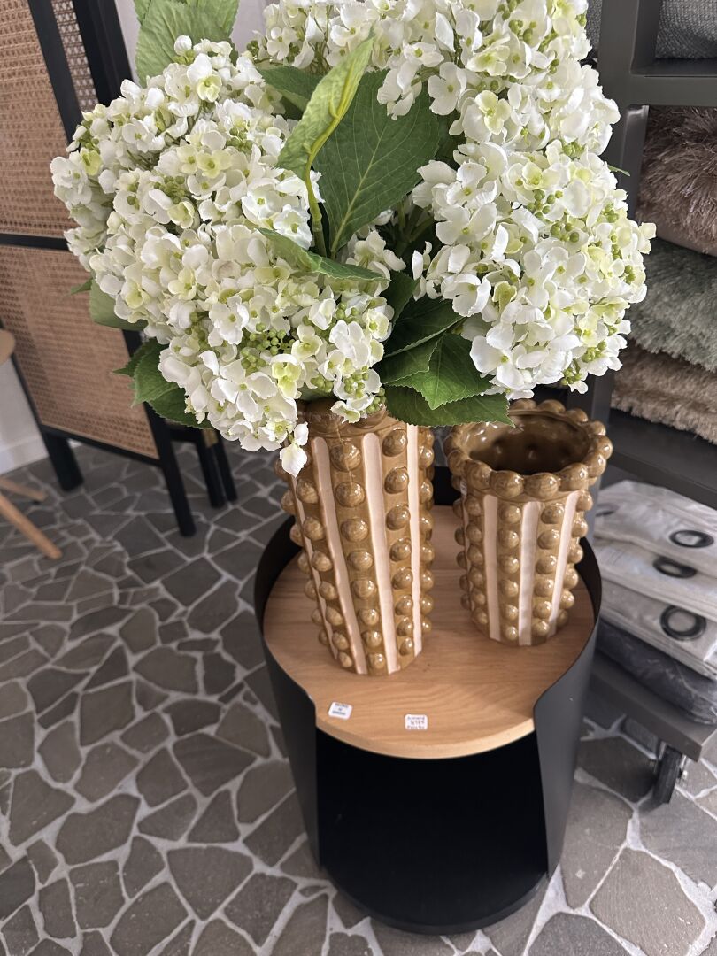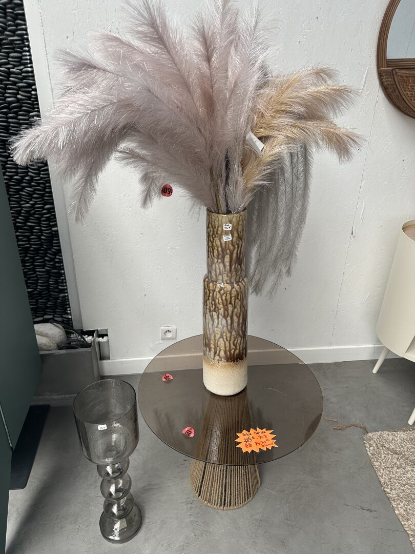 1 tabouret à roulettes ARMAND tôle noire et bois 40X50cm, 2 vases ATHEZZA PAMPA camel et beige...