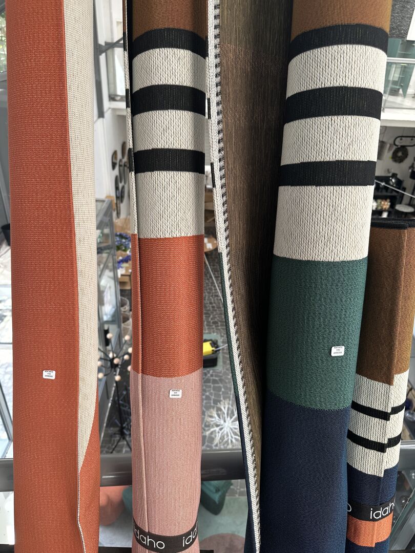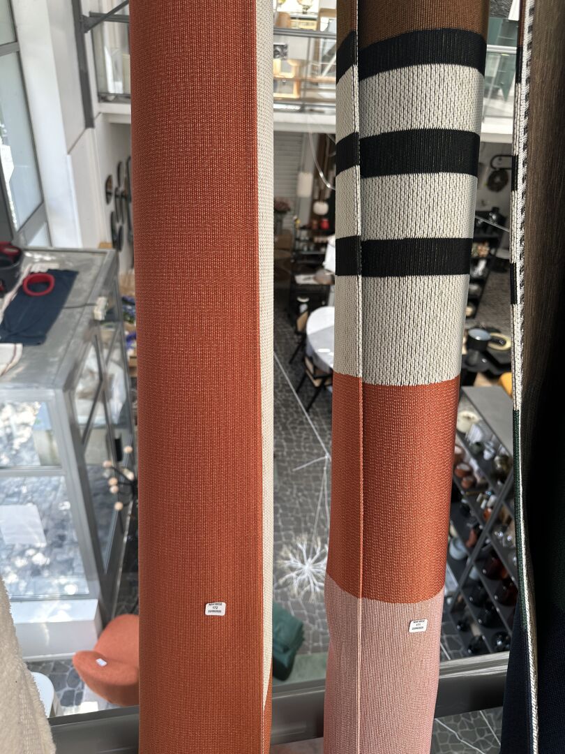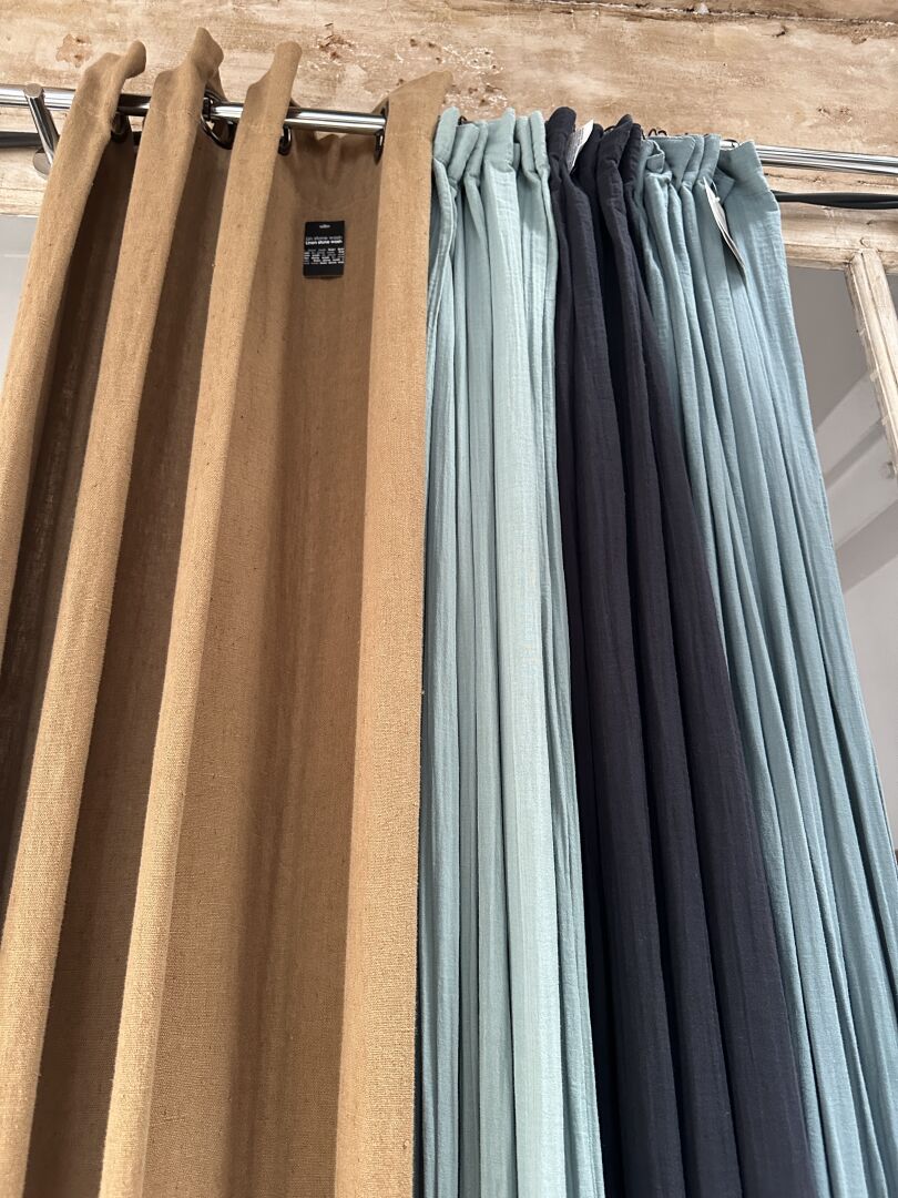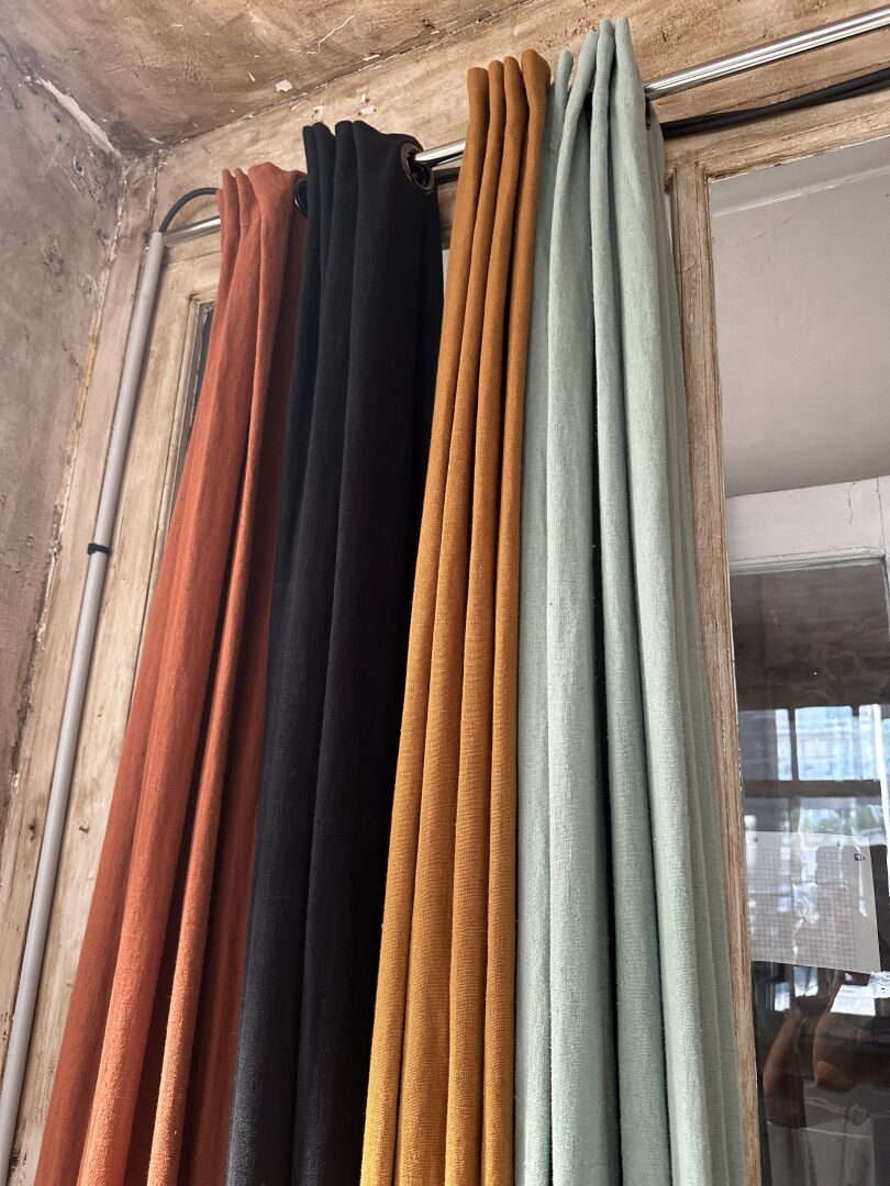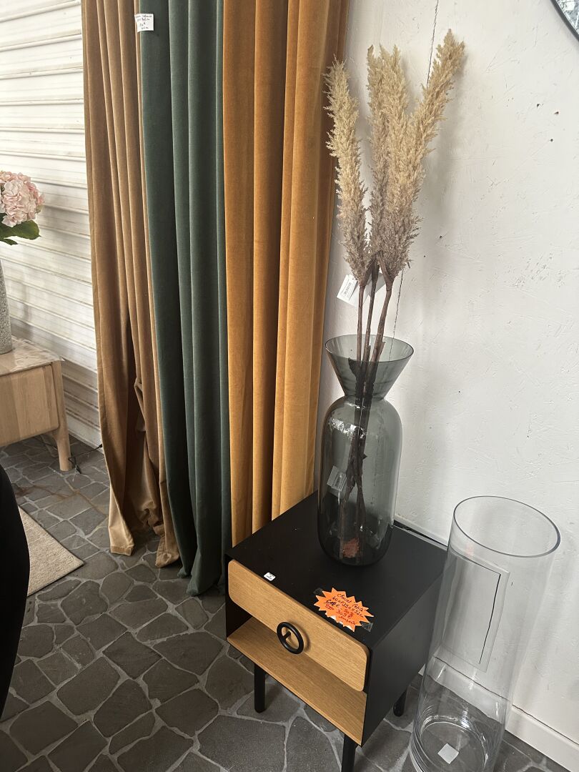 3 rideaux tissus velours taupe, vert anglais et orangé 135X300cm, 1 vase verre noir VASO avec...