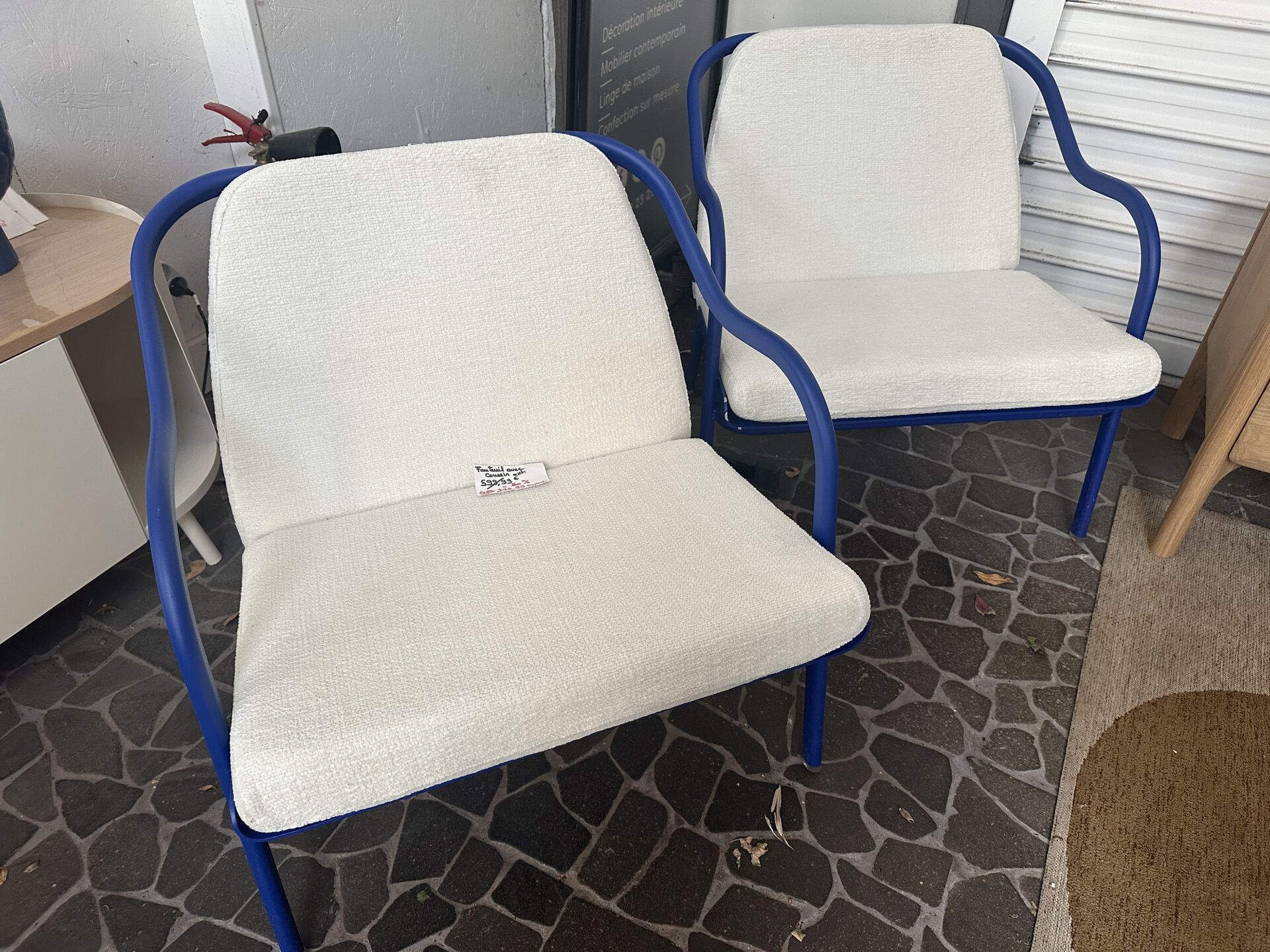 2 fauteuils ALLURE ET AZUR, piètement métal bleu, coussins tissus blanc cassé; Prix de vente...