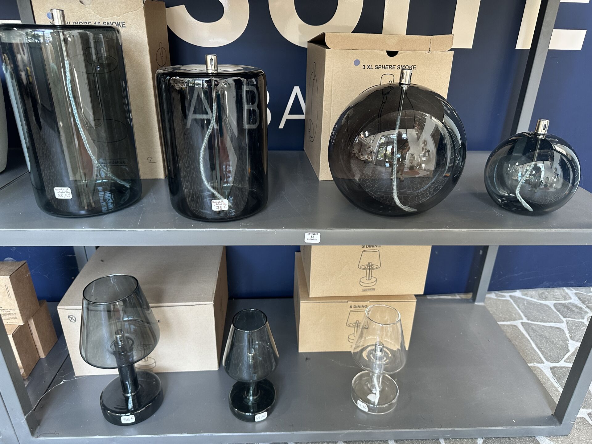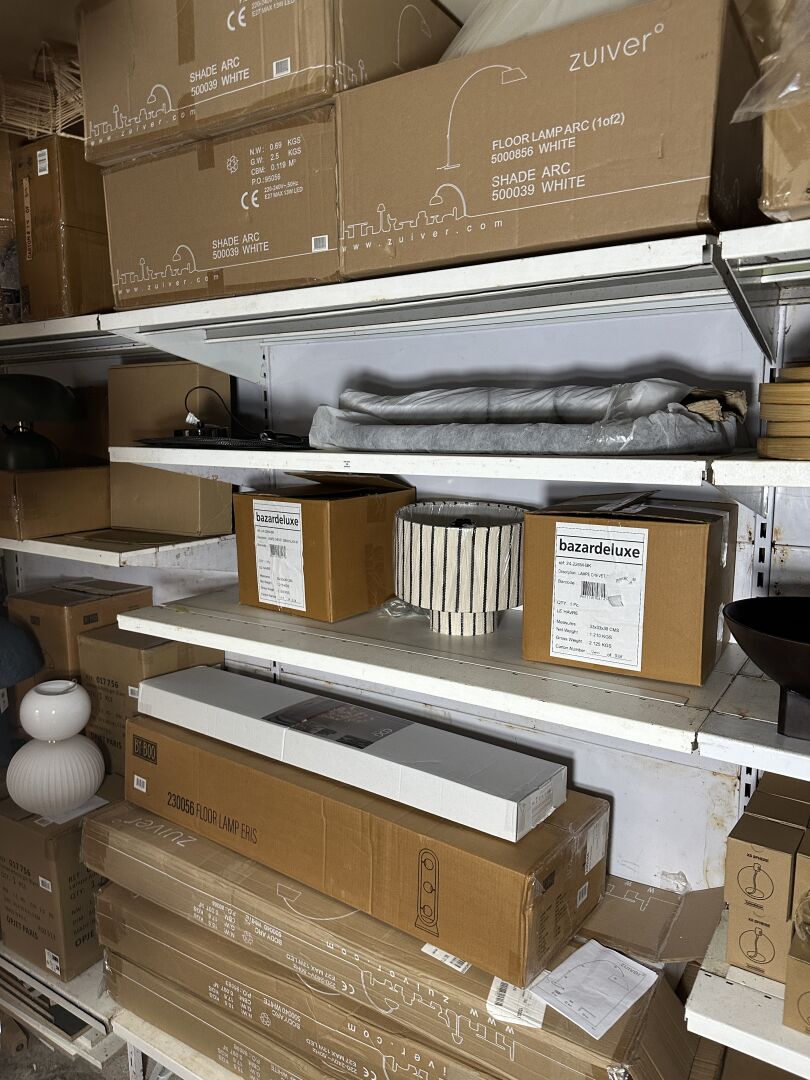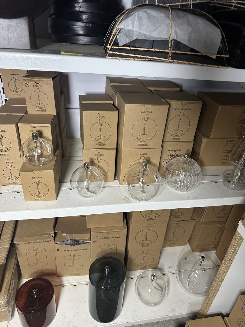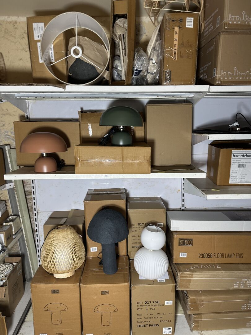 Dans une réserve, sur 1 module, ensemble de décoration dont environ 12 lampes à poser BY BOO...