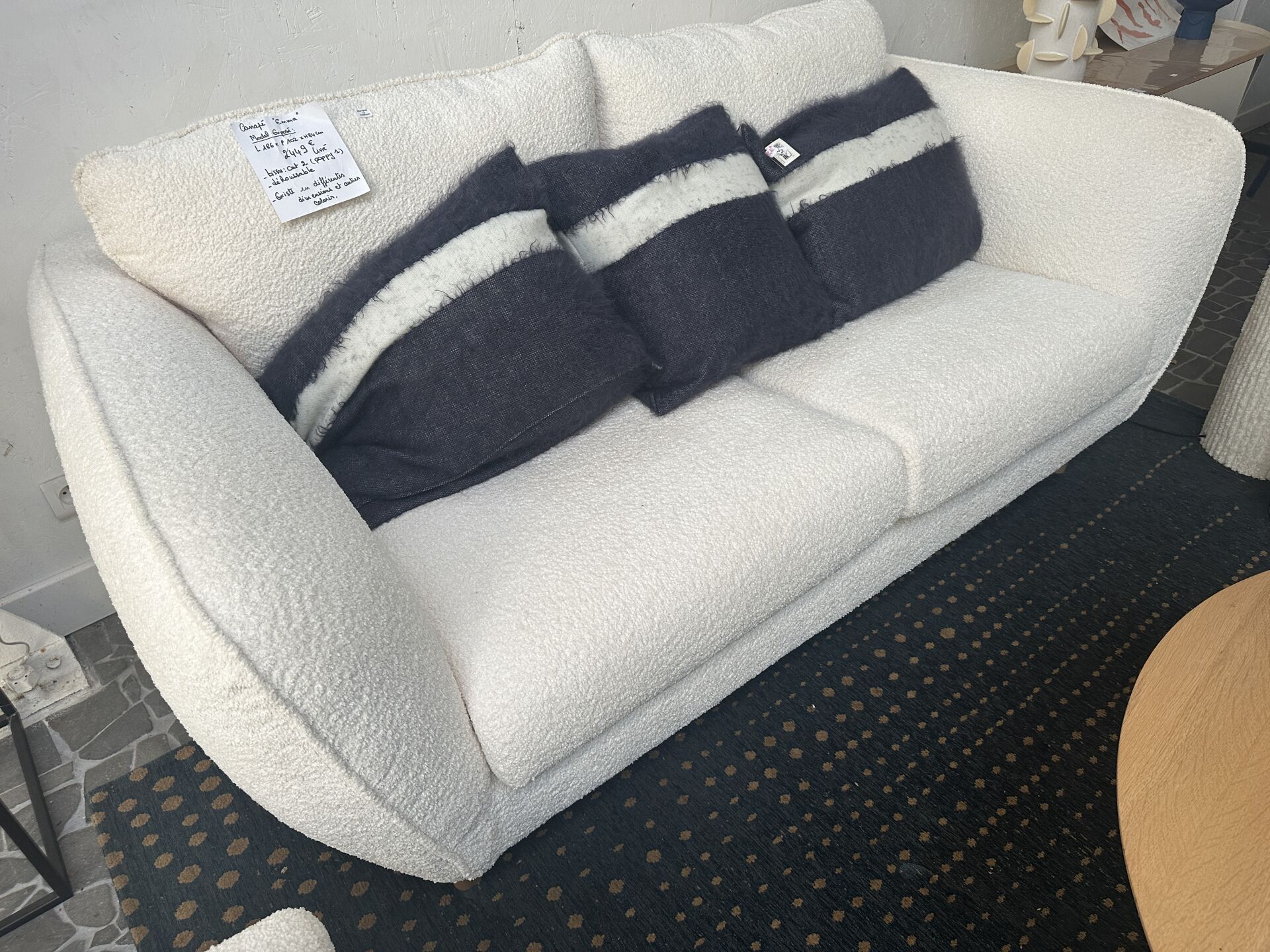 1 canapé EMMA CAT2, tissus bouclé blanc cassé,déhoussable, 86X102X84cm, pieds bois, avec 3...