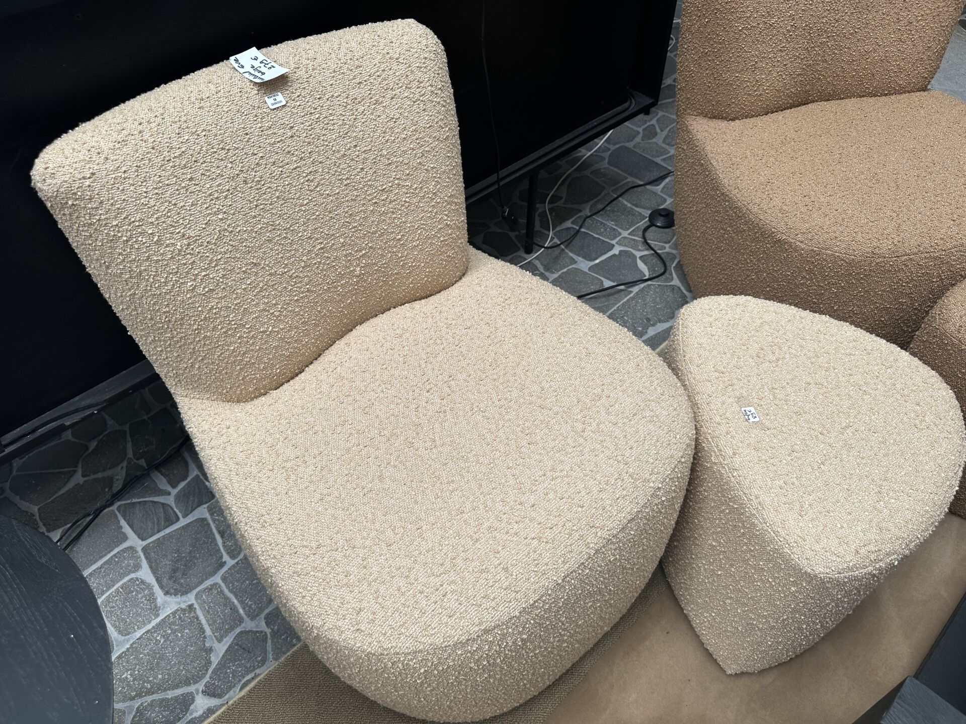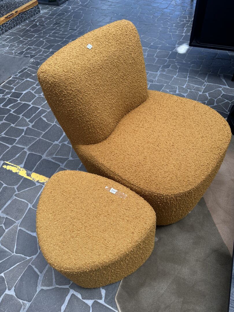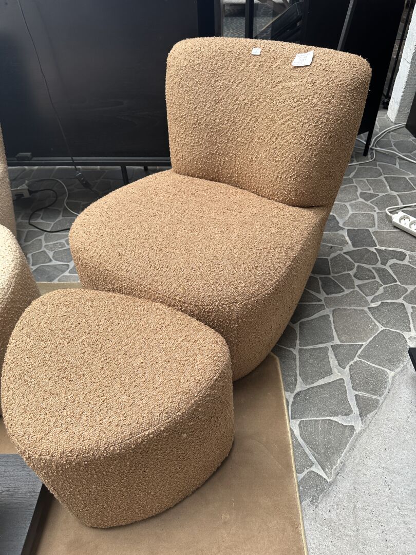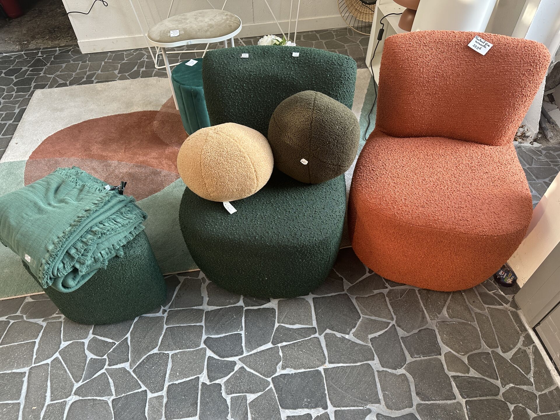 2 fauteuils type EVE tissus bouclé vert et terra cotta, 1 pouf assorti vert , 2 coussins boule...