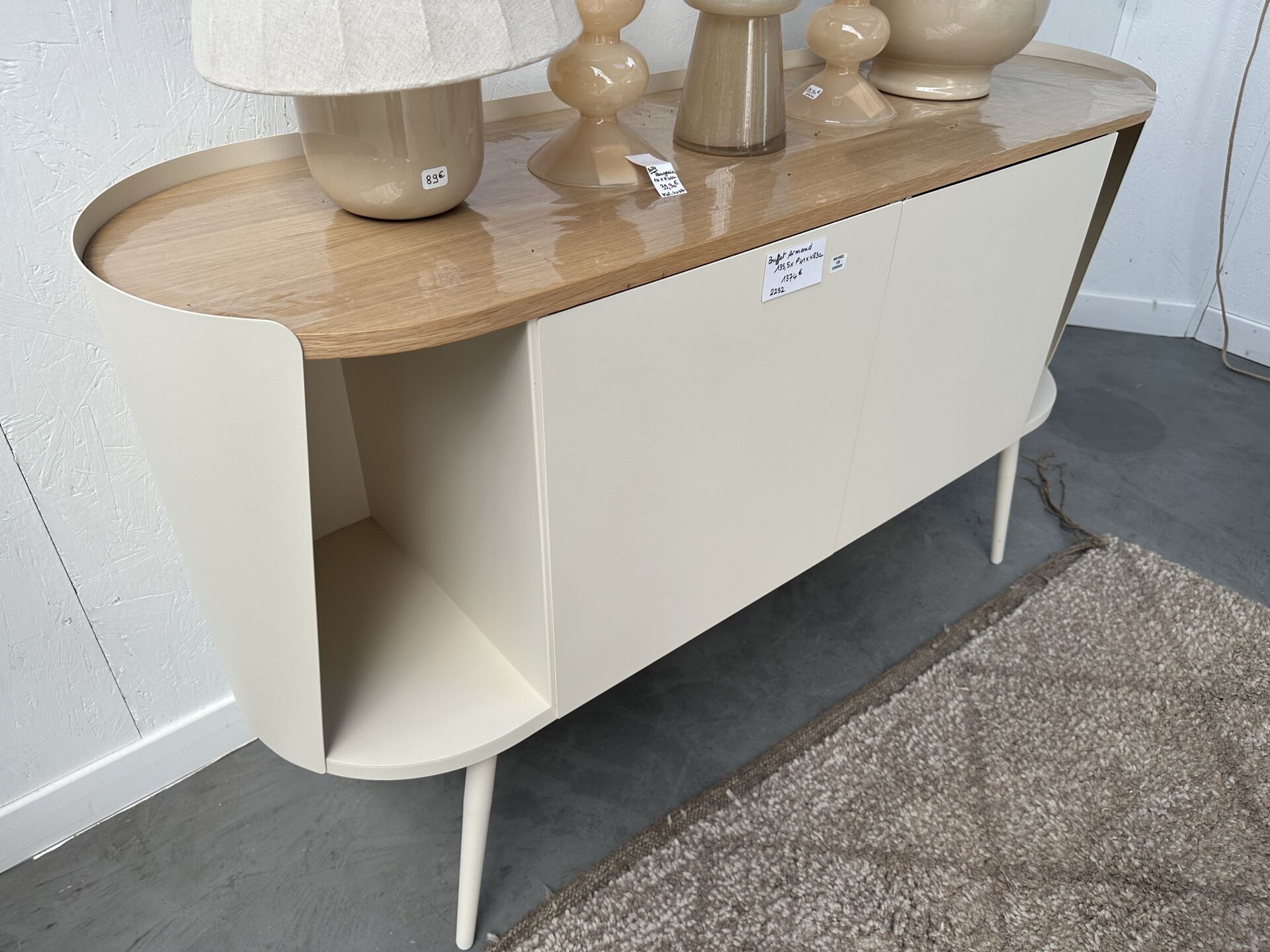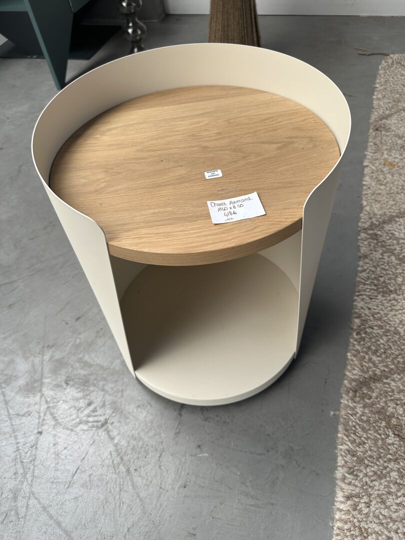 1 meuble TV ARMAND , oval, métal blanc crème, plateau bois clair, 2 portes, 2 niches,...