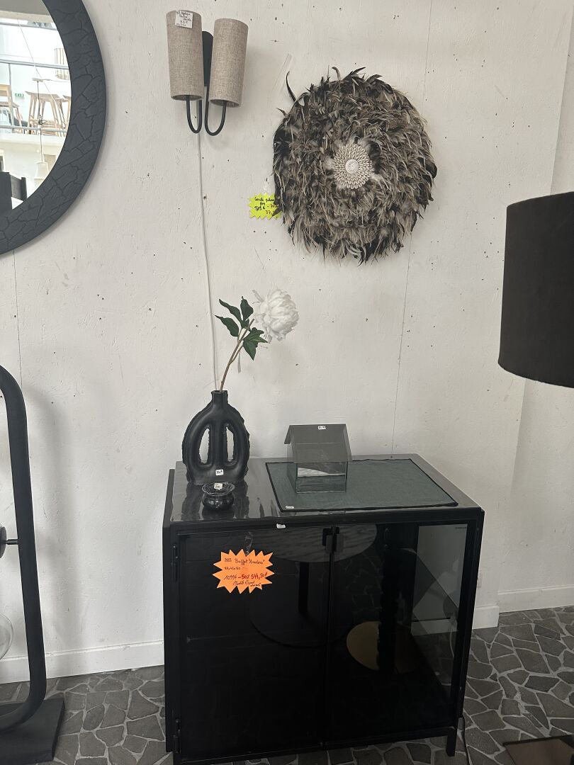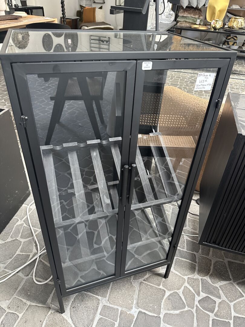 1 petit buffet vitrine ANDERS métal noir et vitres teintées noire 87X45X80cm (légers accros),...