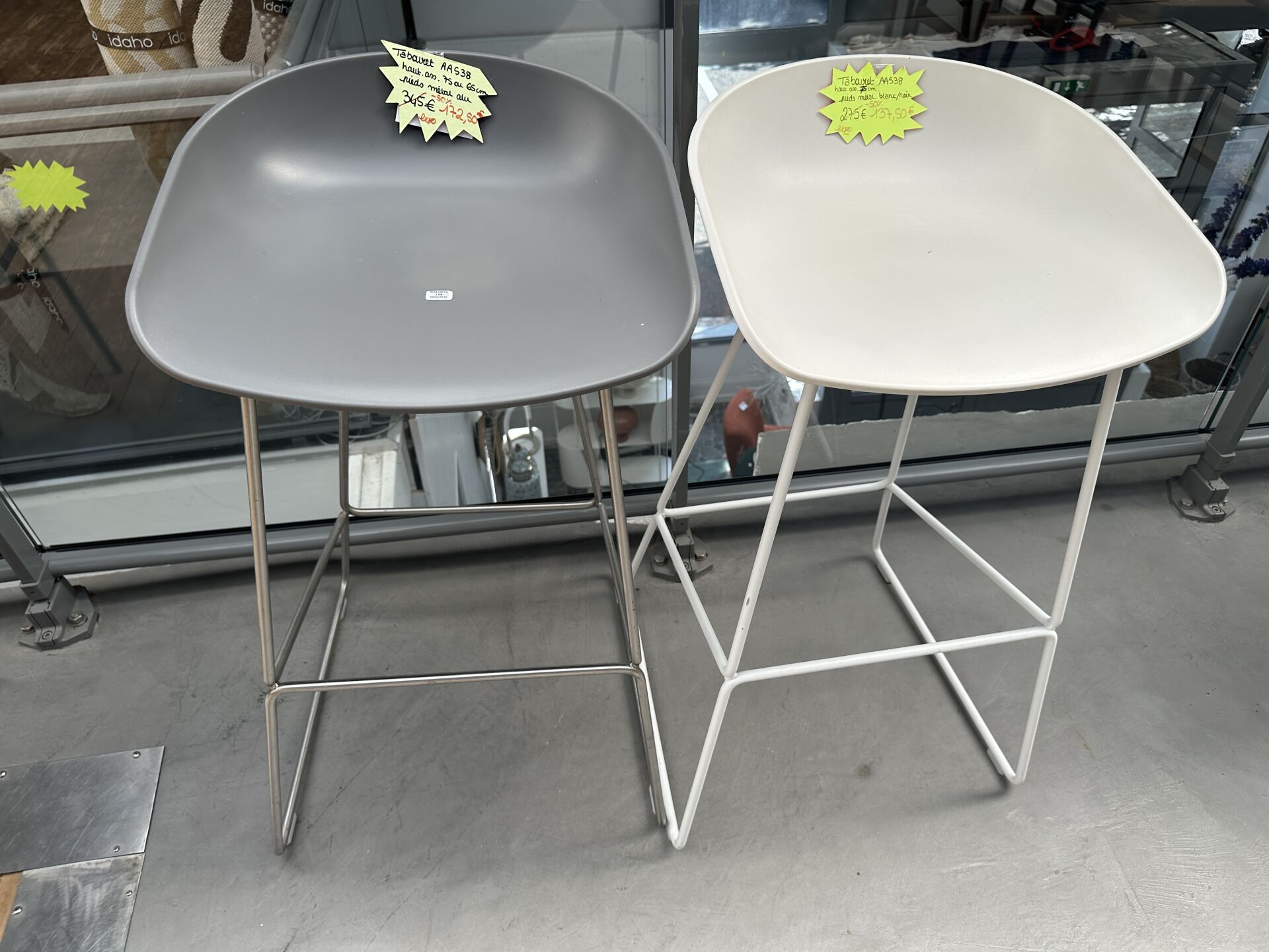 2 tabourets de bar coque PVC gris et blanc, pieds chromé ou blanc; Prix de vente magasin : 300...