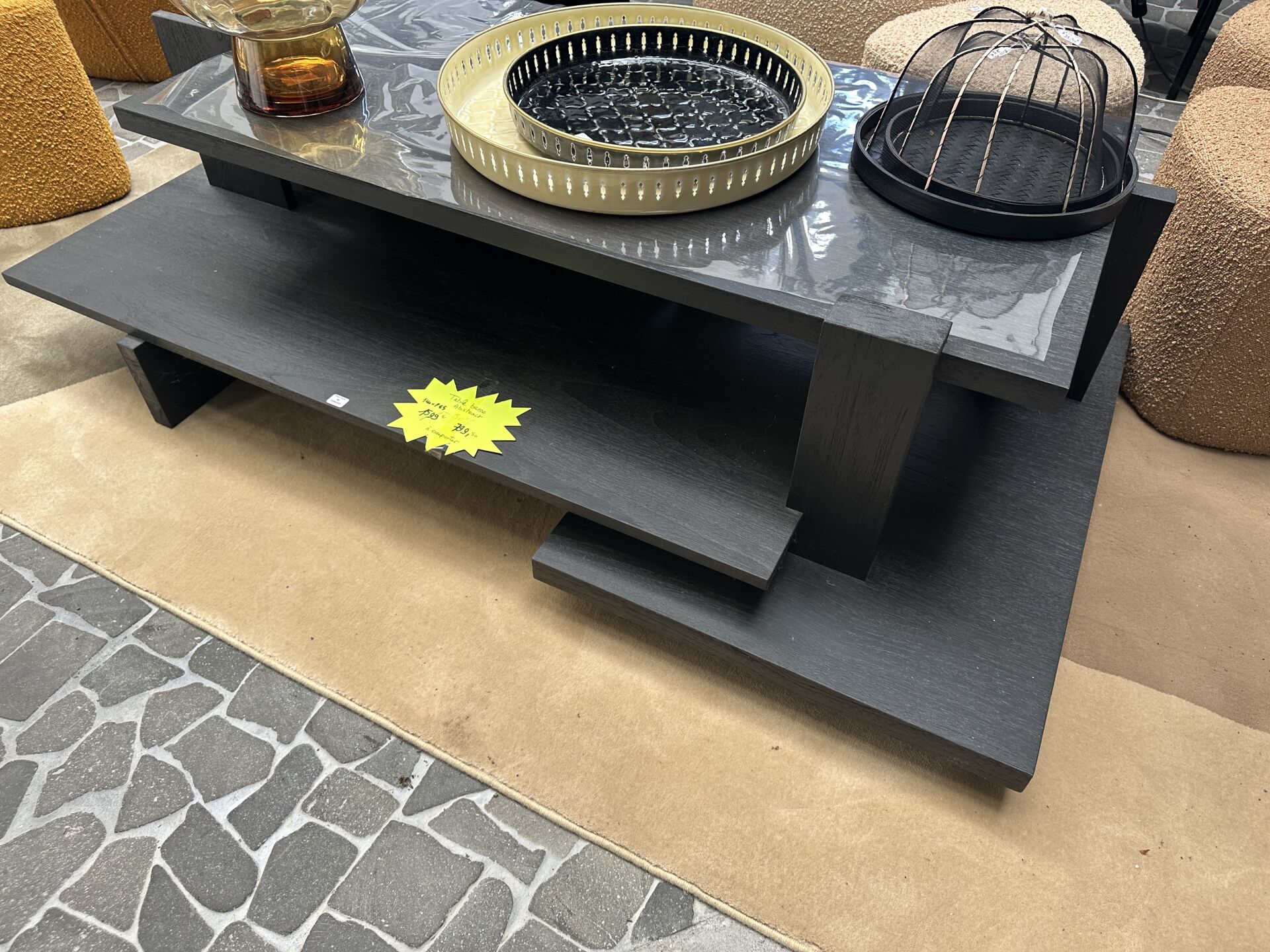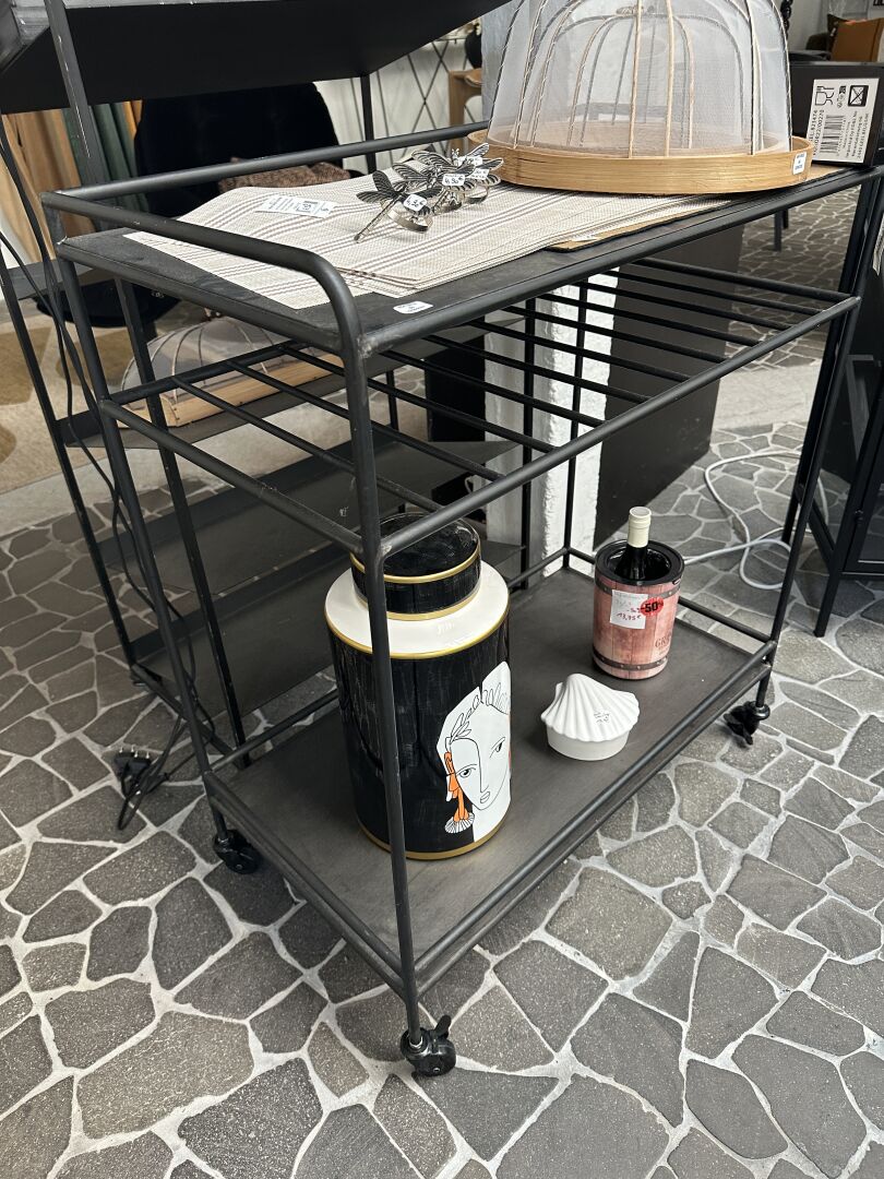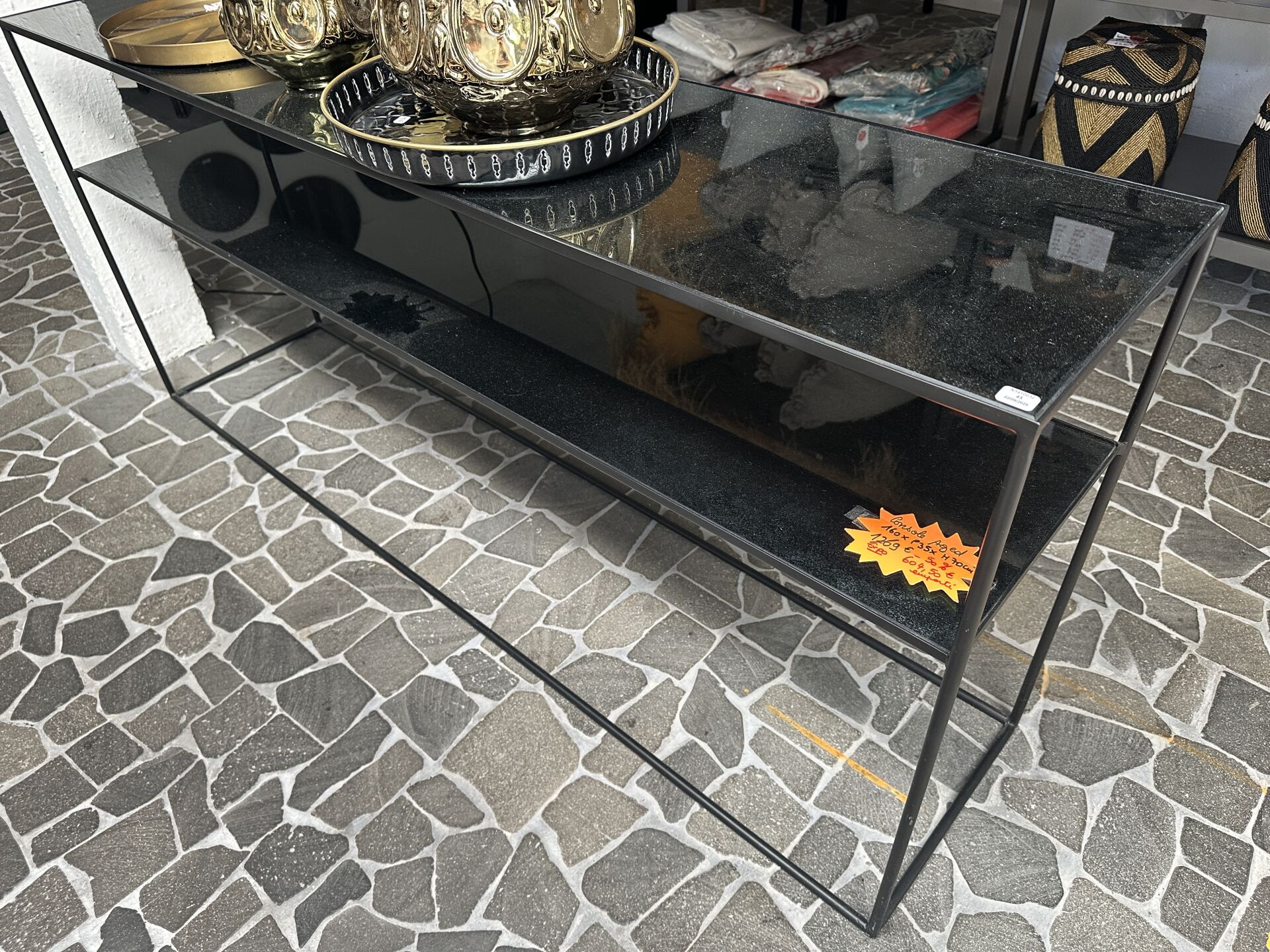 1 console AGED métal et bois noir, à 2 plateaux verre noir 160X35X70cm; Prix de vente magasin :...