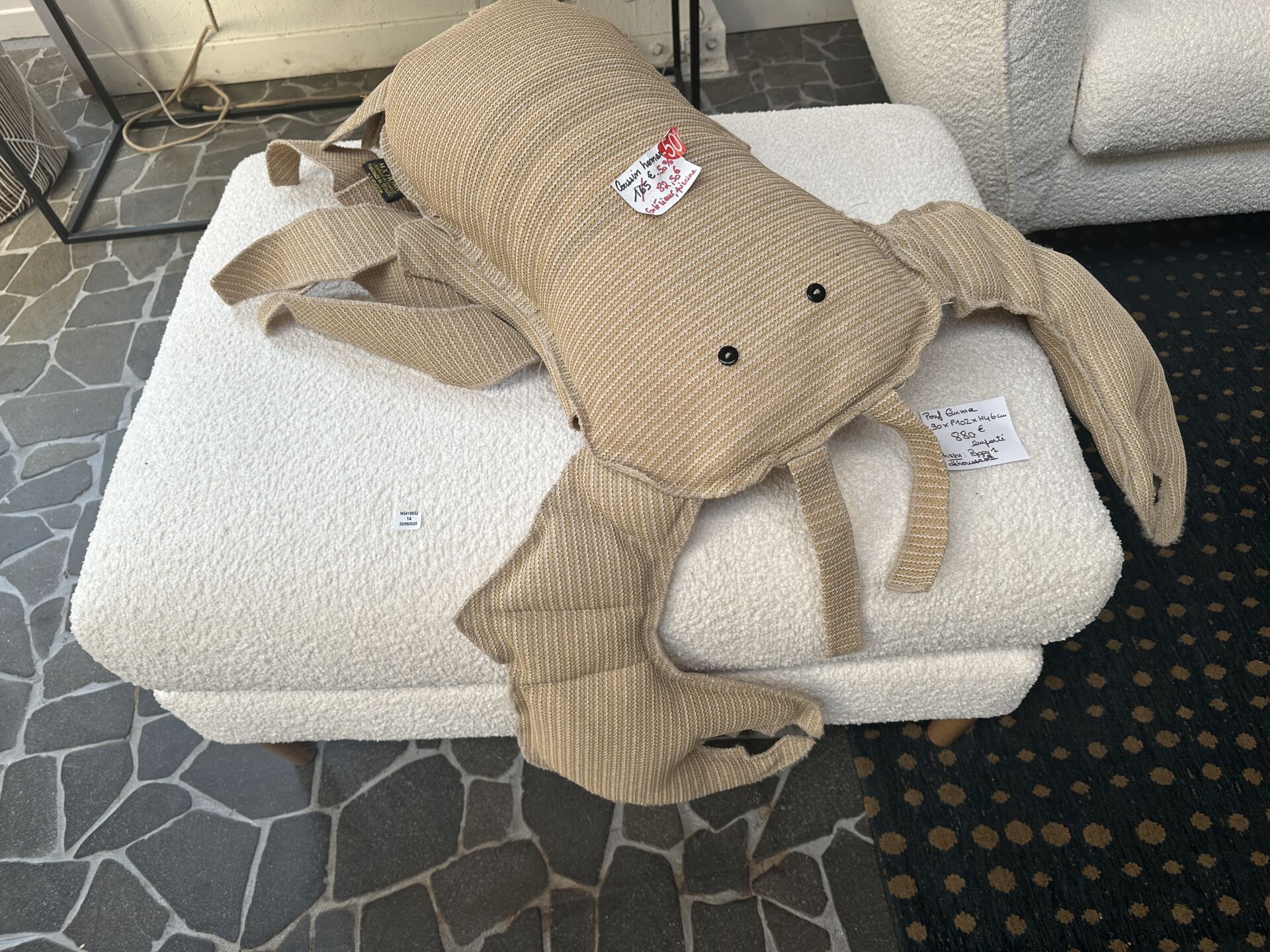 1 pouf EMMA tissus CAT2 bouclé blanc cassé déhoussable, 90X102X46cm, 1 coussin homard MXHOME...