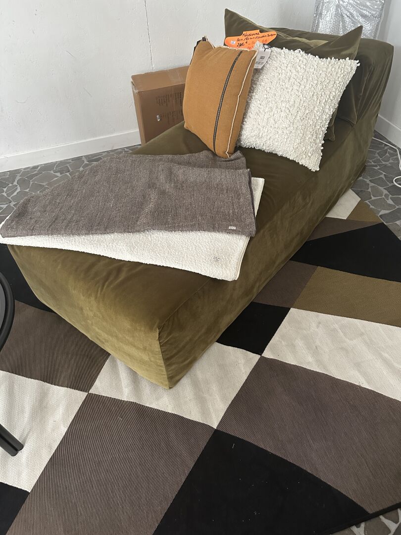 1 méridienne tissus effet velour vert écaille 80X180cm, 2 coussins BY BOO tissus lin terra...