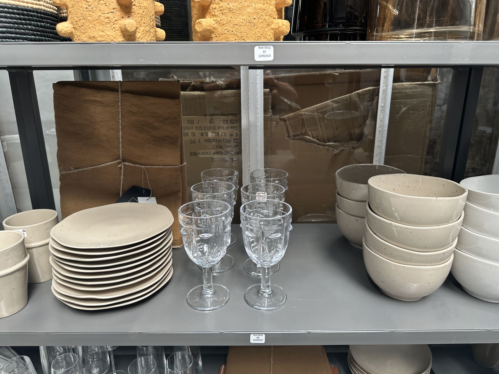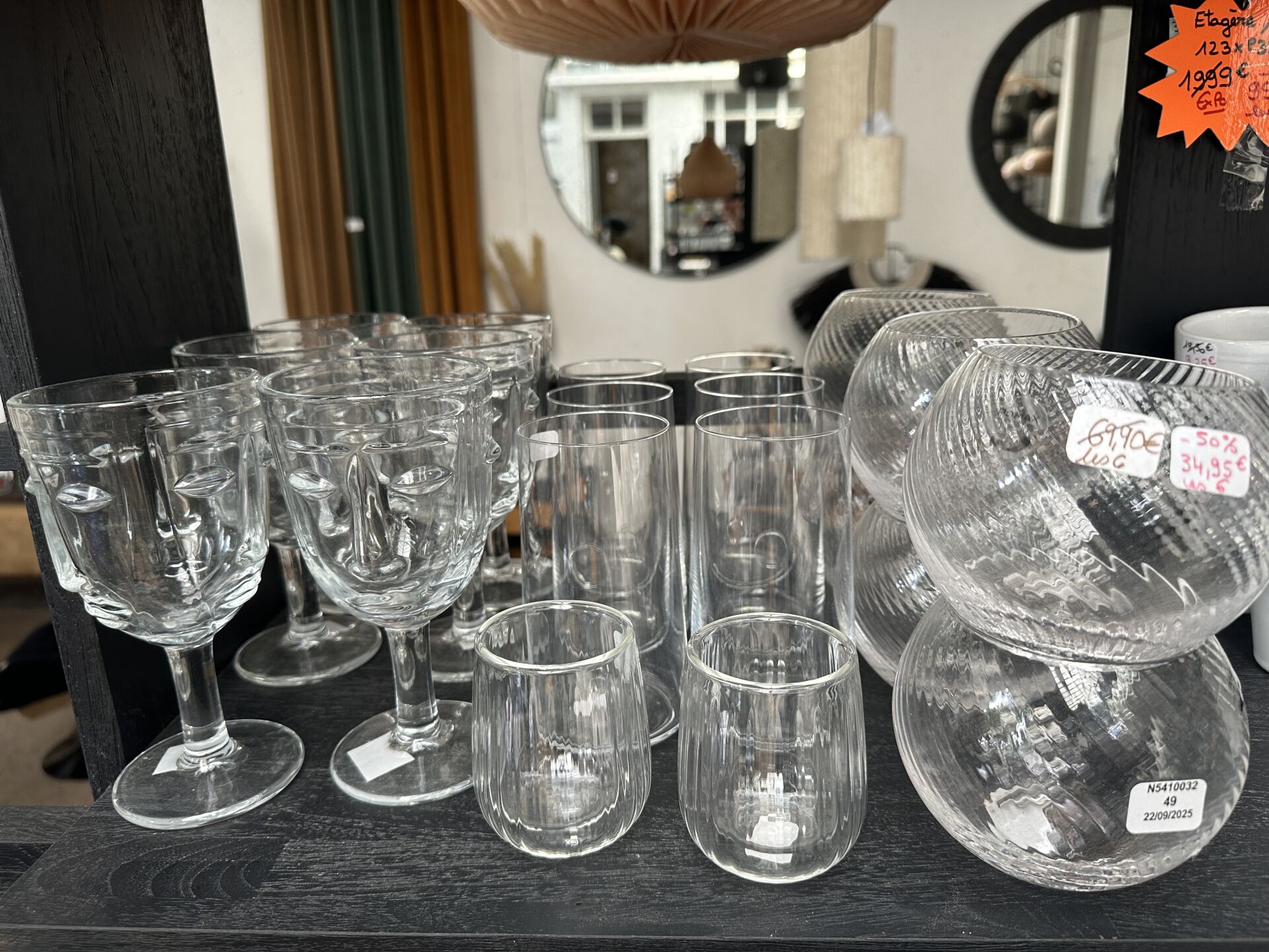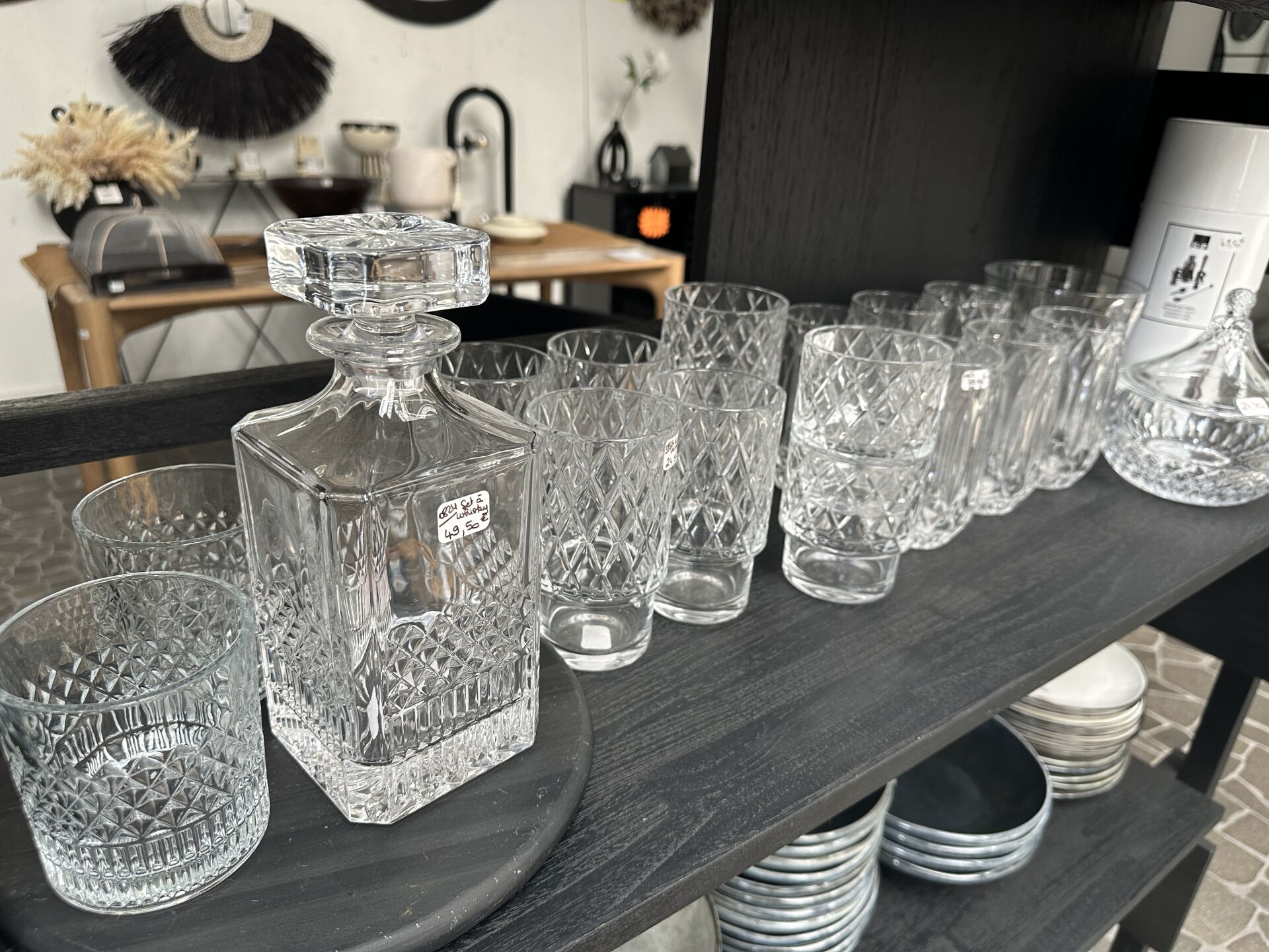 Dans une réserve, sur 1 module double face, ensemble de verrerie, sets à whisky, bols, shaker,...