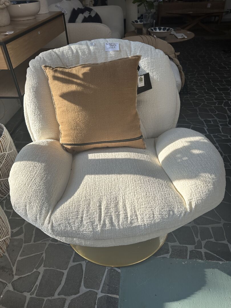 1 fauteuil tournant MEMENTO, tissus blanc cassé, base métal doré, 1 coussin tissus tabac en...