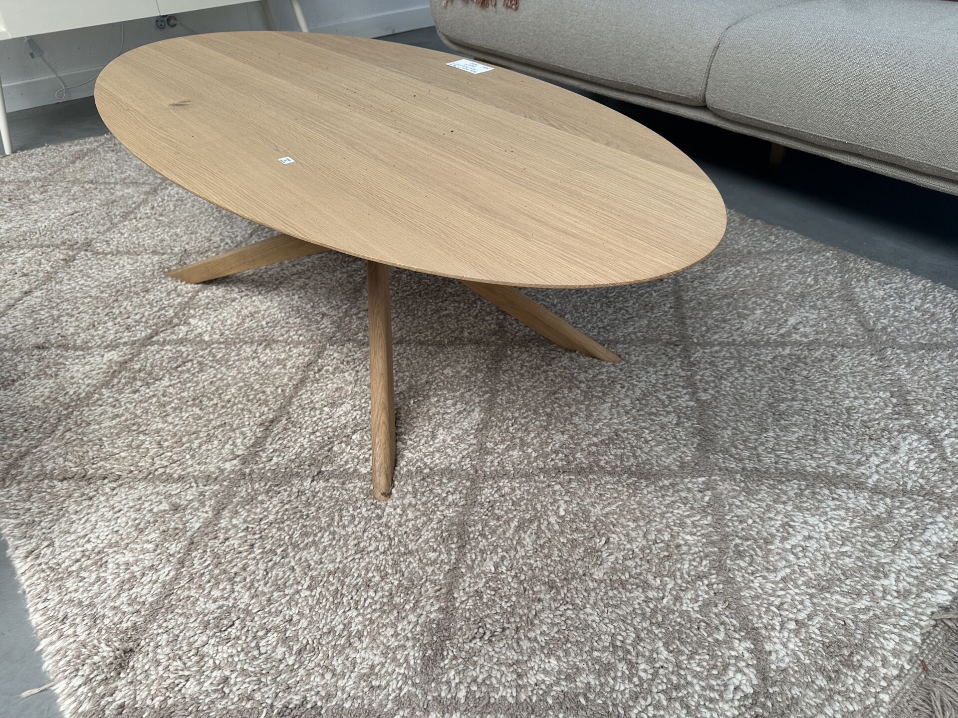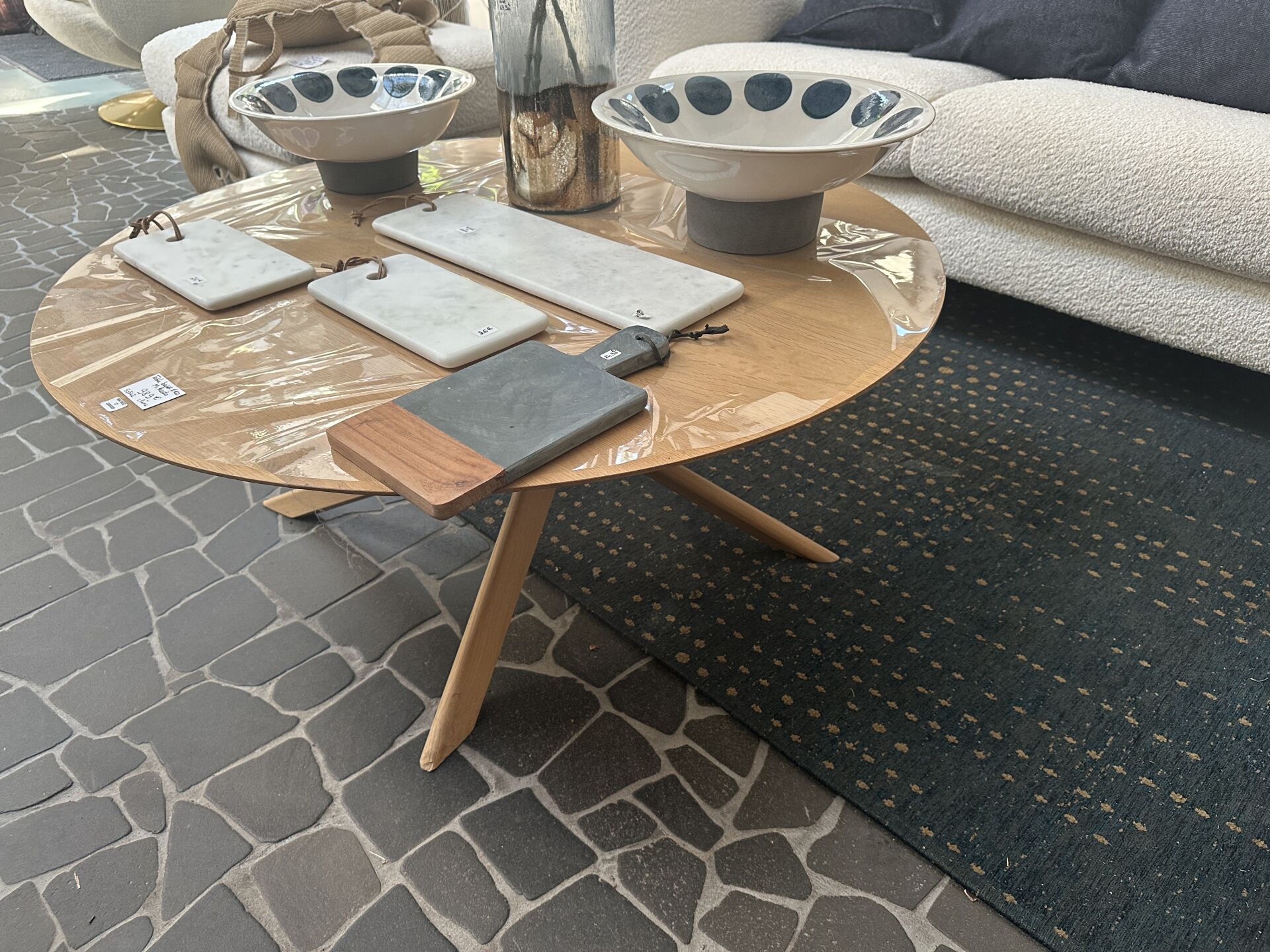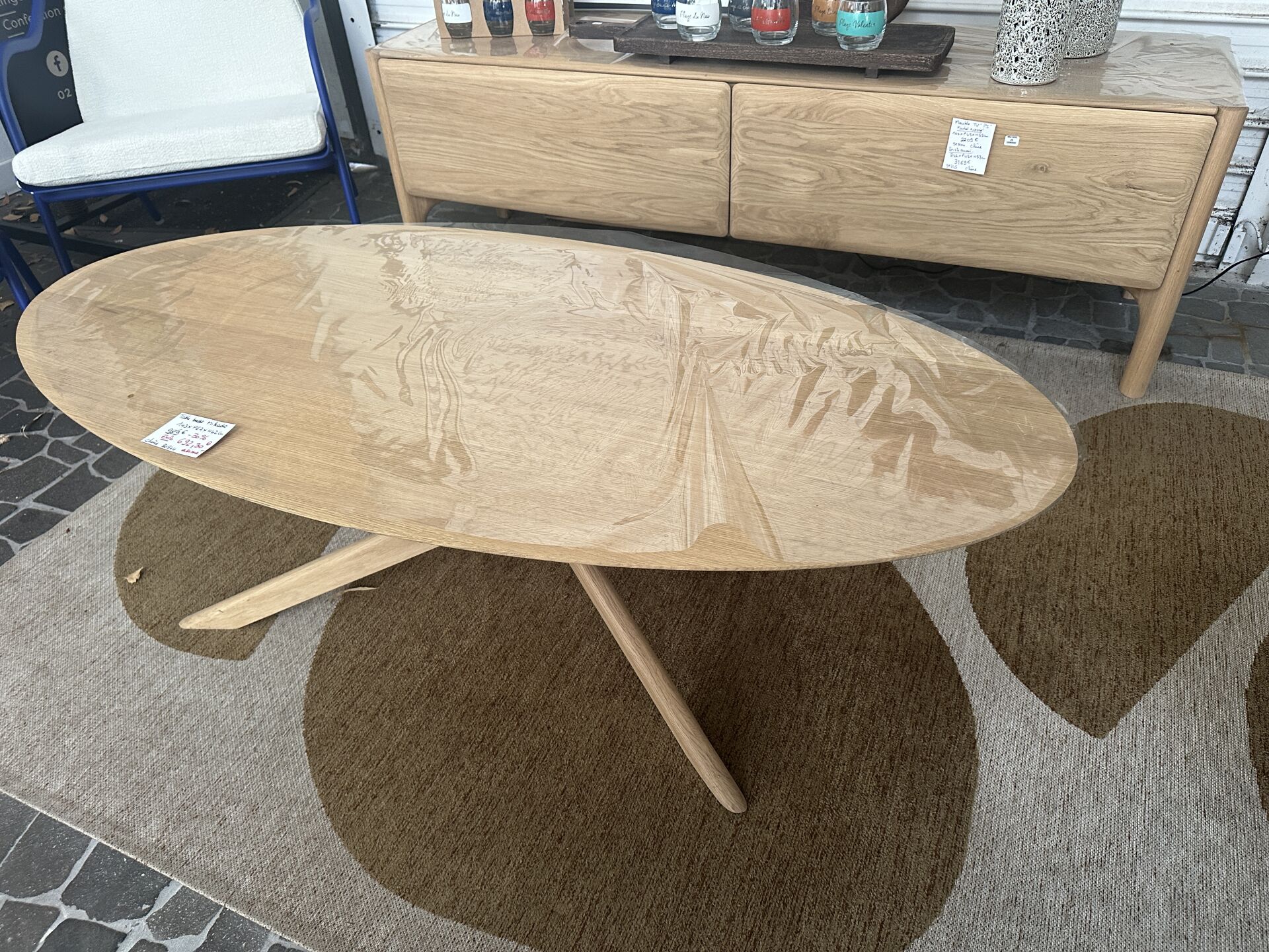 1 table basse MIKADO chêne 4 pieds entrelacé, diamètre 100cm, avec tapis tissus bleu océan et...