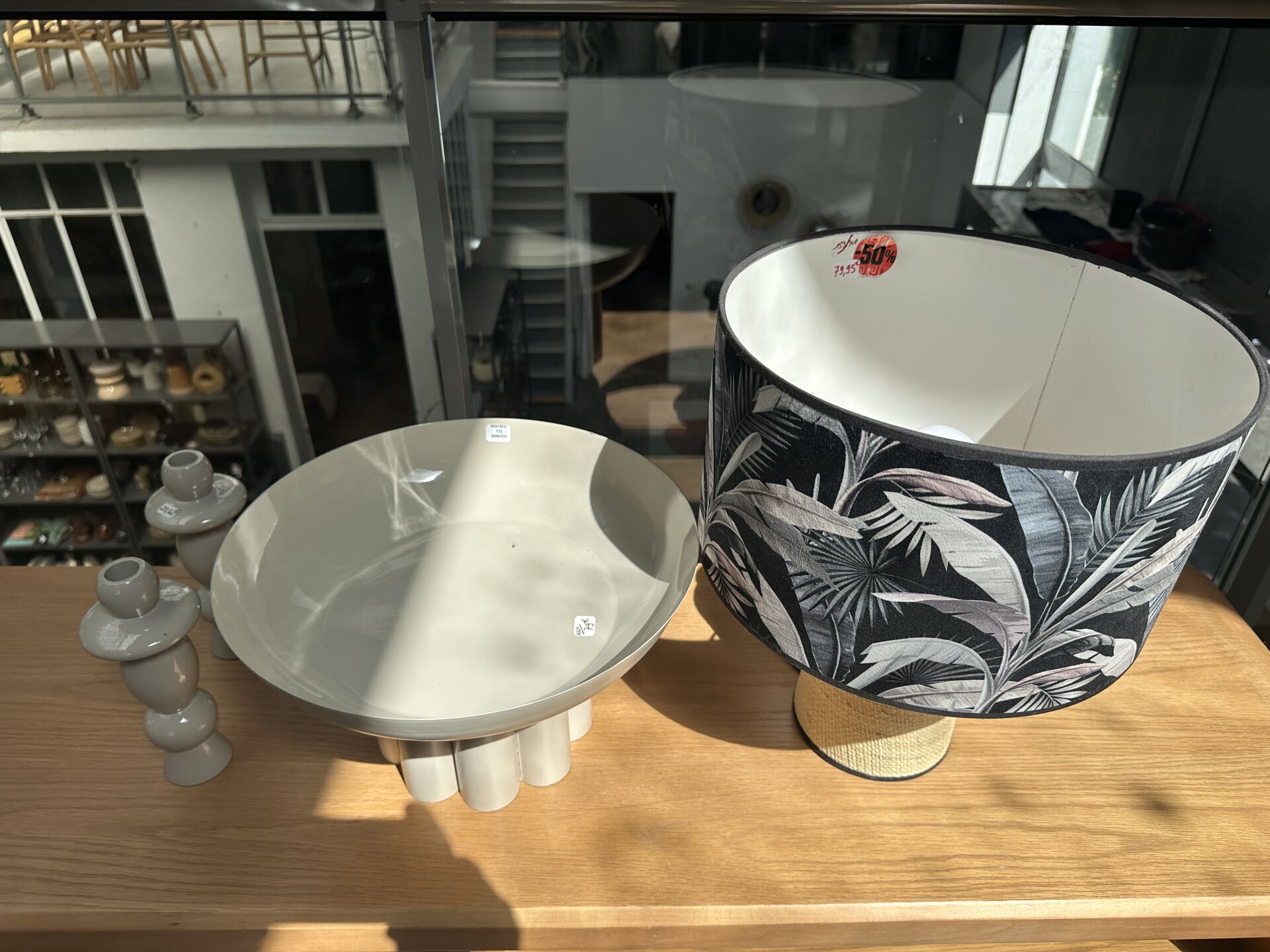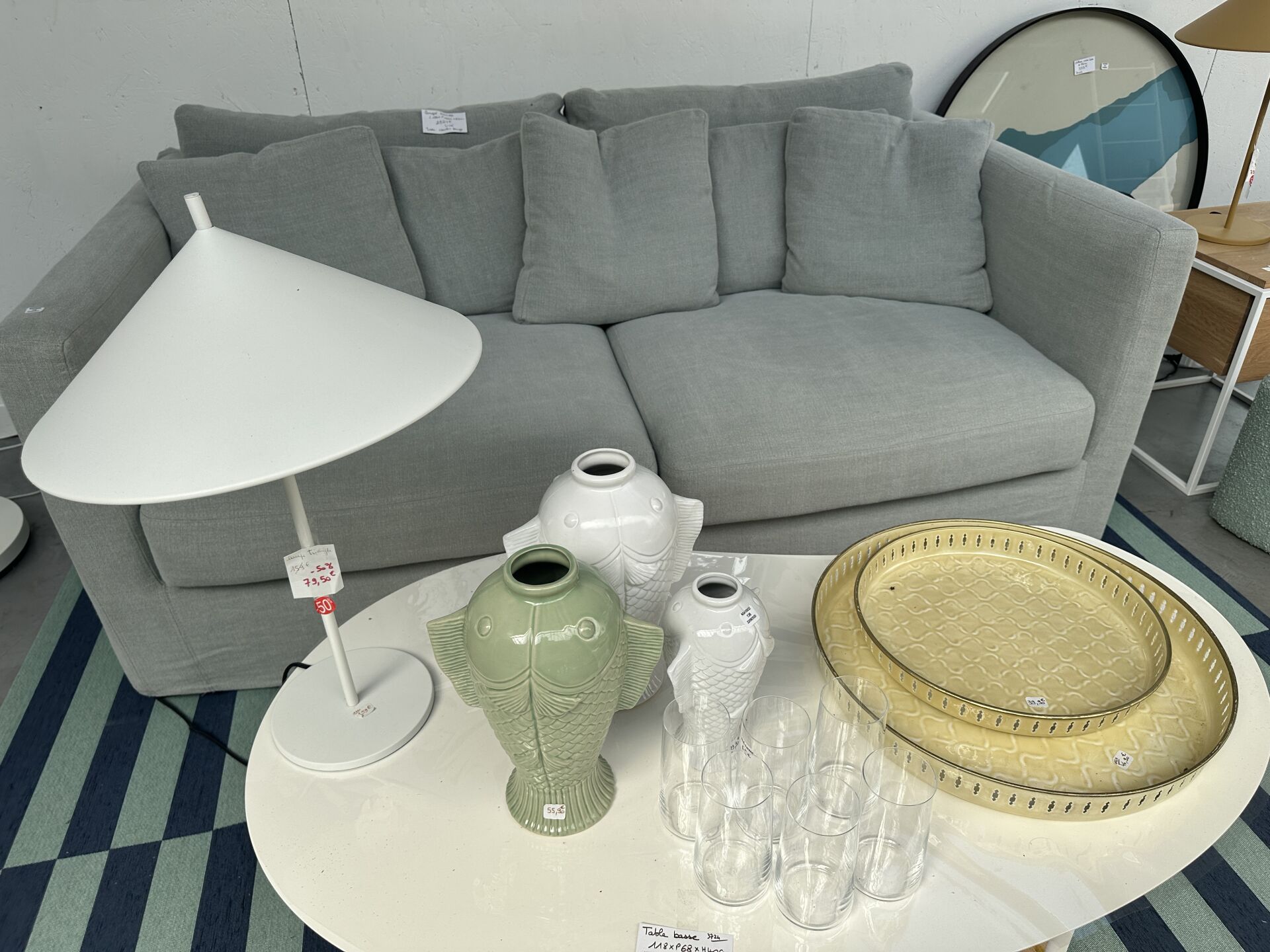 Dans une réserve, sur 1 module et au sol, ensemble de décoration dont, 4 lampes à poser, 4...