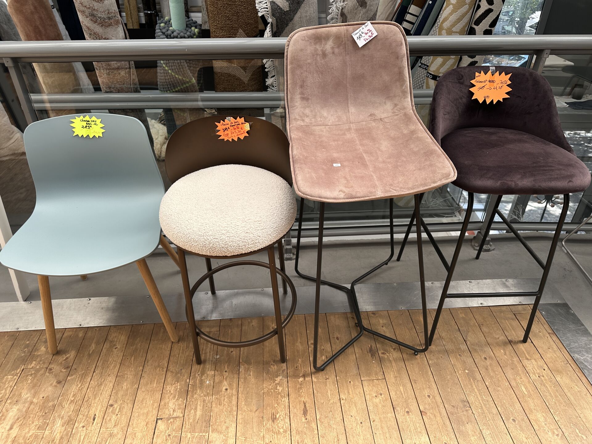 3 tabourets de bar: 1 velour rose, 1 AENO velour violet, 1 tissu blanc bouclé et bois. On y...