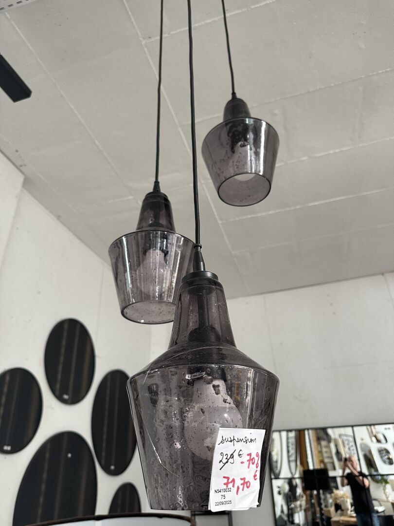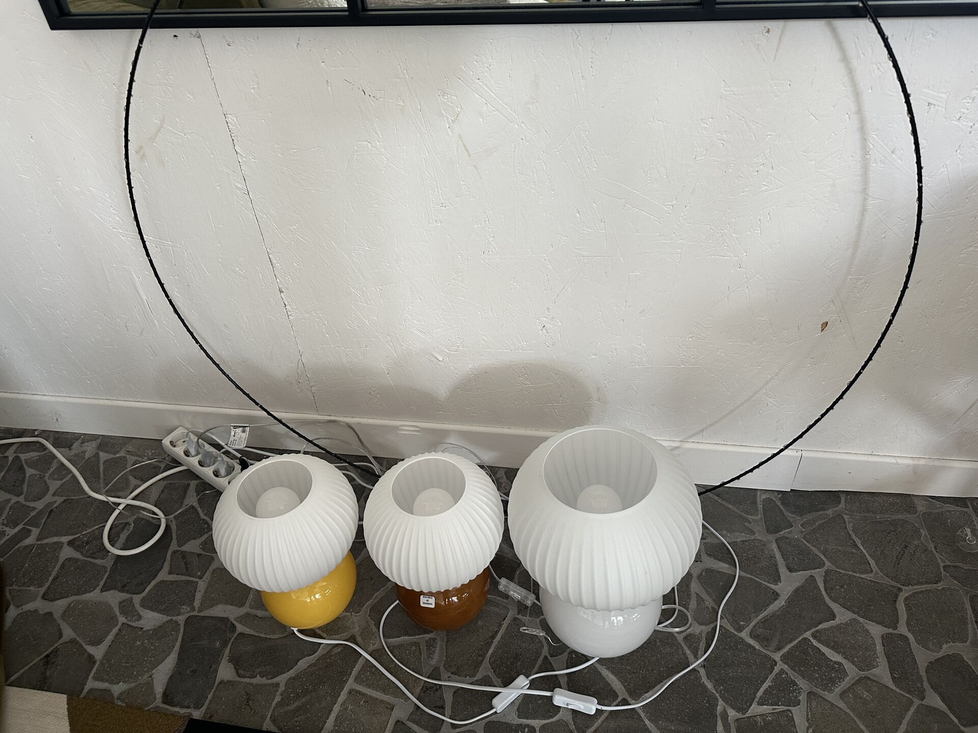 3 lampes boule bases verre blanc marron et jaune et 1 cercle lumineux diamètre 100cm; Prix de...