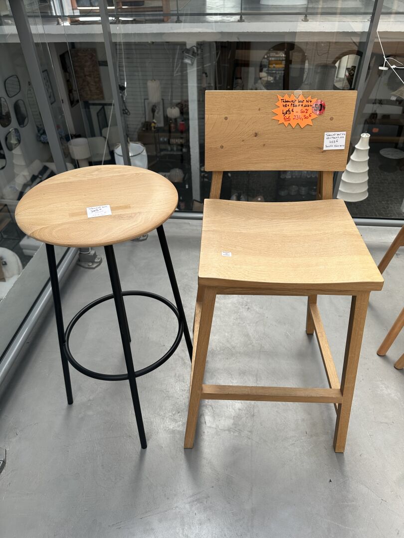 1 tabouret et 1 chaise de bar chêne vernis; Prix de vente magasin : 640 €