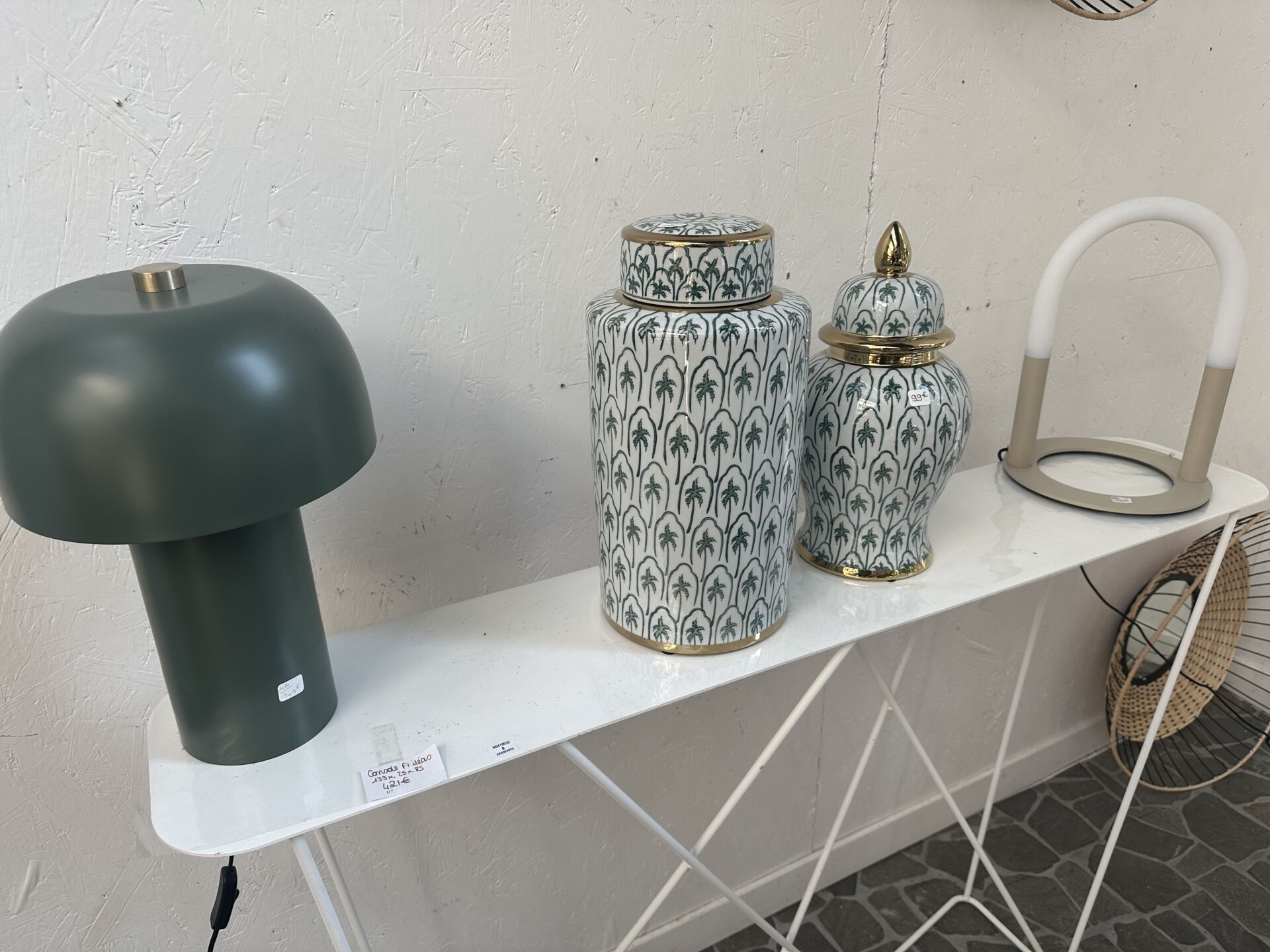 1 lampe champignon NOMADE vert petit pois, 1 lampe ZUIVER modèle 5200167, 2 vases FANCY fond...