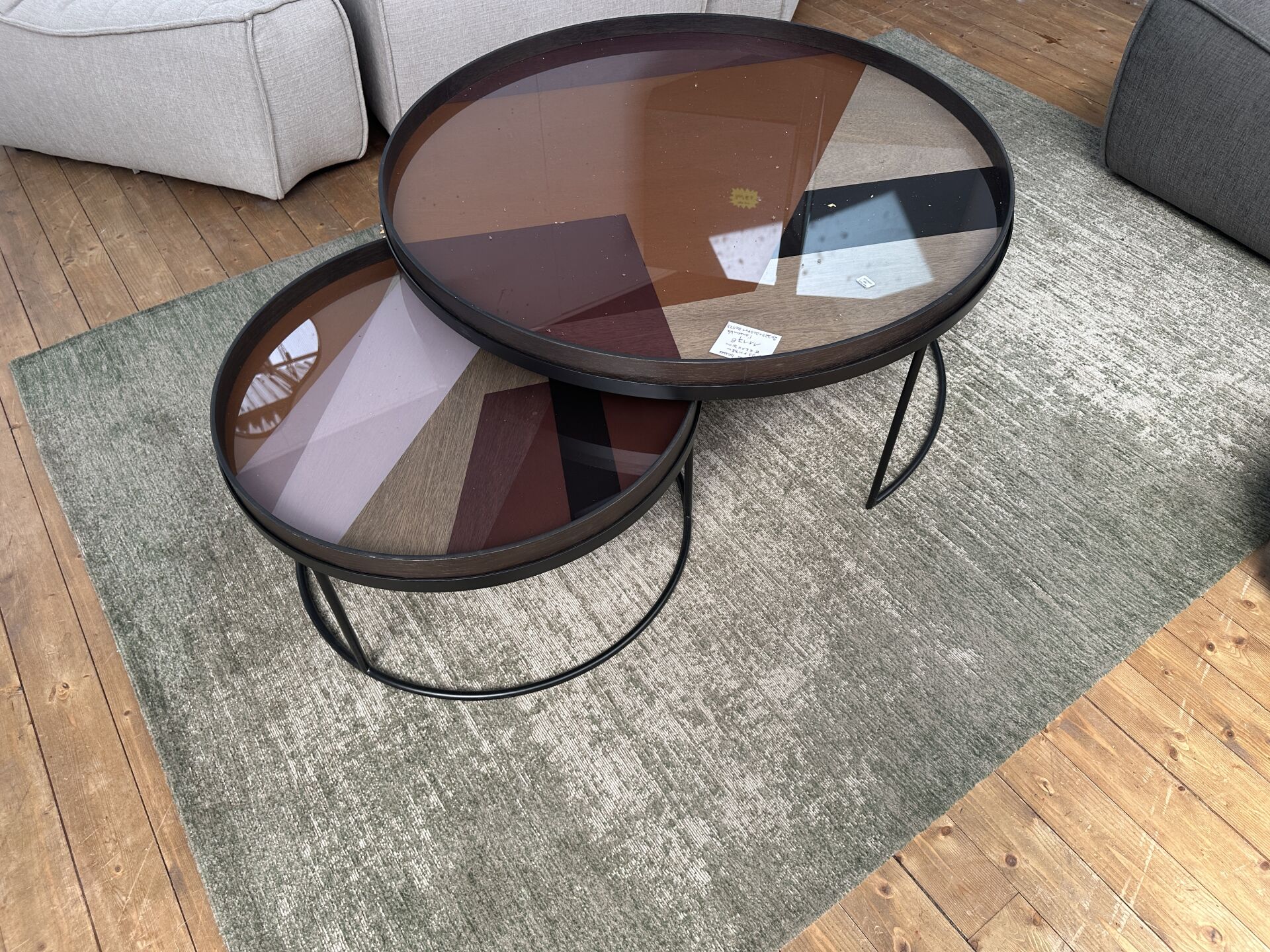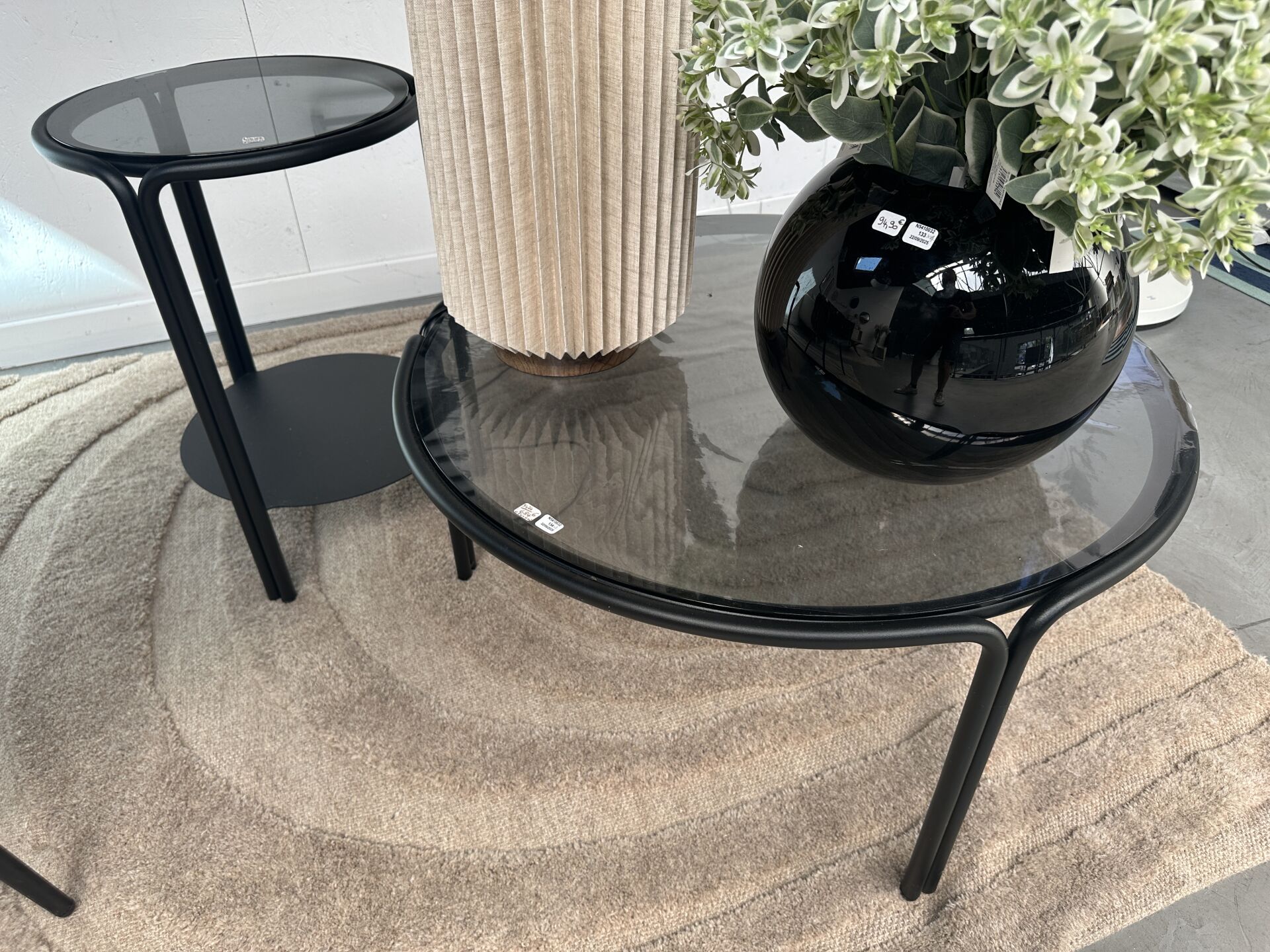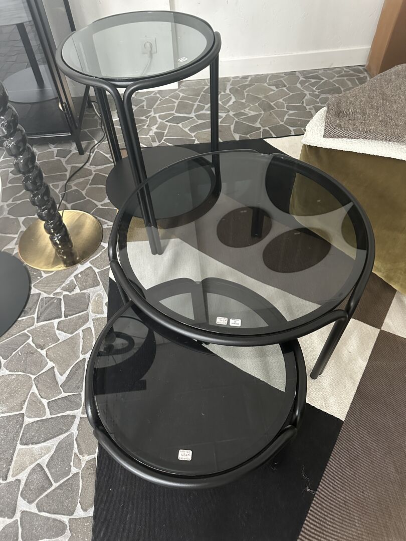 2 tables basse LEA métal noir, plateau verre fumé gris diamètre 44 et 64cm et 1 console...