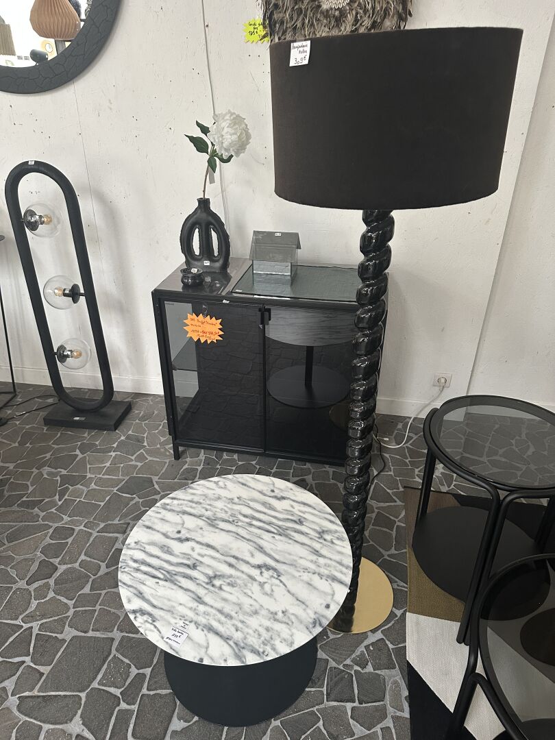 1 table basse pied métal noir, plateau imitation marbre blanc diamètre 60cm , 1 lampadaire...
